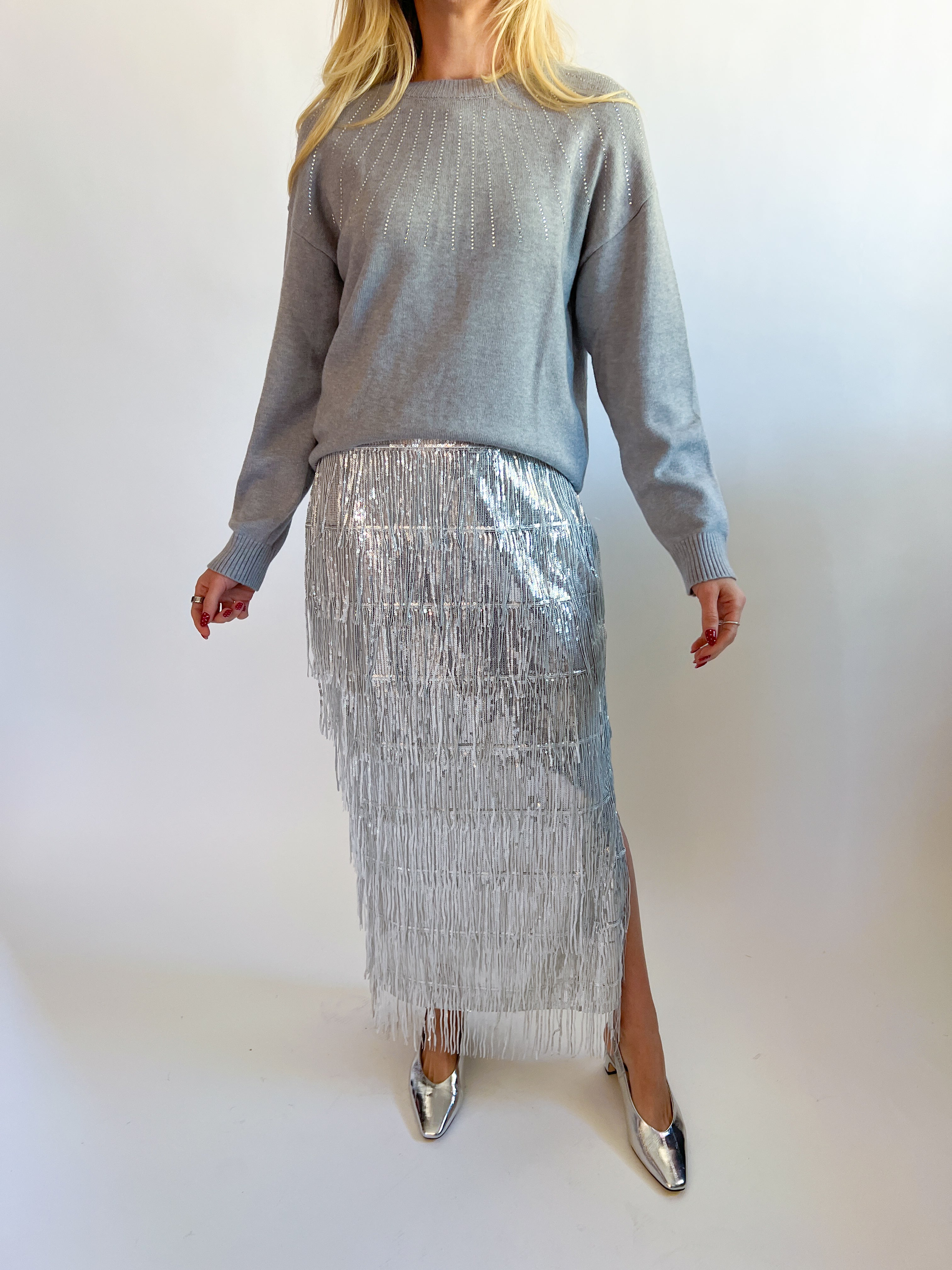 Prepare to turn heads in the Estery Sequin Maxi Skirt! This show-stopping piece features shimmering sequins that catch the light with every step, creating an eye-catching sparkle that's perfect for nights out or special occasions. The flowing maxi silhouette offers elegant movement and comfort, while the sequin detailing adds that glamorous touch you've been craving. Whether you're hitting the dance floor or making a grand entrance, this skirt delivers serious style and confidence. Dress it up with heels and a sleek top, or keep it fun and casual—either way, you'll be absolutely radiant!