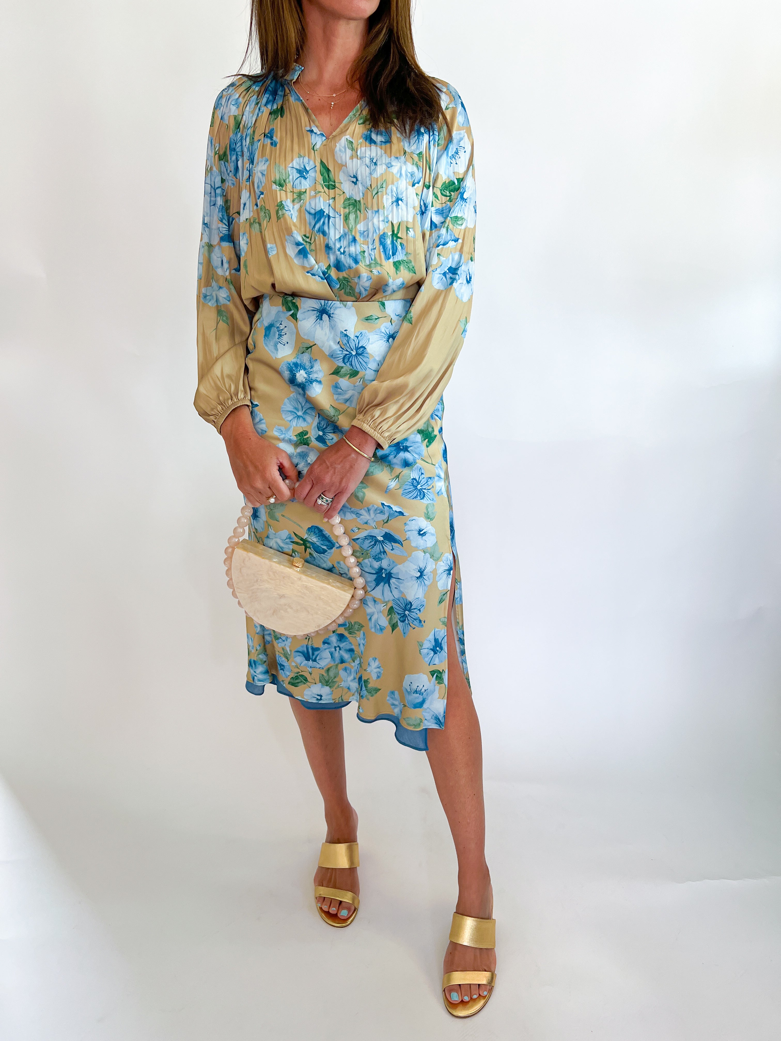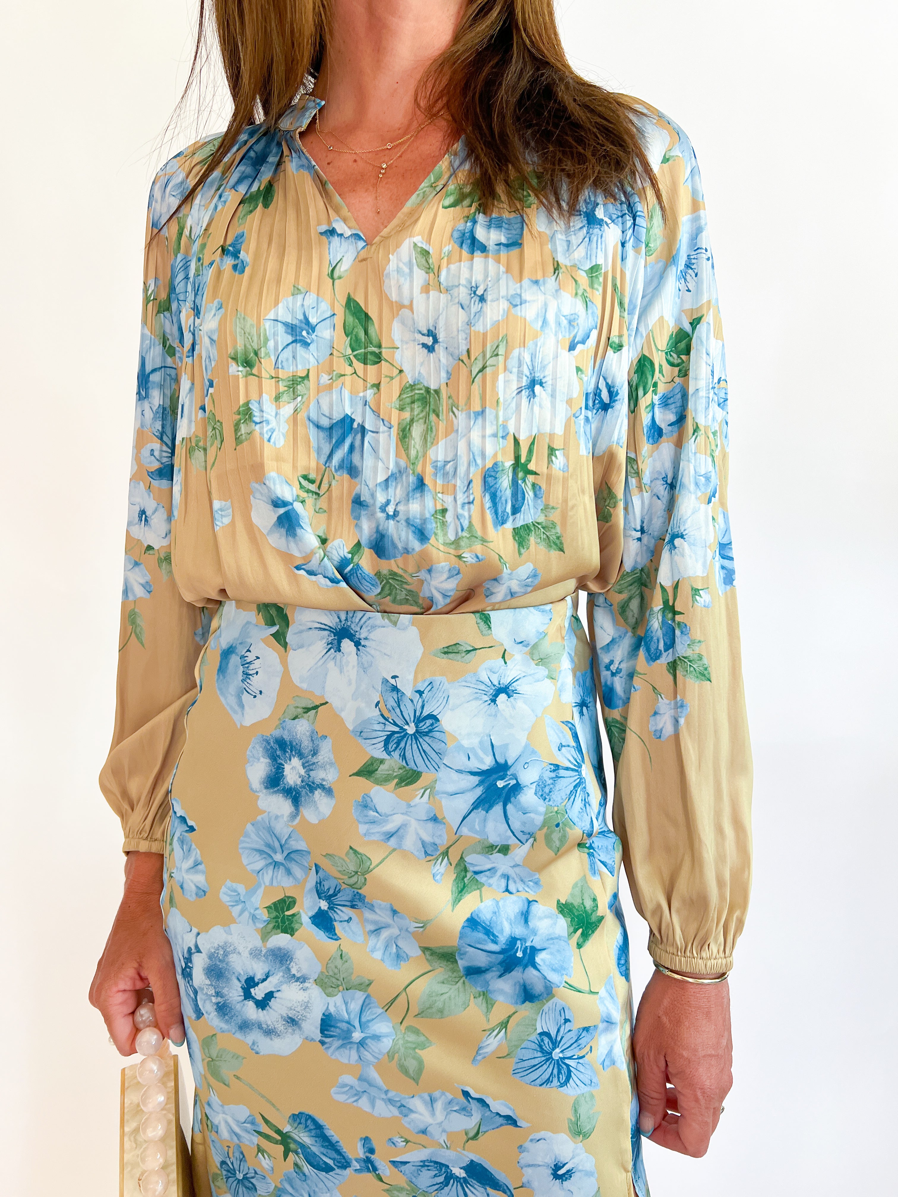 Elevate your wardrobe with this Blue Floral Satin Top featuring a flattering V neckline and elegant long sleeves. The delicate pleated design adds texture and movement, while the smooth satin fabric offers a luxurious feel. Perfect for dressing up or adding a touch of sophistication to your everyday look!