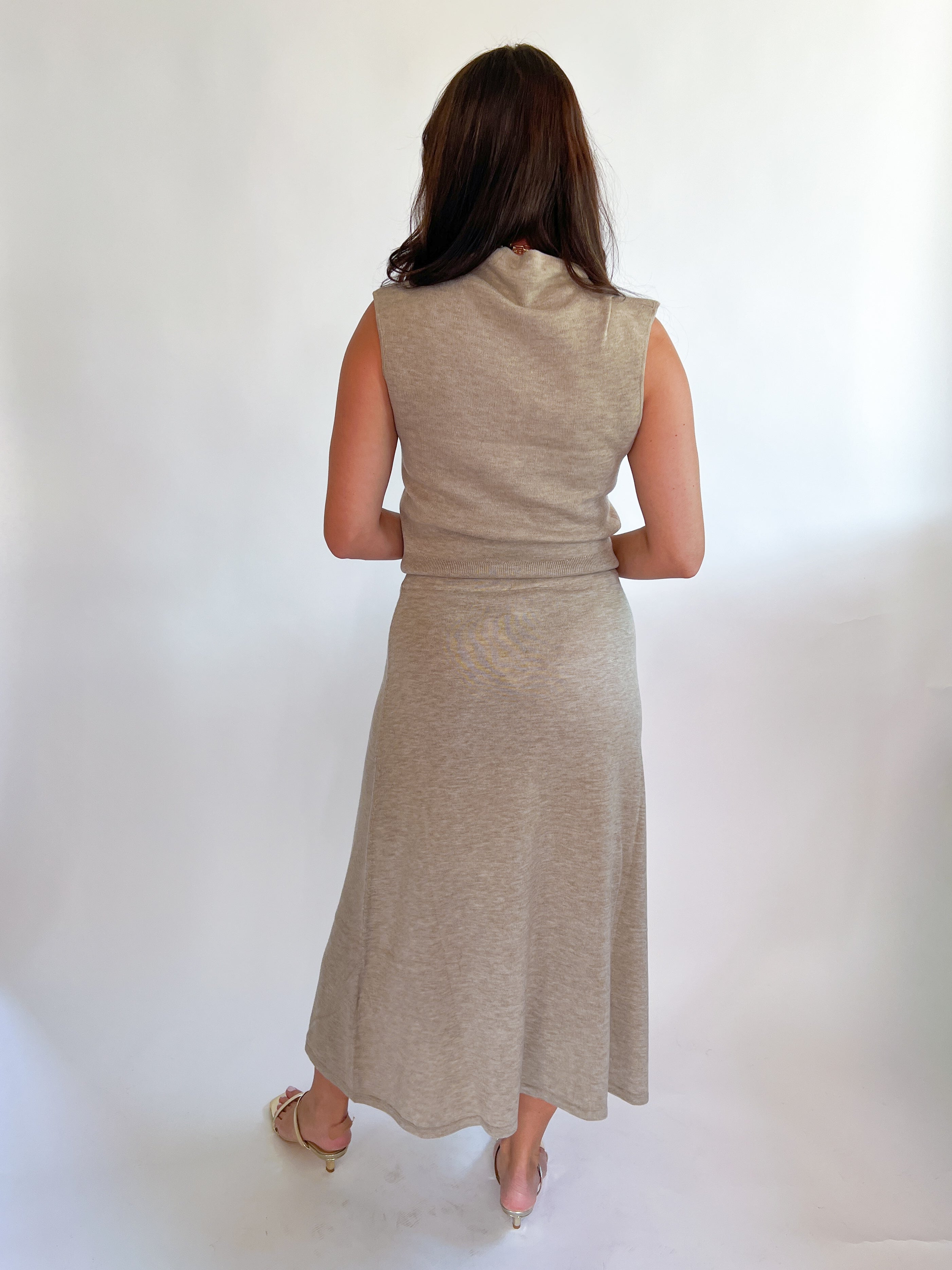 The Deora Sweater Skirt is a high-waisted, midi-length piece made from cozy knit fabric. Designed to perfectly complement the matching top, this skirt offers a stylish and comfortable outfit that's both versatile and chic.
