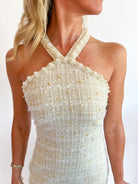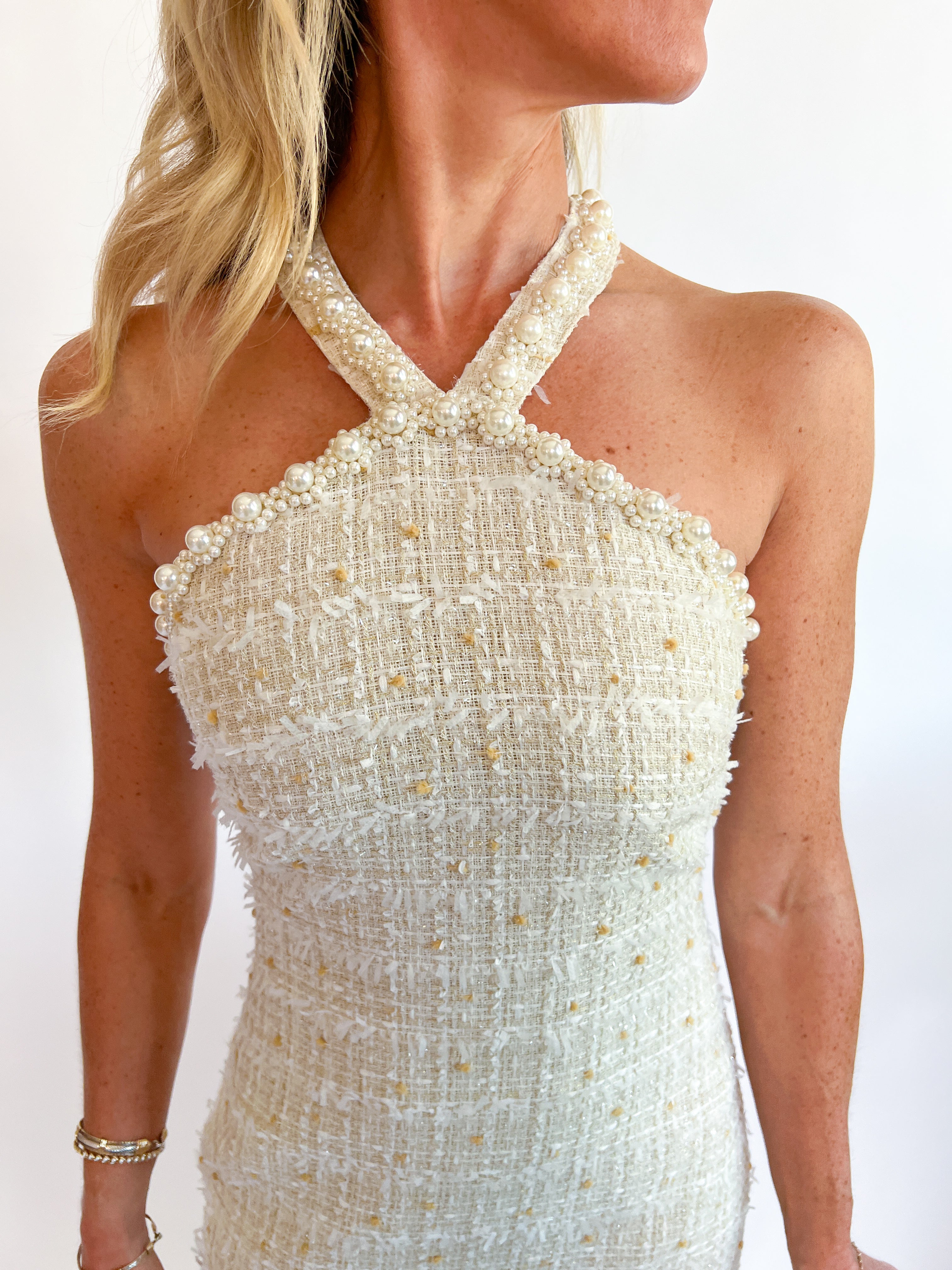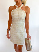 Step into timeless elegance with the Juniper Pearl Trimmed Tweed Dress. This sophisticated dress features delicate pearl accents along the trim, adding a touch of sparkle to the classic tweed fabric. Perfect for both work and special occasions, it blends polished style with charming details to keep you looking effortlessly chic and confident.