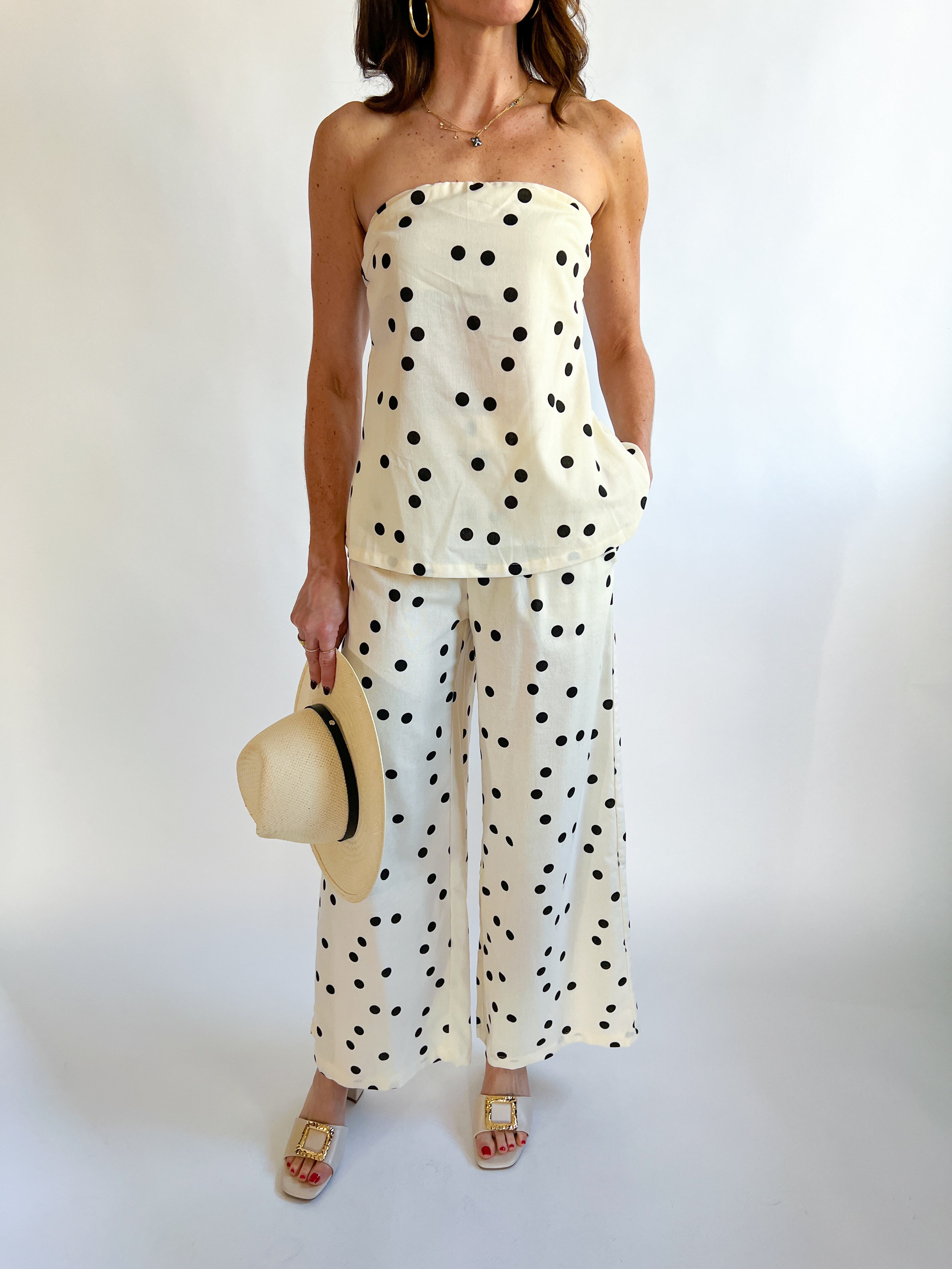 Effortless elegance meets playful style with this charming polka dot linen strapless set. Perfect for warm weather adventures, the breathable linen fabric keeps you cool and comfortable while the classic polka dot pattern adds a touch of vintage-inspired flair. The strapless design offers versatility—dress it up for a night out or keep it casual for daytime exploring. Whether you're strolling through the French Quarter or relaxing by the pool, this set is your go-to for looking put-together without the fuss. A timeless piece that transitions seamlessly from season to season.