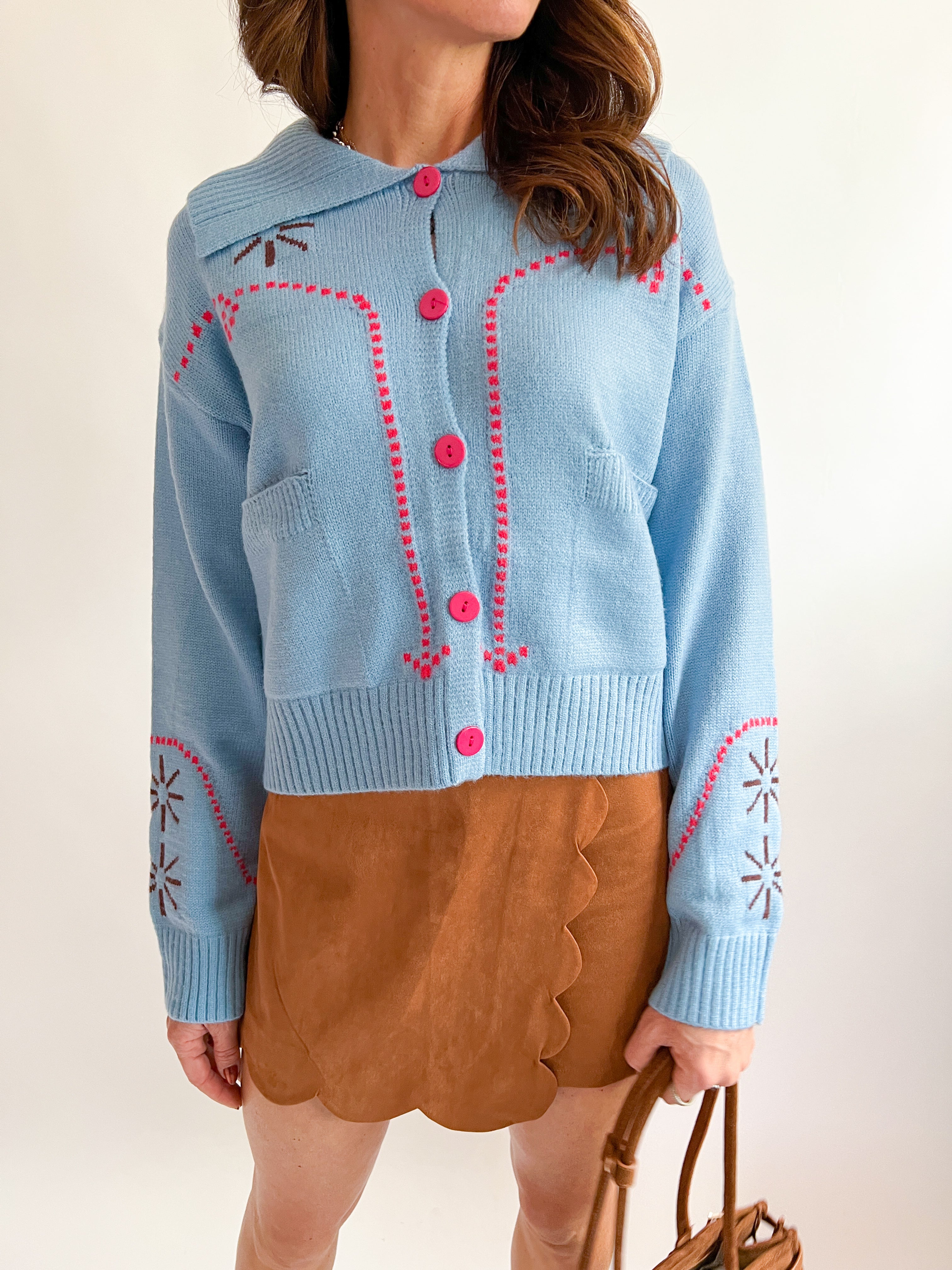 Saddle up for style with this stunning Western Motif Sweater Cardigan! Featuring classic western-inspired details, this cozy layer brings authentic charm to any outfit. Perfect for layering over your favorite tees or dresses, it combines comfort with that coveted cowboy aesthetic. Whether you're heading to a rodeo, a casual night out, or just want to add some flair to your everyday look, this cardigan delivers warmth and personality in one fabulous piece. Embrace your inner cowgirl and make this versatile essential yours today!