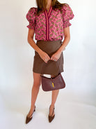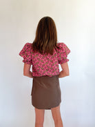 This charming short puff sleeve top showcases an abstract pattern with smocked cuffs and a vibrant multicolor V-neck accented by a smocked high neck band. Crafted from lightweight woven fabric, it’s unlined and non-sheer, perfect for adding a splash of color in wine tones to your wardrobe.