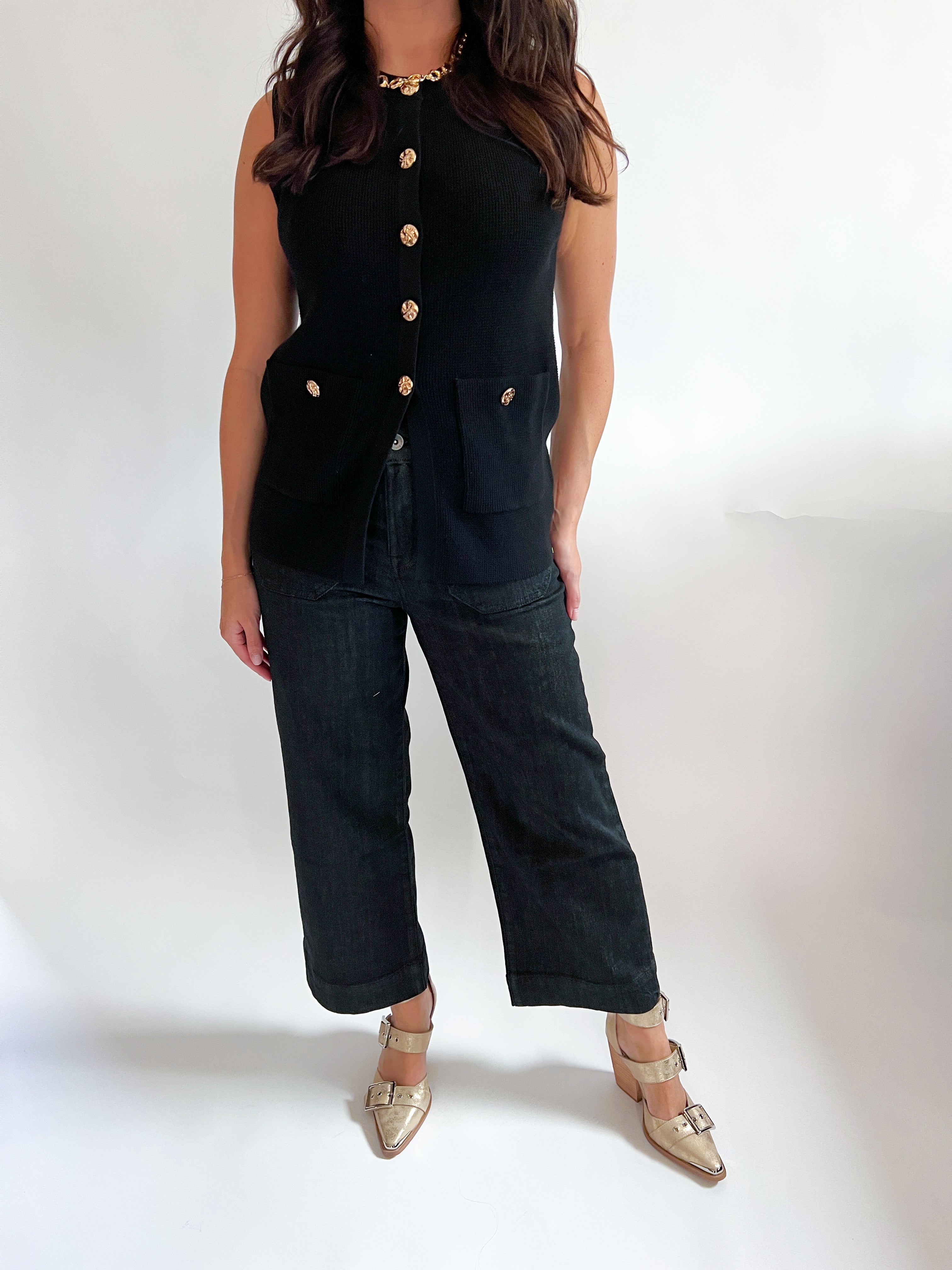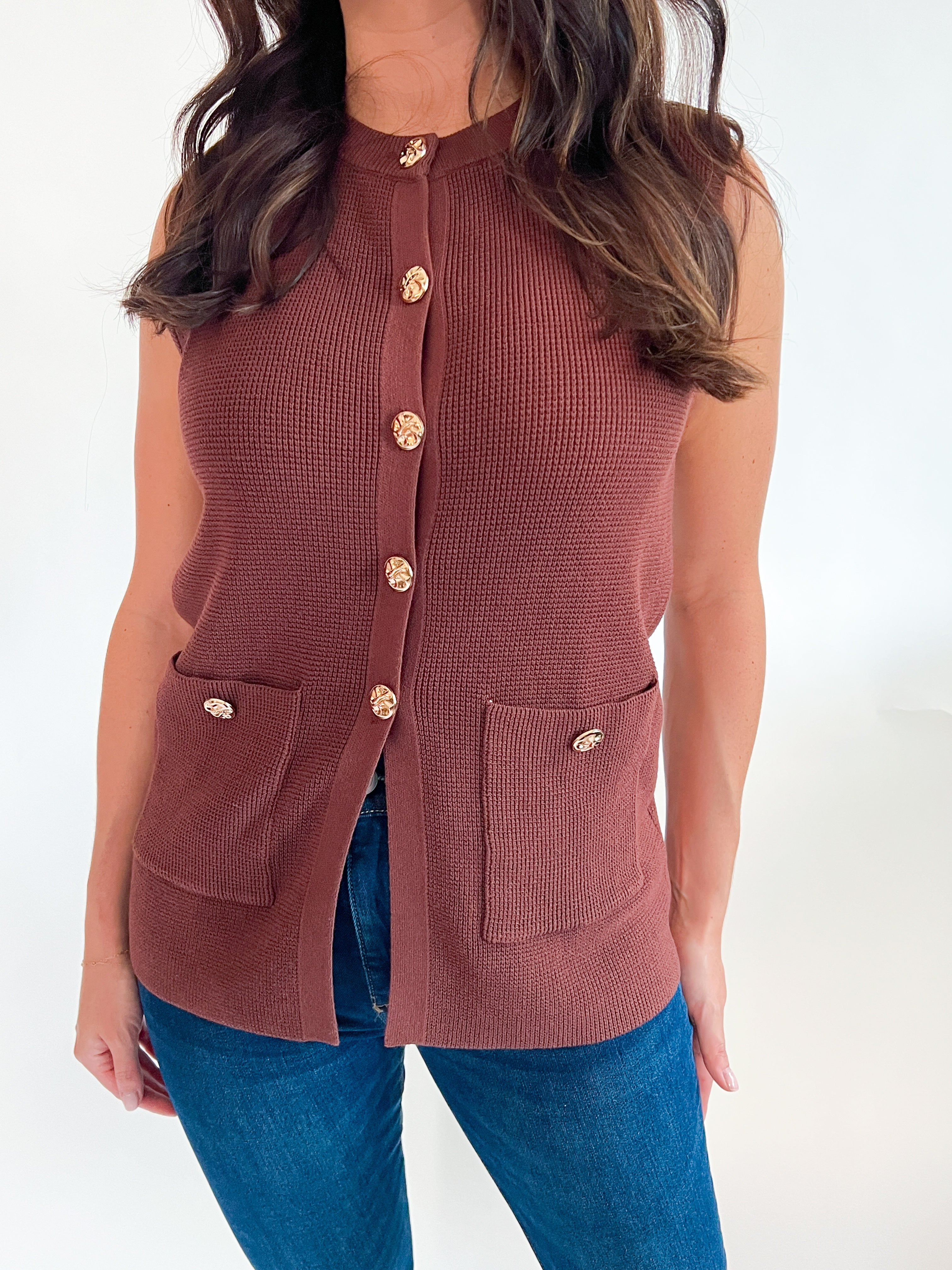 Add a touch of elegance to your wardrobe with our Lori Gold Button Up Vest! This stylish sleeveless piece features a flattering crew neck and dazzling gold button front closure that catches the light beautifully. Two convenient front pockets with matching buttons add both function and flair! Crafted from soft, comfortable knit fabric and designed without lining for breathable wear. Get ready to turn heads and receive compliments wherever you go!