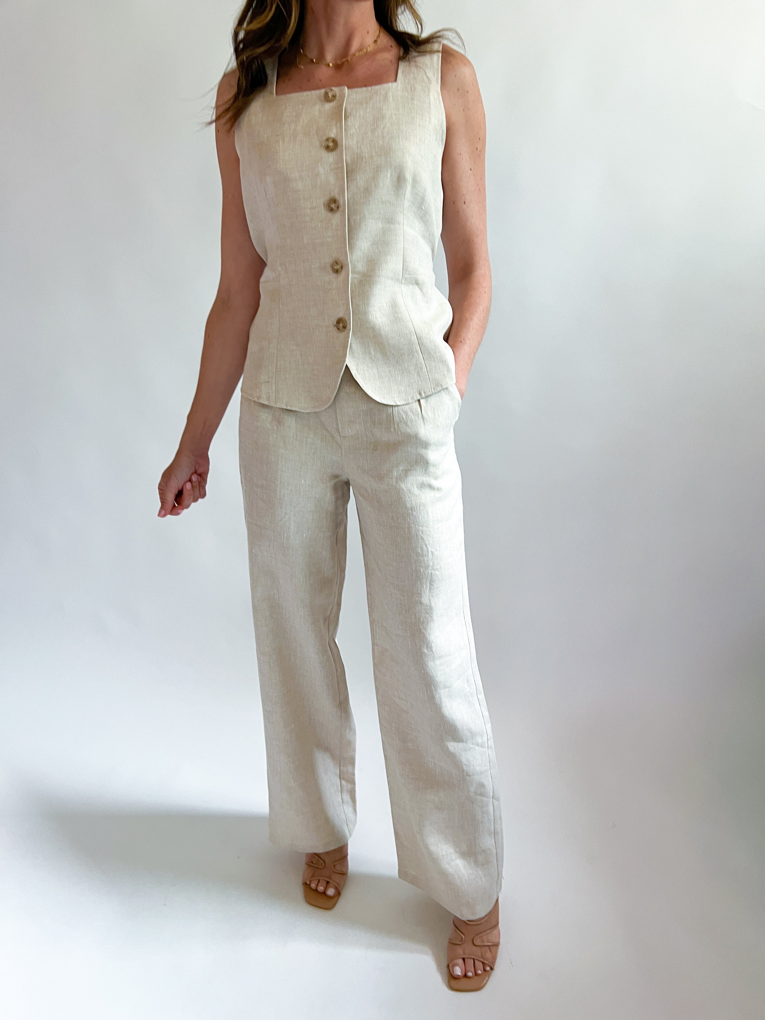 The Outsmart Square Neck Vest is stylish and versatile with its square neck and button front closure. Made from linen, this vest offers a relaxed fit for all-day comfort and a sleek look. Upgrade your wardrobe with this must-have piece.