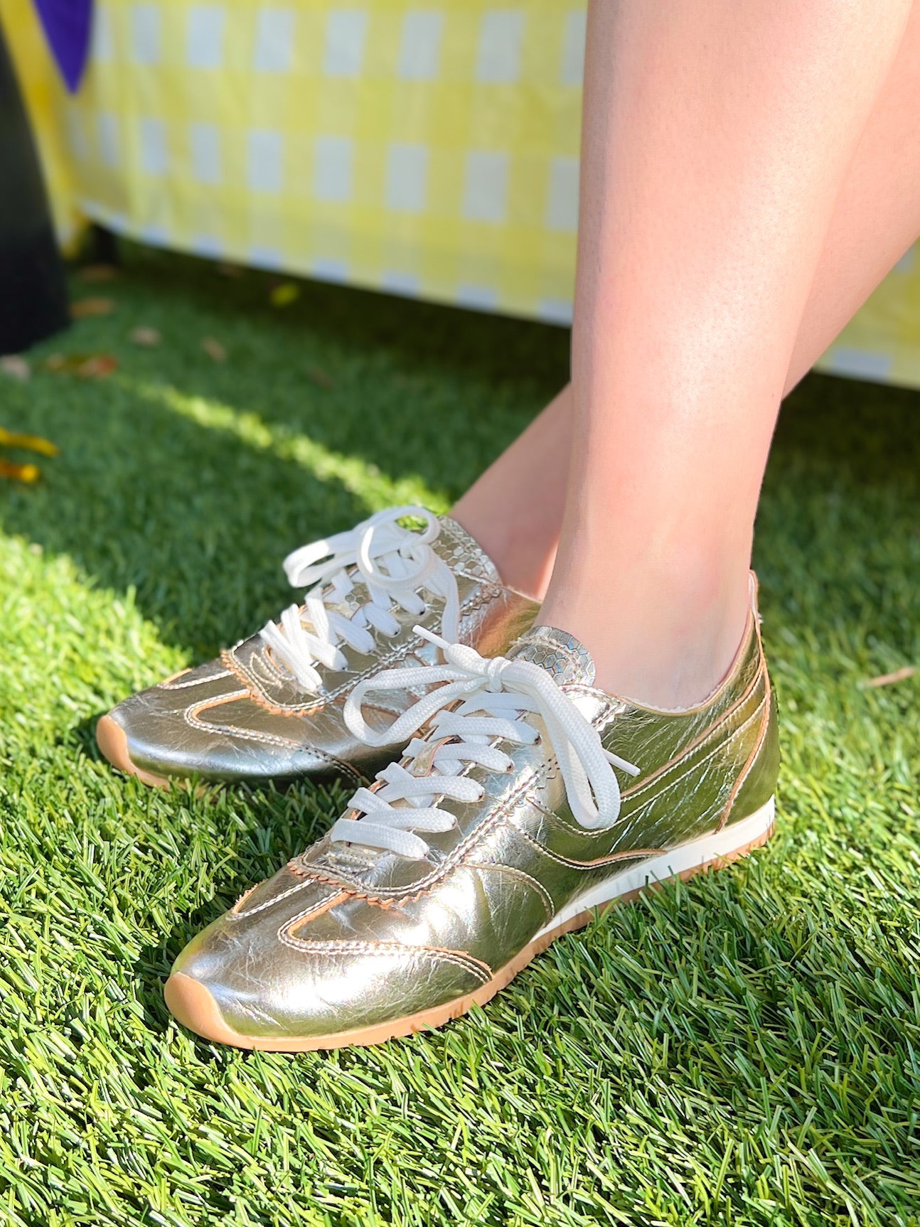 The Delany Gold Sneaker's sporty silhouette and subtle detailing pairs with everything. Errands, office days, or vacation–this sustainable sneaker keeps you stylish and moving!