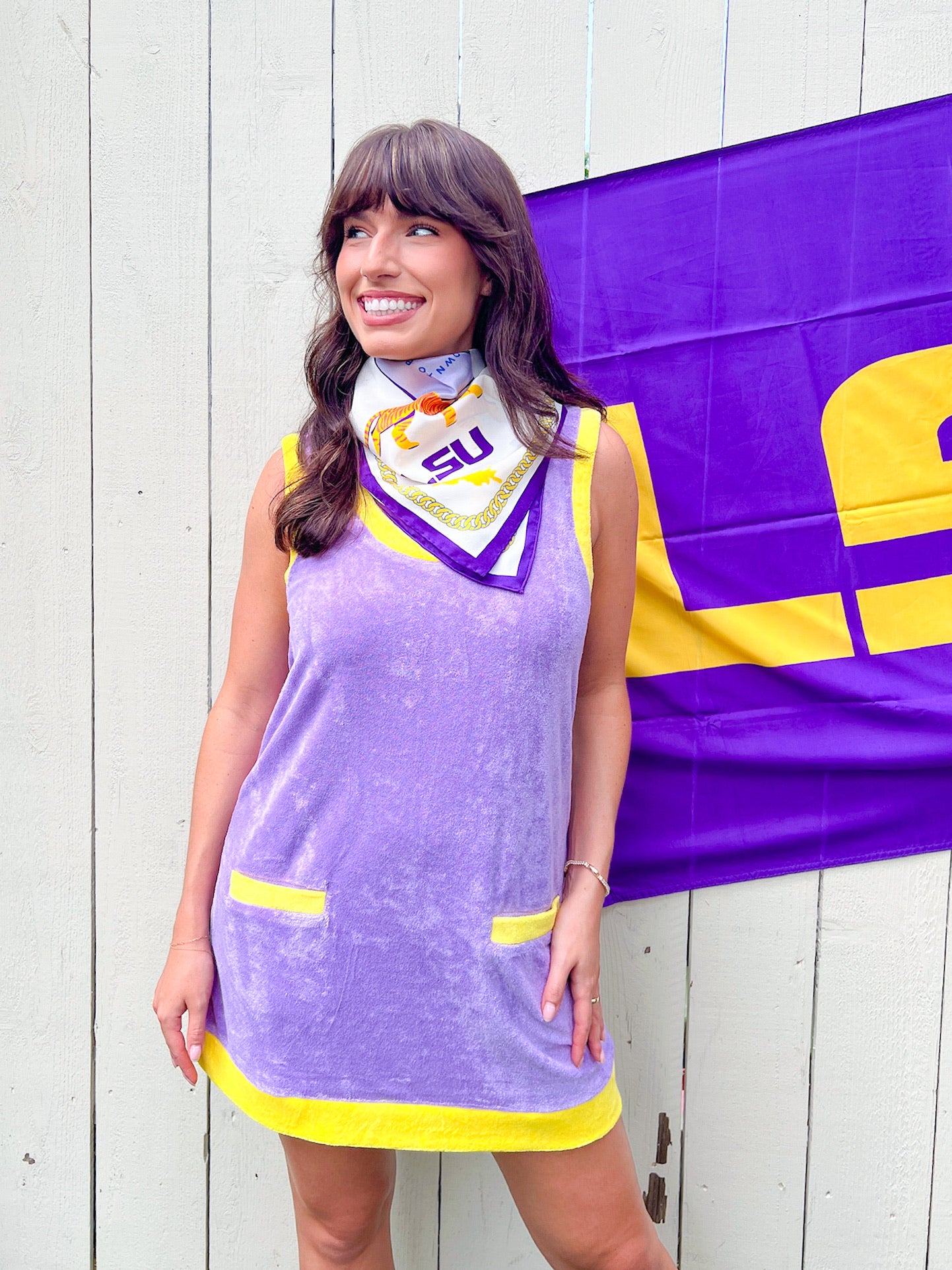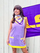 This sleeveless mini dress features a vibrant yellow and purple colorblock design made from soft French terry fabric. It showcases a scoop neckline and handy pockets, blending comfort and style for a cheerful, standout look.
