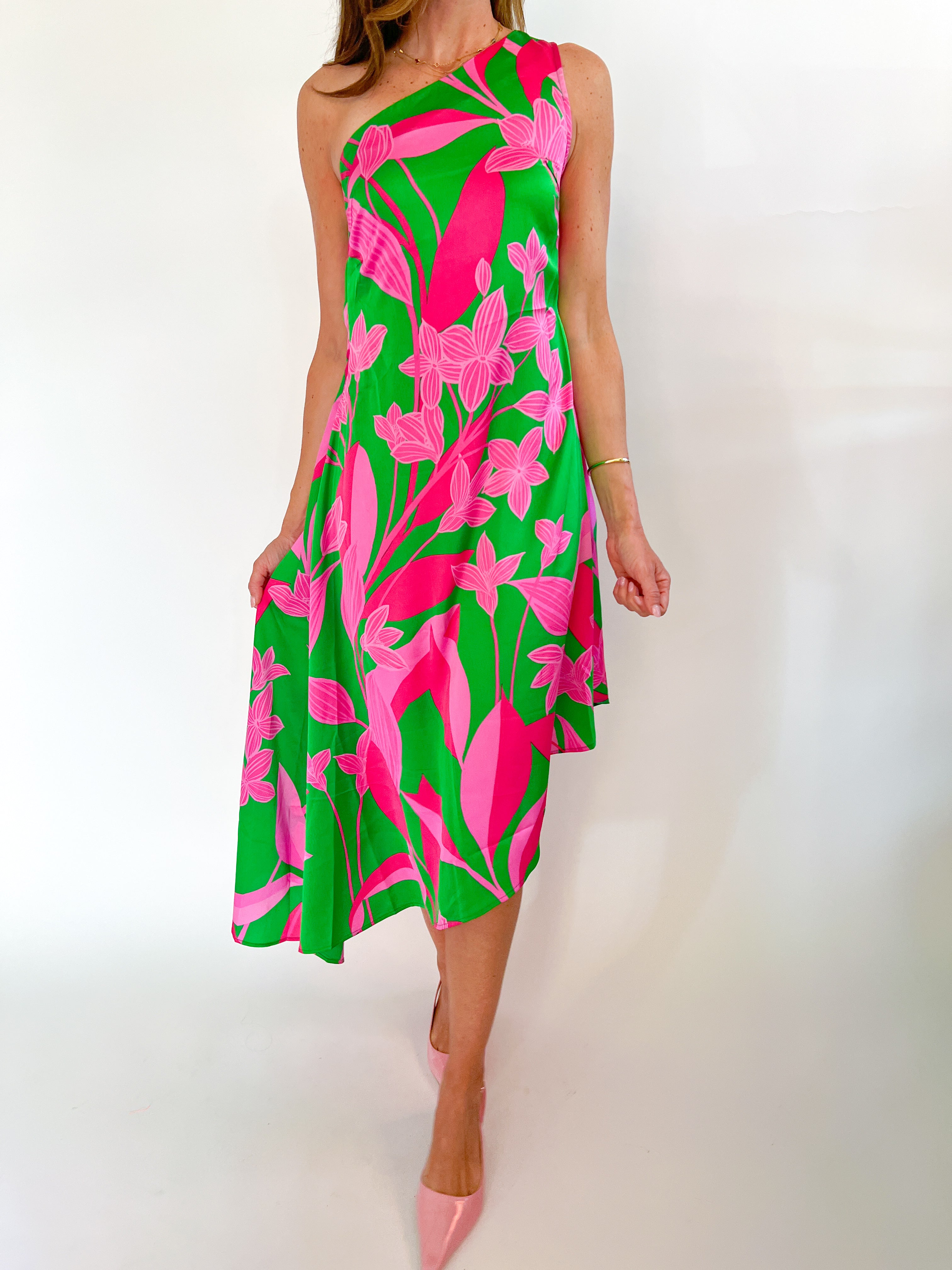 Get ready to stun this season with the chic and playful Zarae One Shoulder Maxi Dress. Featuring a one-shoulder design and sleeveless silhouette, this dress boasts a flirty asymmetrical hemline. Complete your look with a pair of your go-to heels for an extra touch of cuteness.