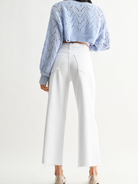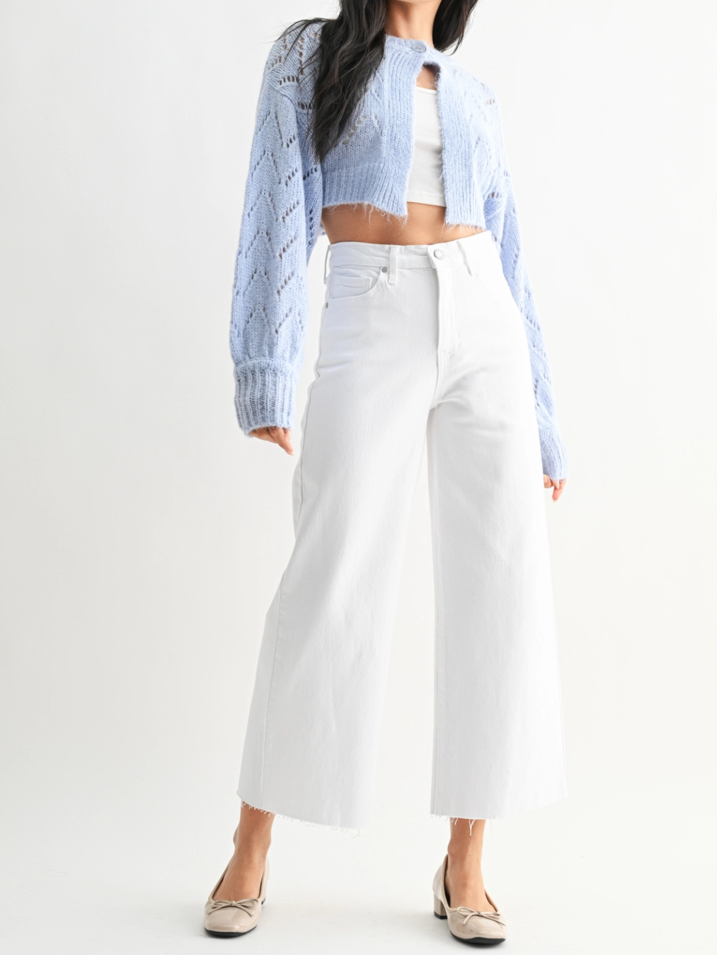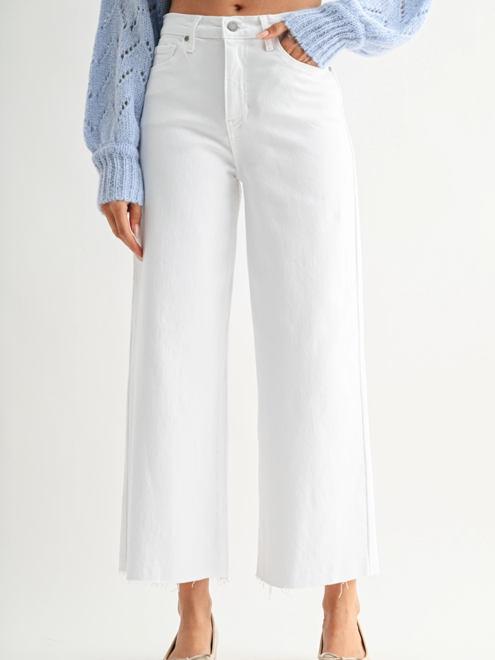 Elevate your denim game with this stunning Optic White Scissor Cut Wide Leg! The high-rise waistband flatters your silhouette while the relaxed wide-leg cut delivers that effortlessly cool vibe. Raw hem detailing adds an edgy, fashion-forward touch that works perfectly with sneakers or heels. Versatile enough for casual days or dressed-up nights, this piece is about to become your go-to favorite. Pure denim perfection!