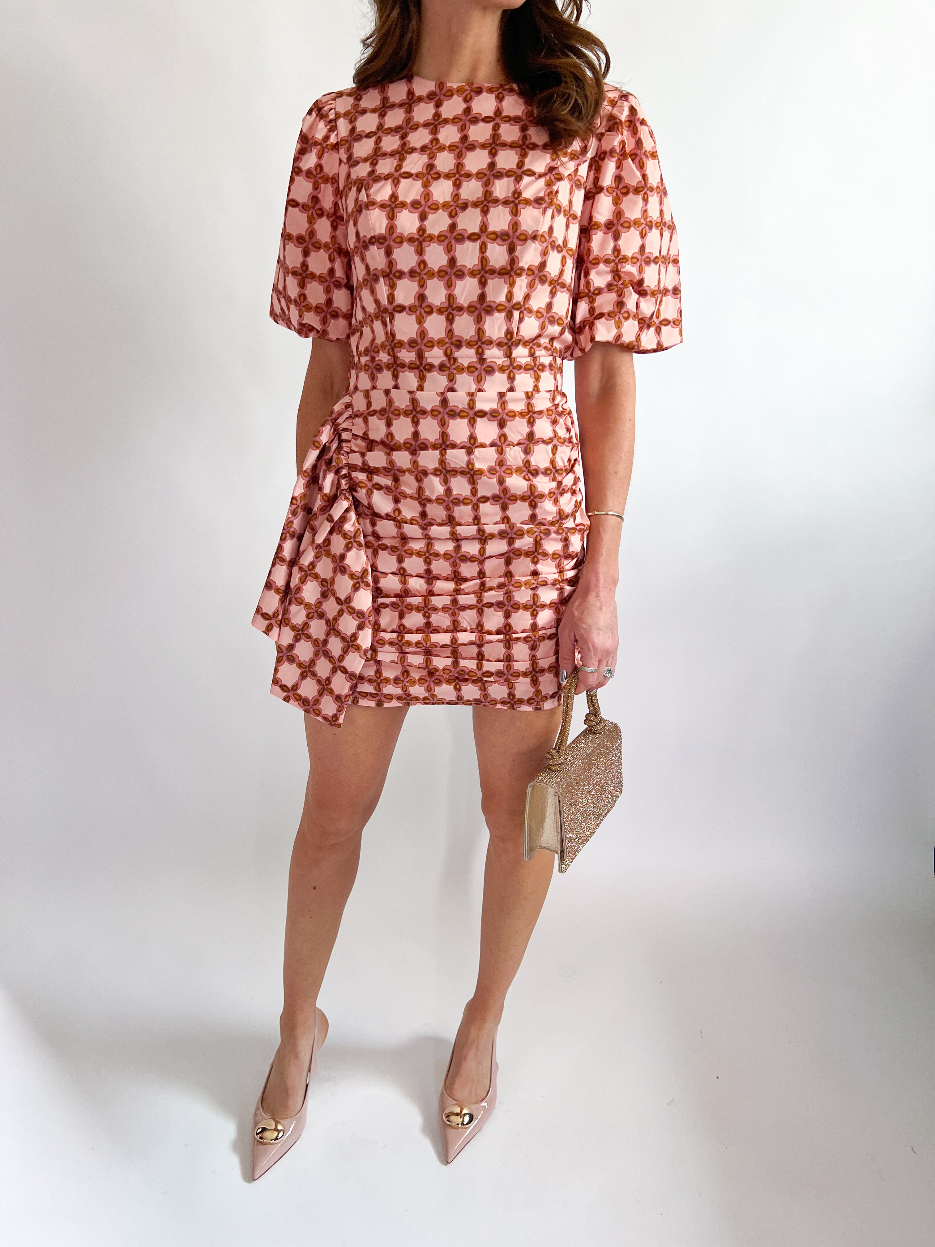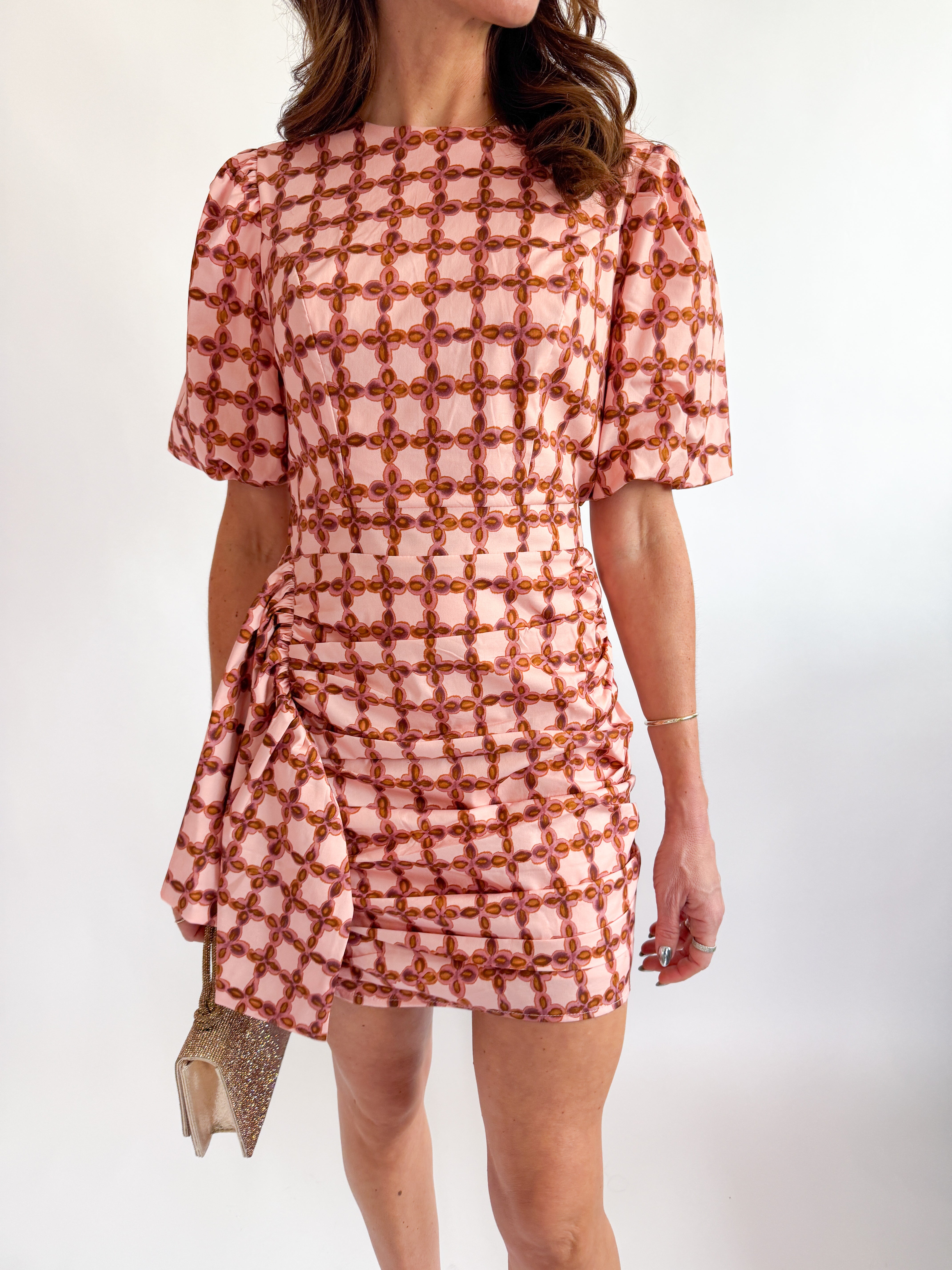 Chainlink Ruched Short Puff Sleeve Mini Dress