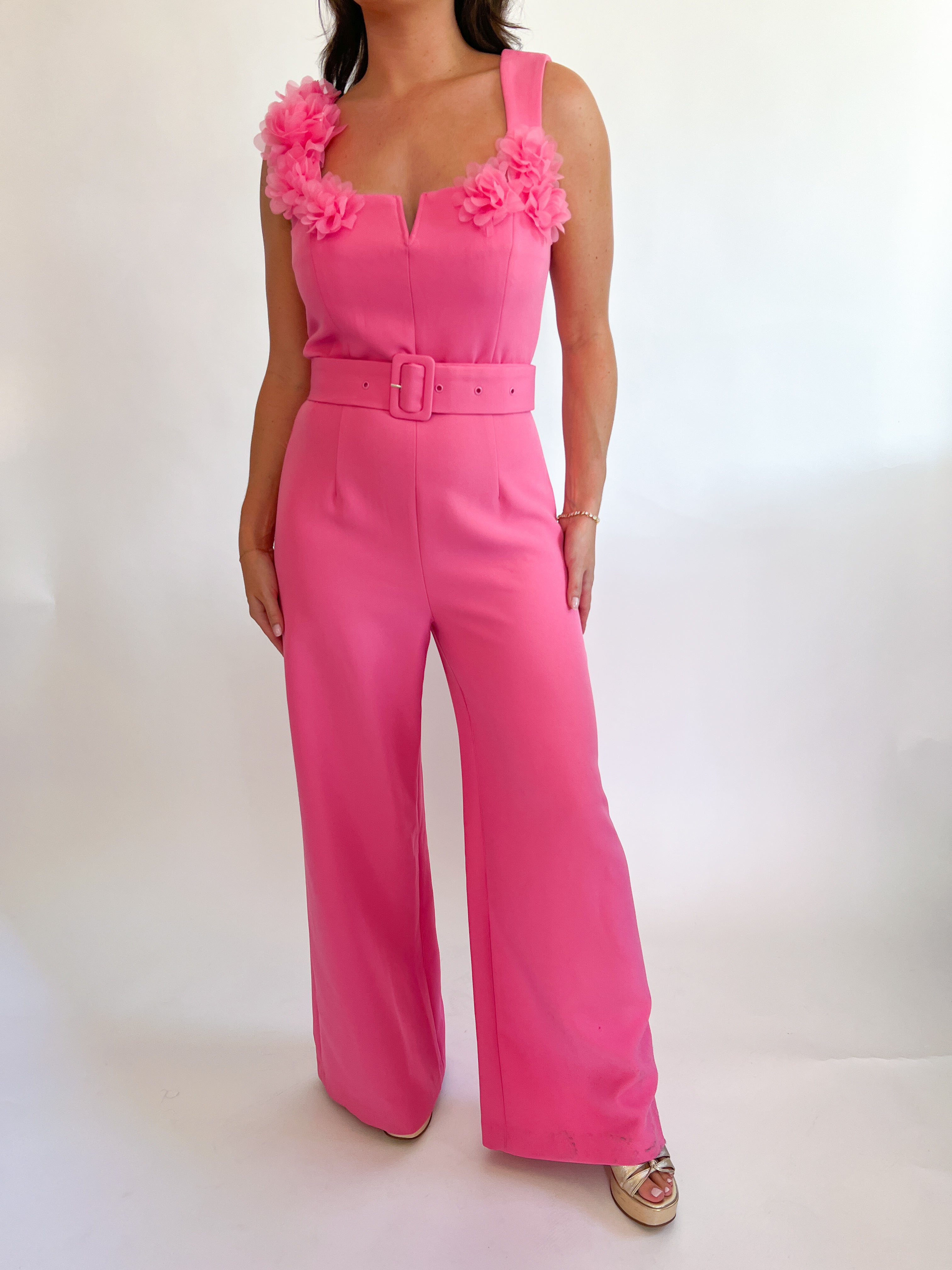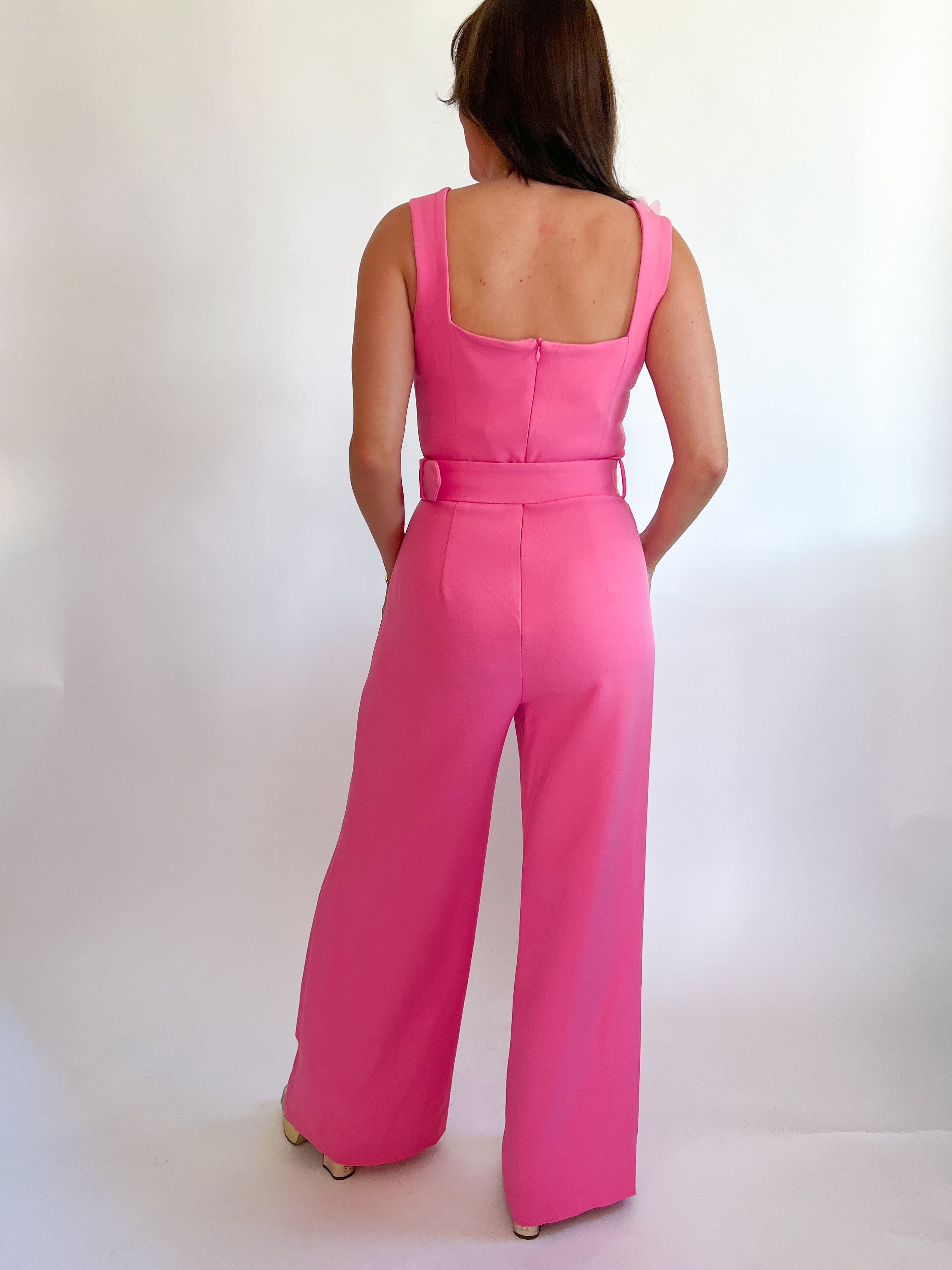 The Klara Jumpsuit in Pink features a flattering wide-leg fit, a stylish square neckline with 3D floral details, and a tailored bodice for comfort and elegance. Perfect for special events, it’s easy to wear and sure to make you stand out. Just add heels and accessories to complete your look!