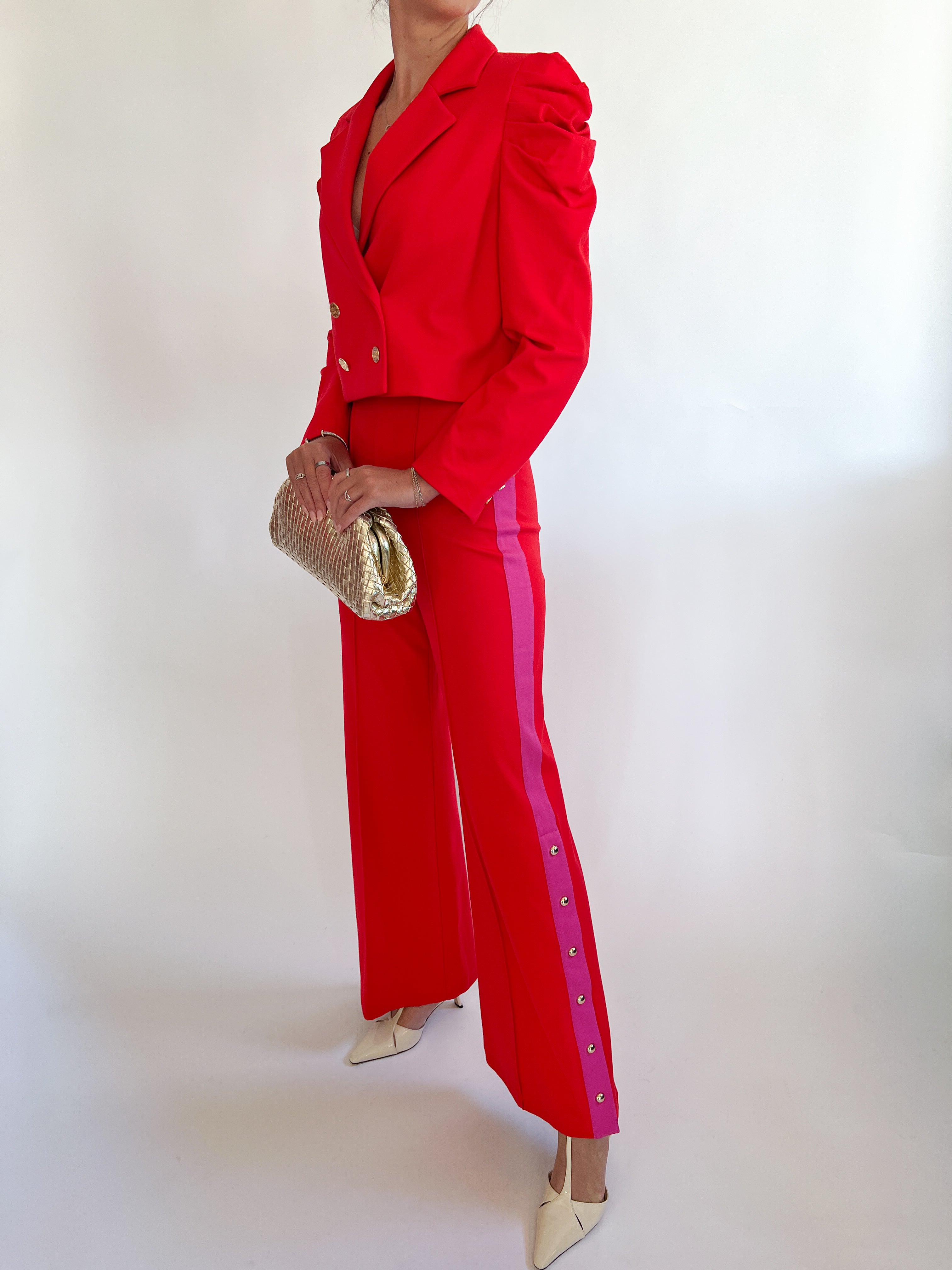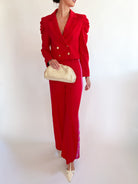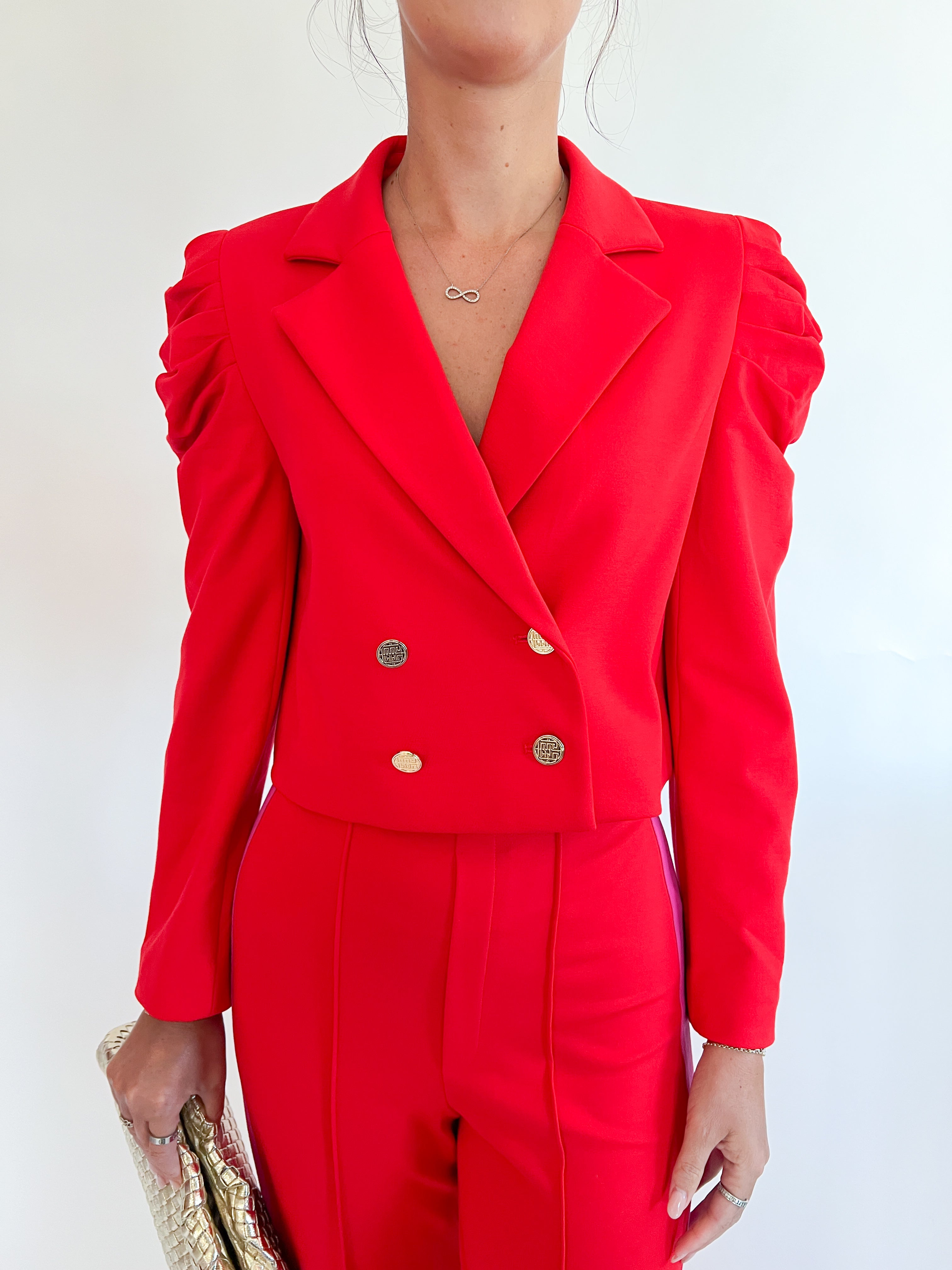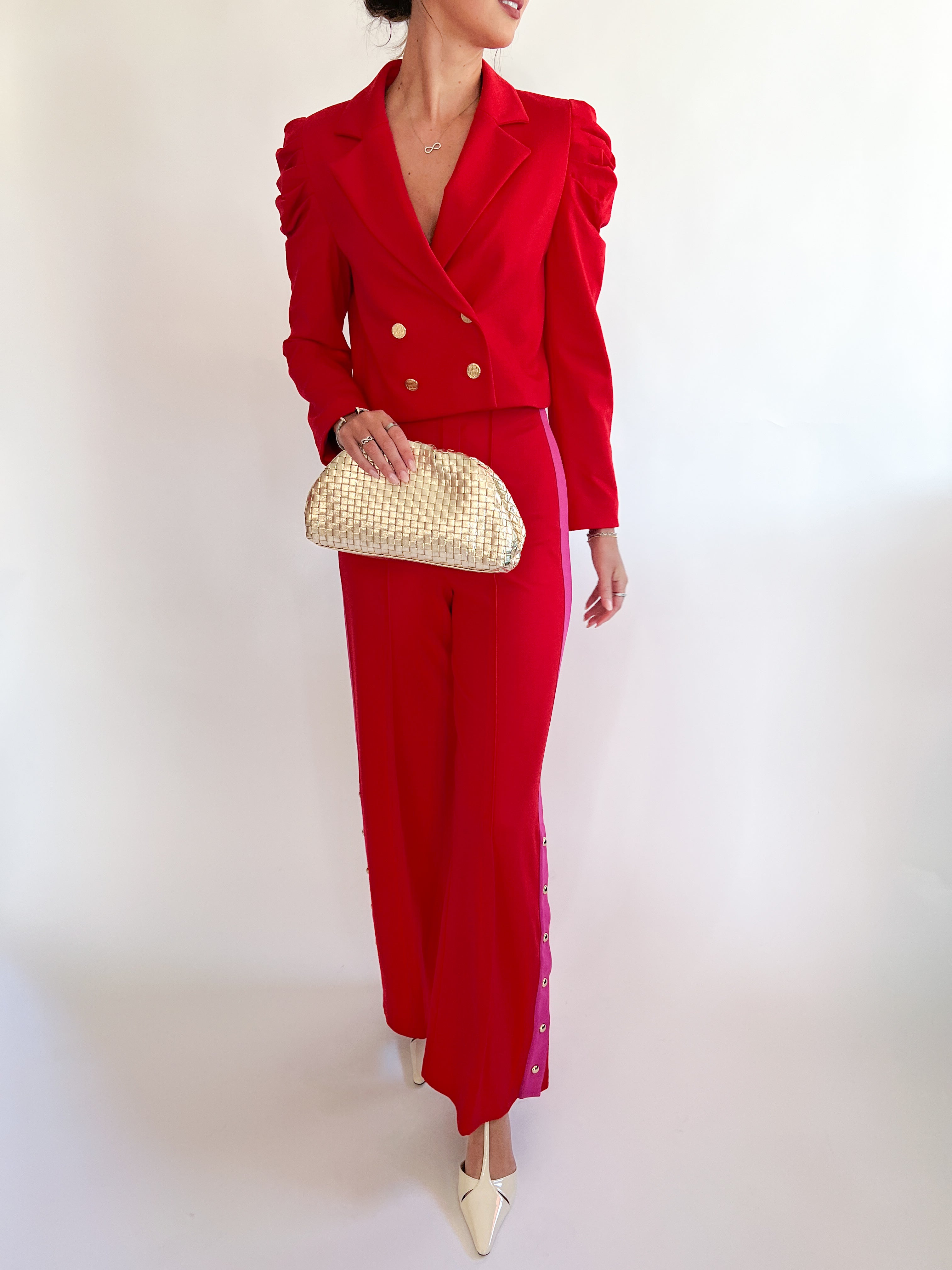 The Margo Blazer in High Risk Red is power dressing with a playful twist. Featuring a sharp notched collar, double-breasted gold button closure, and artfully ruched sleeves, its cropped, boxy silhouette delivers modern edge with timeless tailoring. Crafted in our best-selling Ponte fabric, it moves with you while striking the perfect balance of structure and stretch. Pair it with the Paisley Pant for a head-turning matching set—your ultimate power suit with a pop of personality.