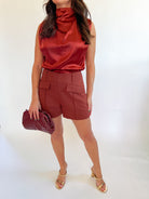 Step up your fashion game with the Parven Top, showcasing a stylish draped cowl neckline and a sleek sleeveless silhouette. Made from silky satin, it offers a luxurious feel and a relaxed fit for comfortable wear. Combine it effortlessly with complementary pieces to create a chic, head-turning ensemble wherever you go.