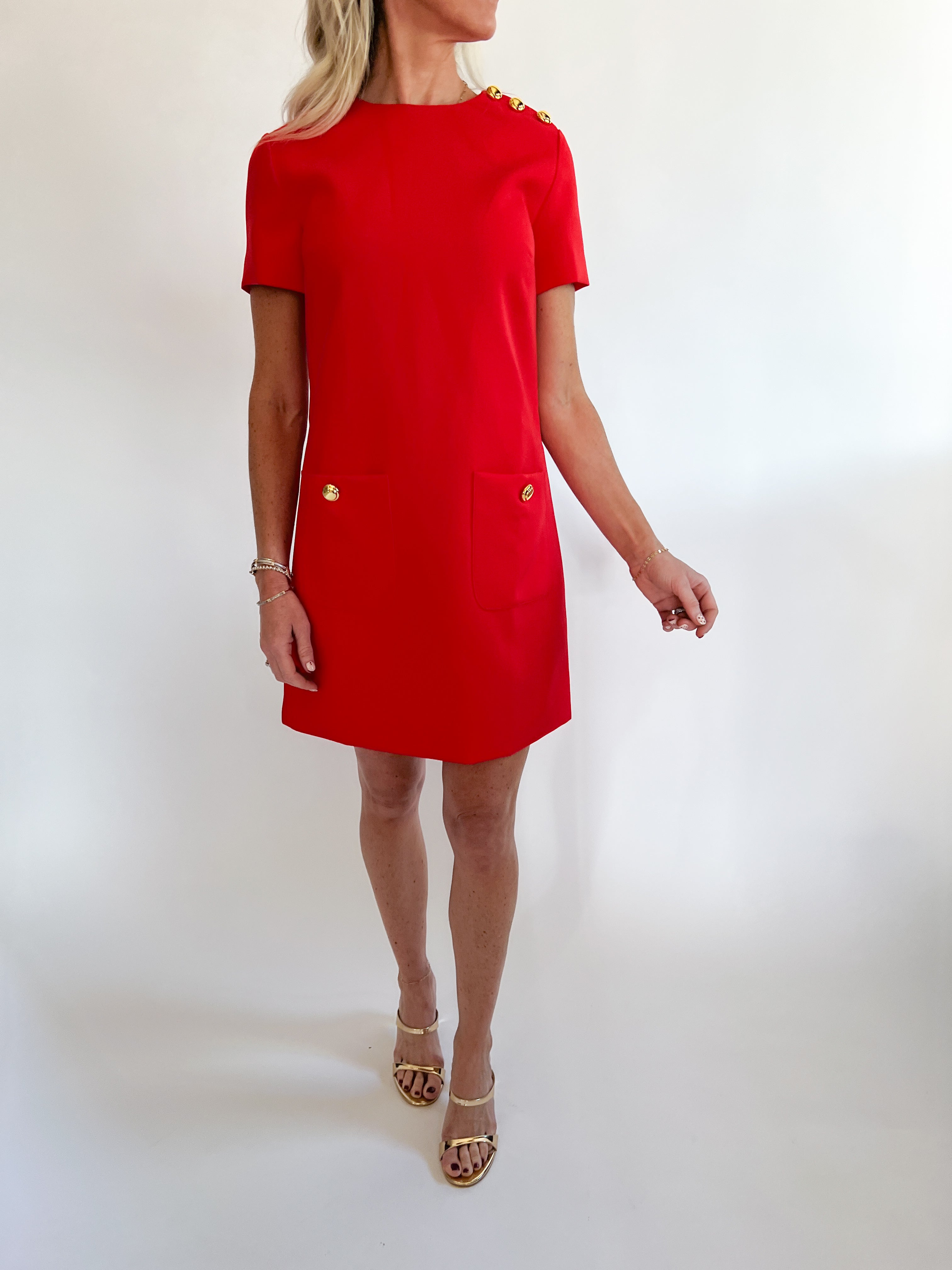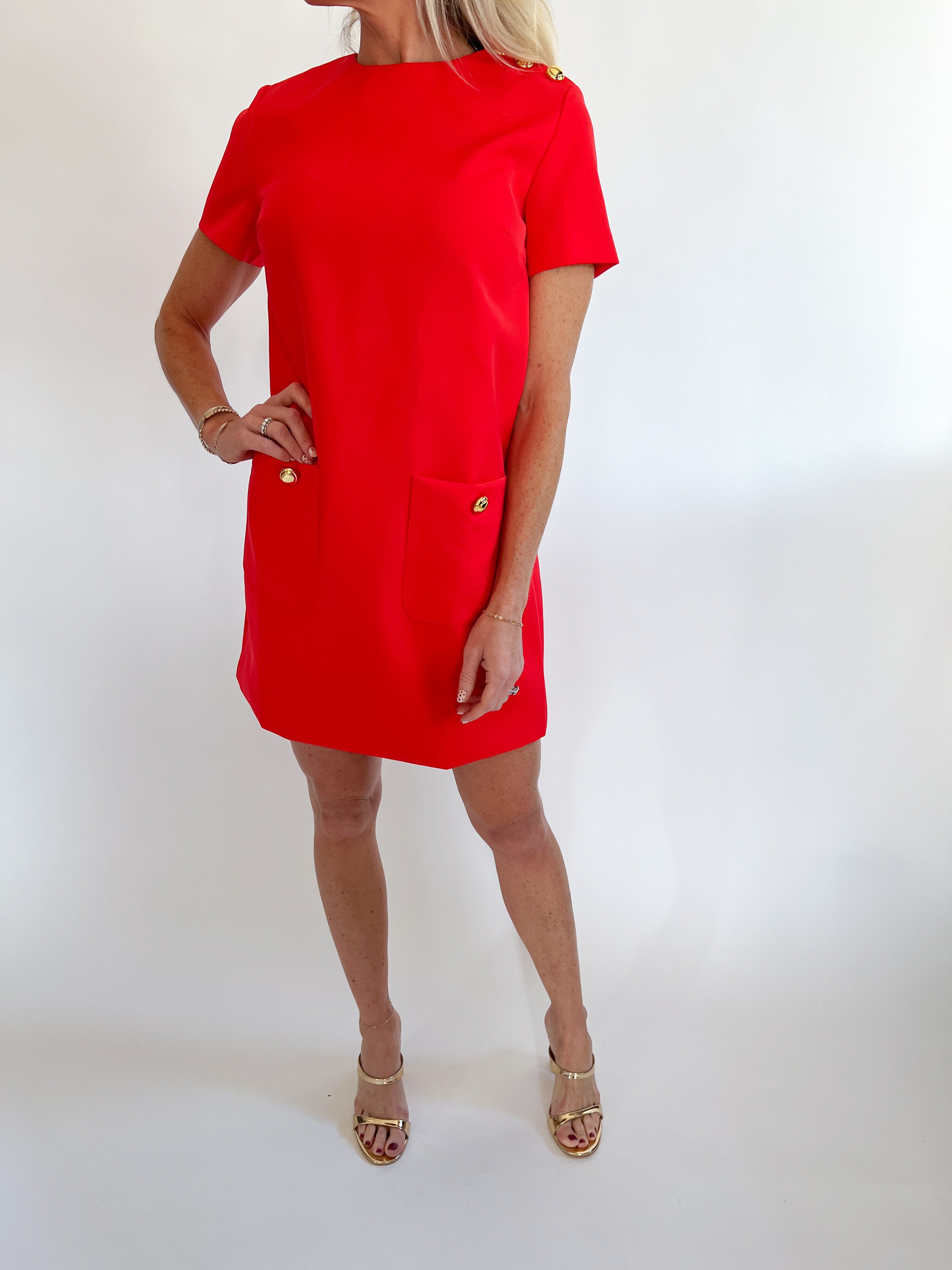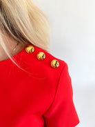 Step out in style with our Red Short Sleeve Mini Shift Dress! This chic mini dress features a flattering round neckline and short sleeves, ideal for any event. What really sets it apart are the eye-catching gold buttons on the shoulders that add a glamorous flair. Whether you're heading out for a night on the town or a special occasion, you’ll feel confident and elegant. Elevate your look today with this standout mini dress!
