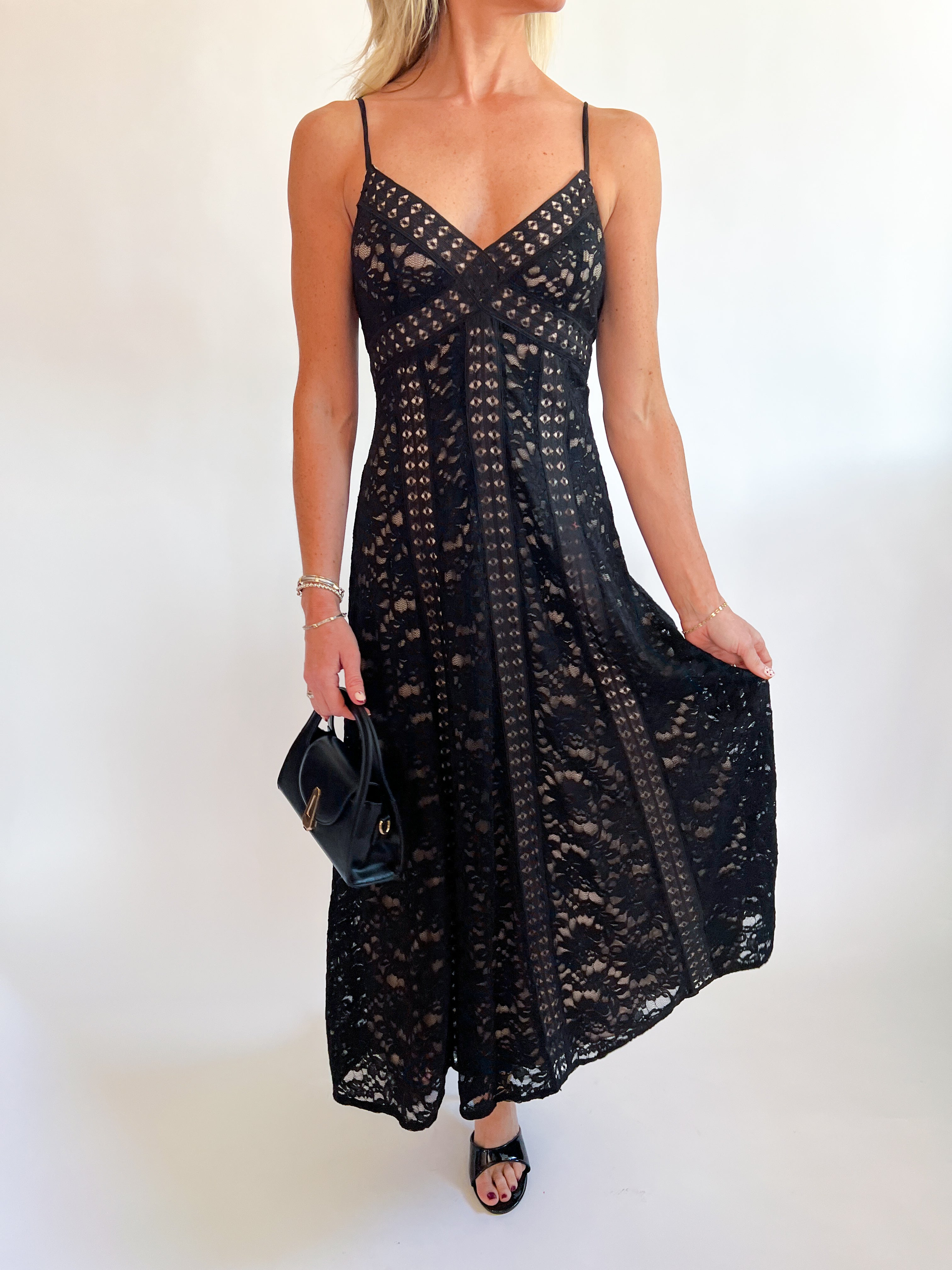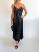This Woven Lace Midi Dress offers a charming blend of elegance and comfort with its delicate cami top and beautiful lace insets. The flowing circle skirt adds a playful touch, while the back zipper closure ensures easy and secure wear, making it perfect for any special event or day out.