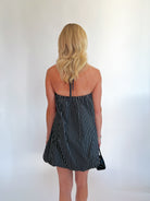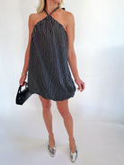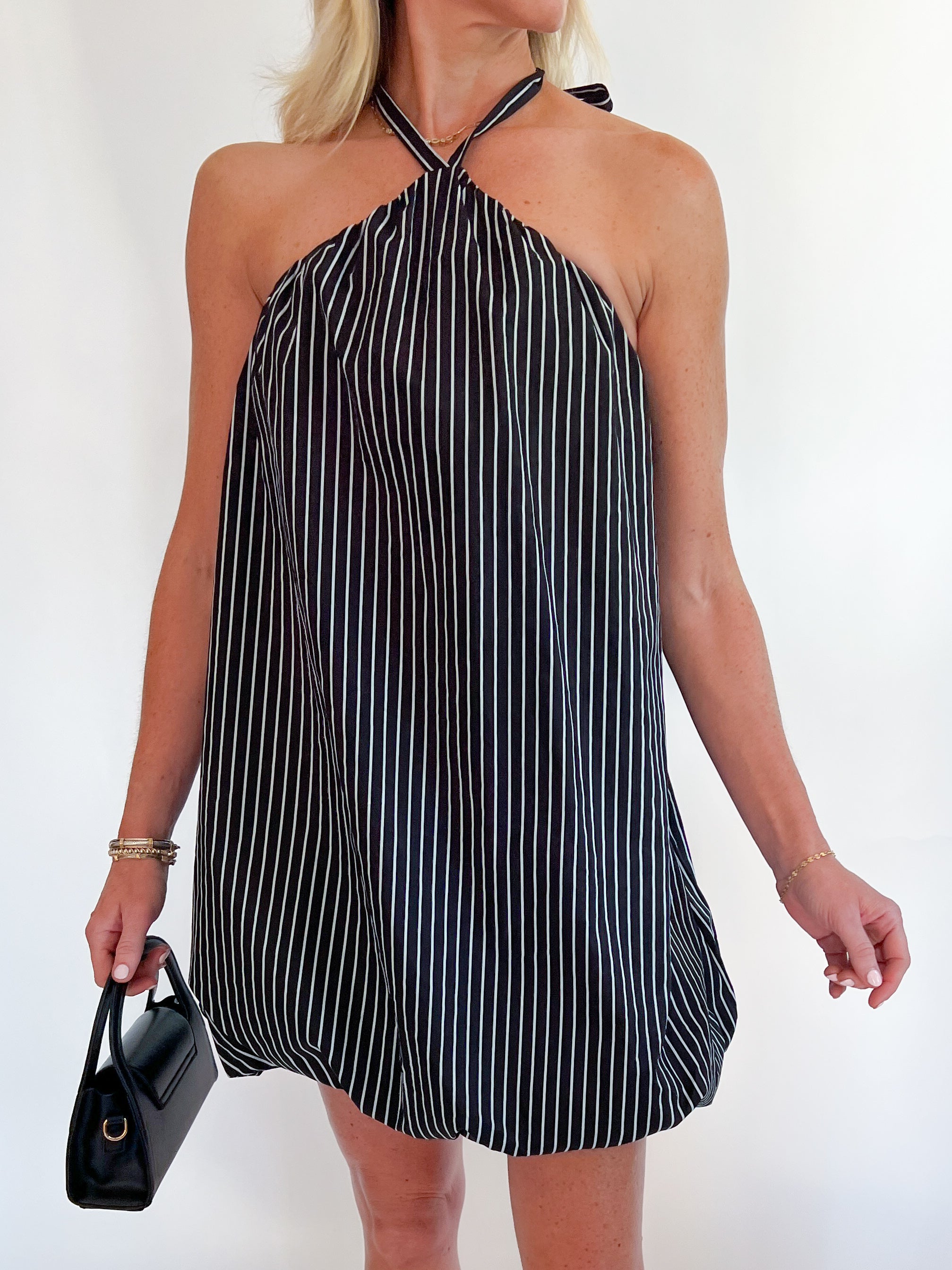 Turn heads in the Astella Bubble Mini Dress, featuring a playful halter neck with a back tie closure for a perfect fit. Its sleeveless design and bubble hem add a flirty touch, while the mini length and A-line silhouette offer effortless style. The bold striped pattern brings a fresh, vibrant vibe—ideal for sunny days or fun nights out.