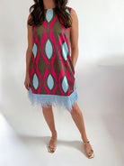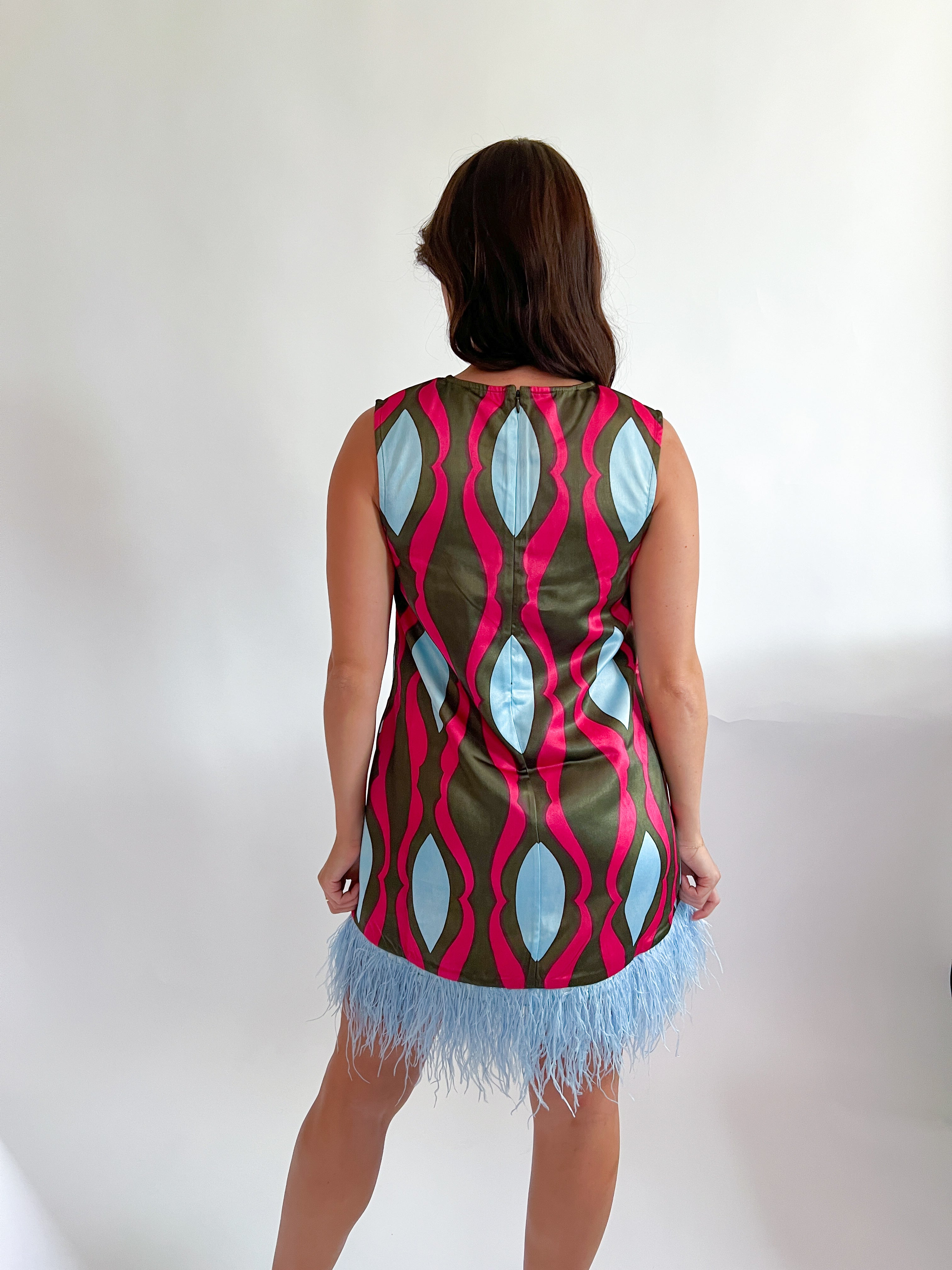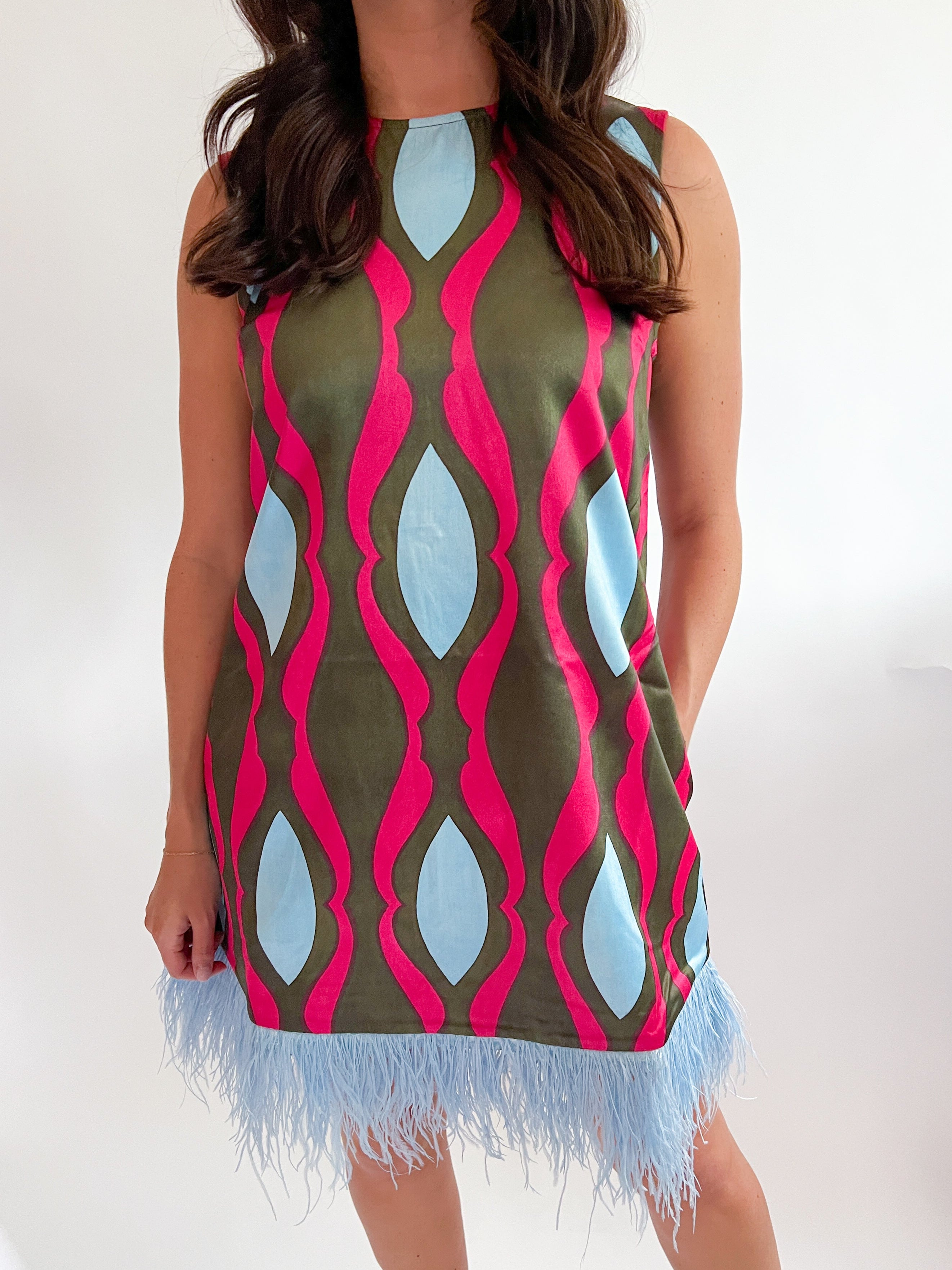 The Darcy Shift Dress showcases a fresh new print paired with fluttering faux feathers in our signature blue. Its sleeveless shift design keeps things fun and effortless, while the feathered hem adds a touch of dramatic flair. Step out in a look that’s truly unforgettable!