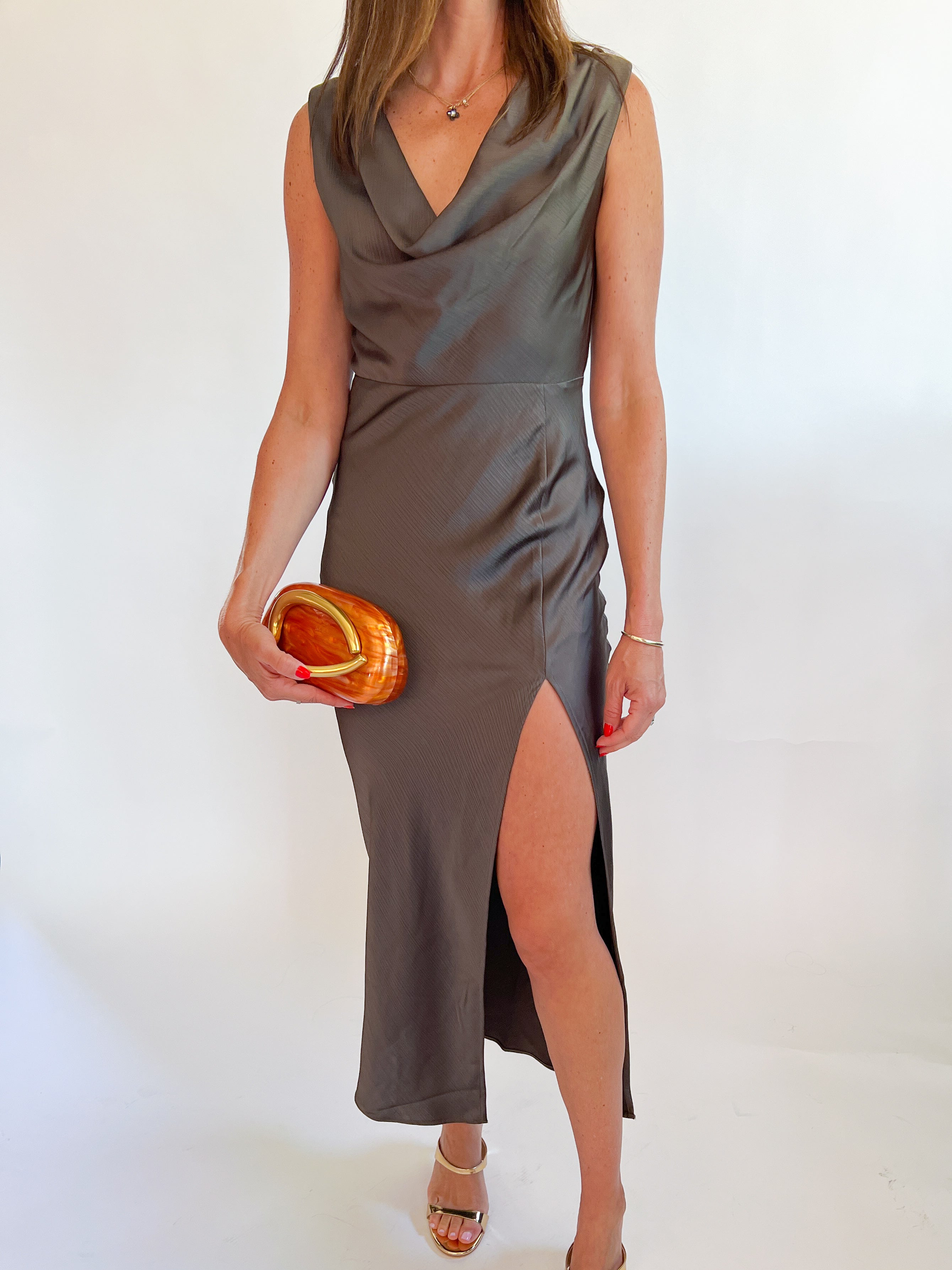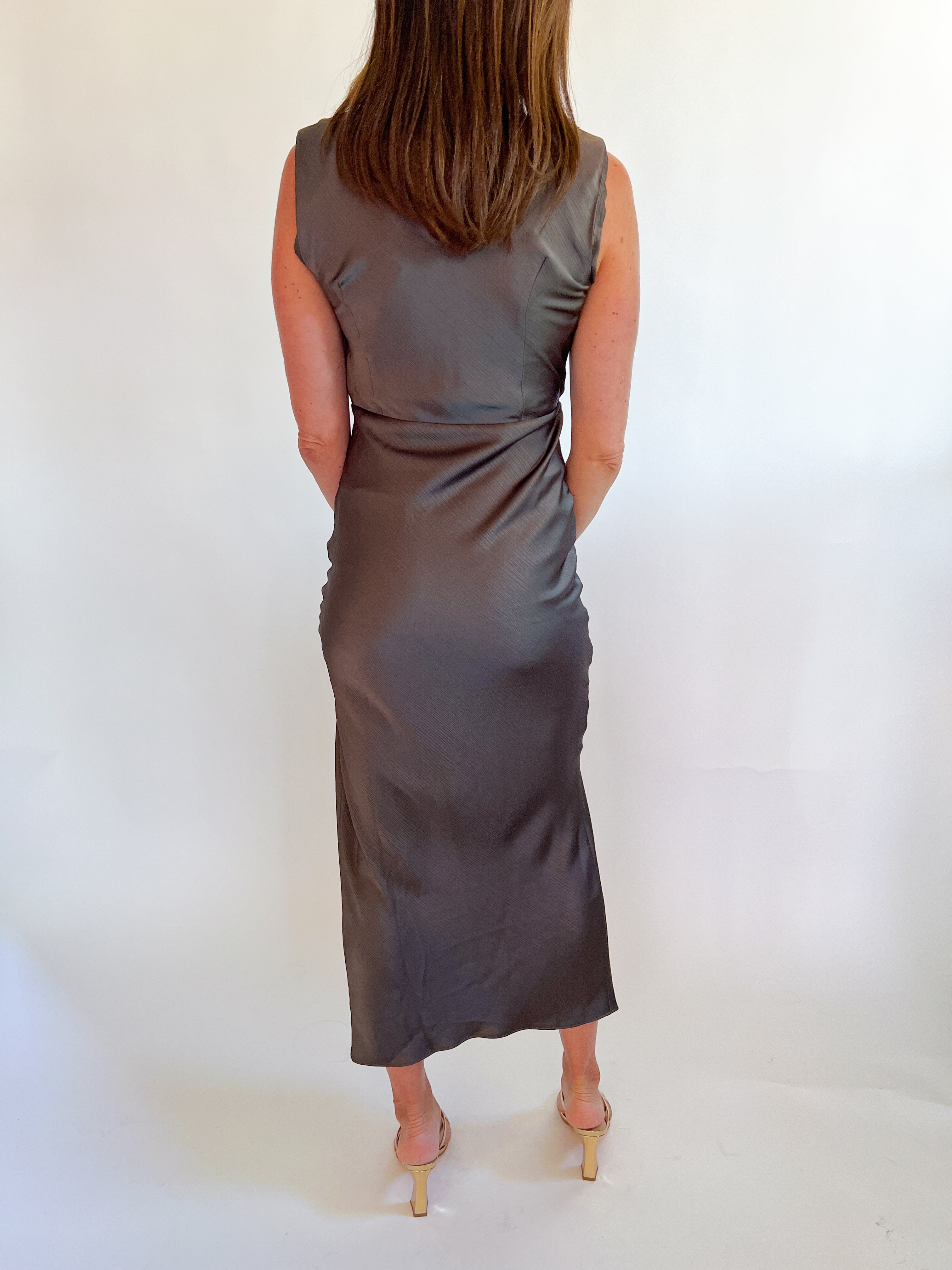 The Etal Side Slit Dress features stylish gathered shoulders and a sleeveless design for a breezy, elegant look. It includes a back keyhole with button closure and a convenient side zipper for easy wear. The maxi length with a side slit adds a touch of movement and sophistication, making it perfect for standout moments.