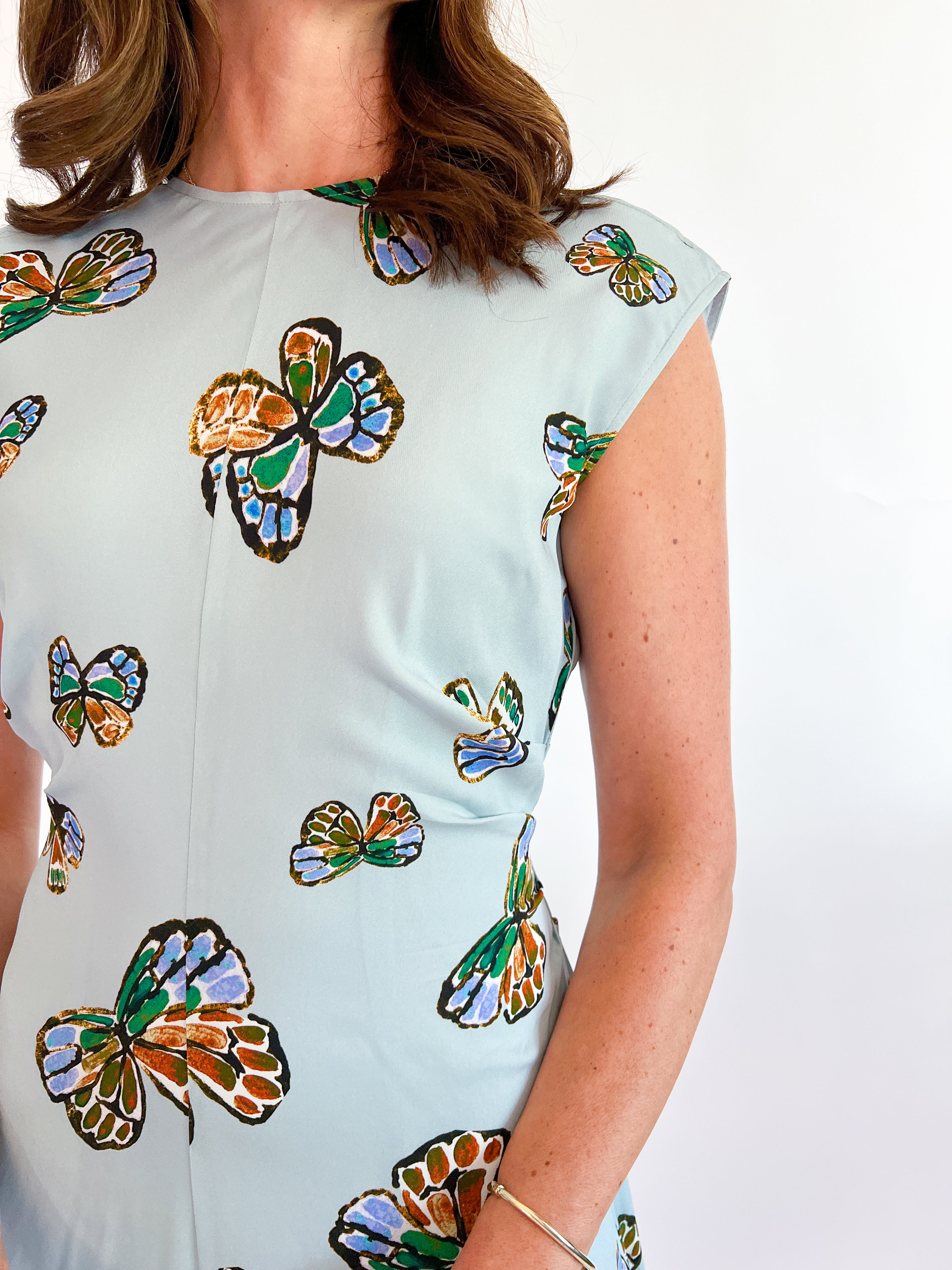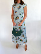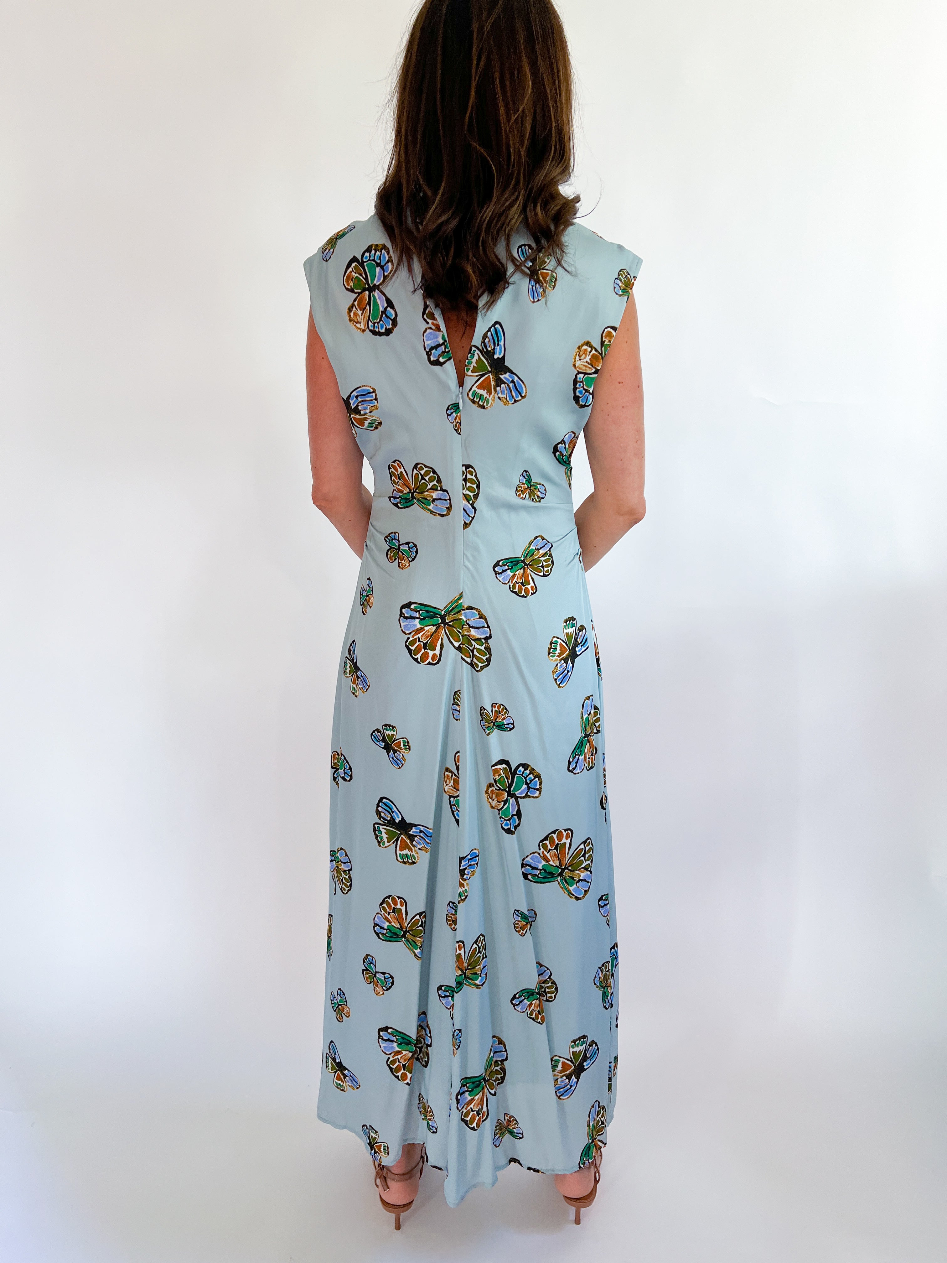 This elegant maxi dress, cut on the bias and featuring pleated waist details along with a center-back keyhole opening, is perfect for transitioning from summer to fall. The cheerful Adonis print brings a playful touch with its vibrant butterfly pattern set against a sky-blue backdrop.