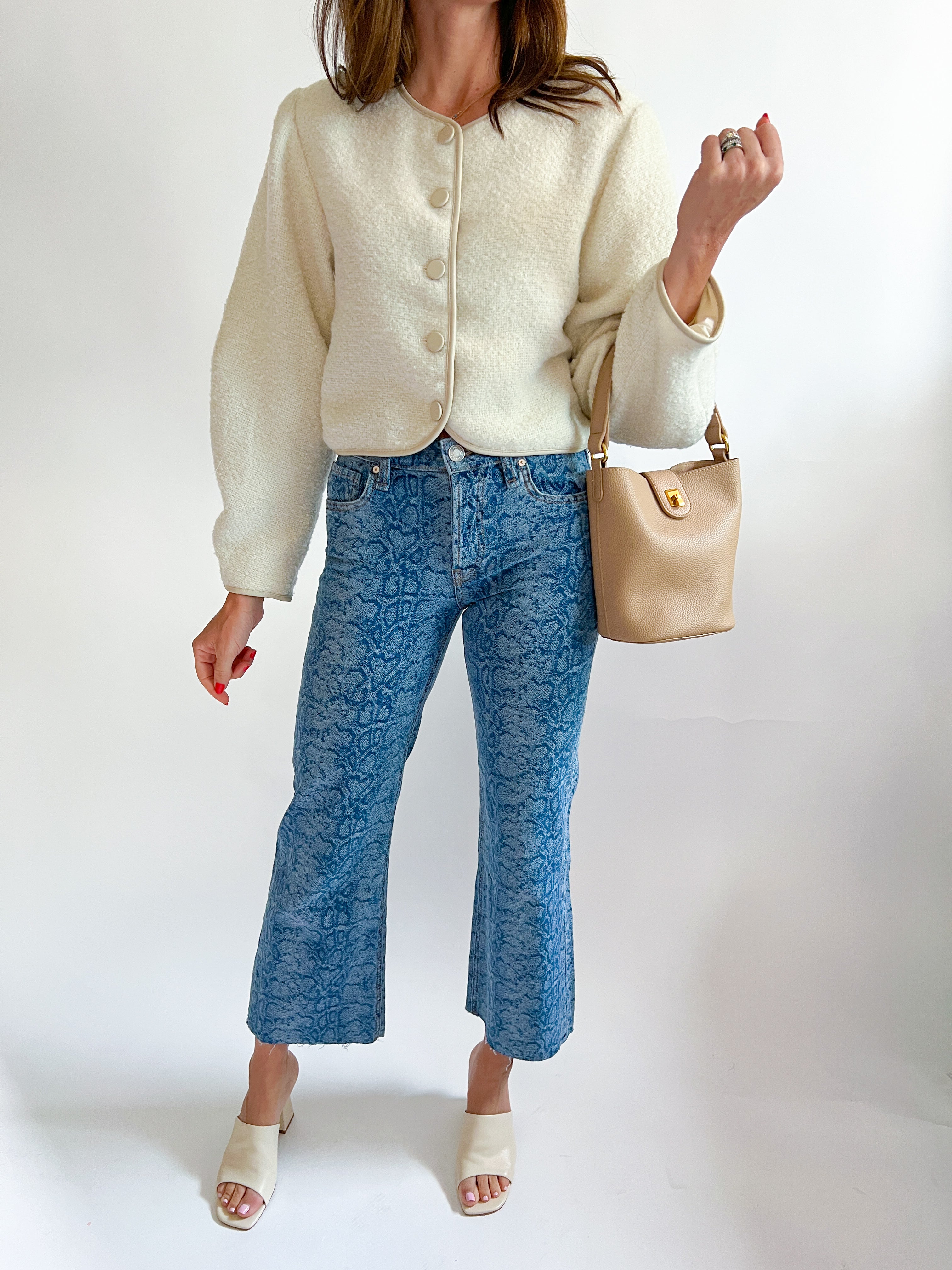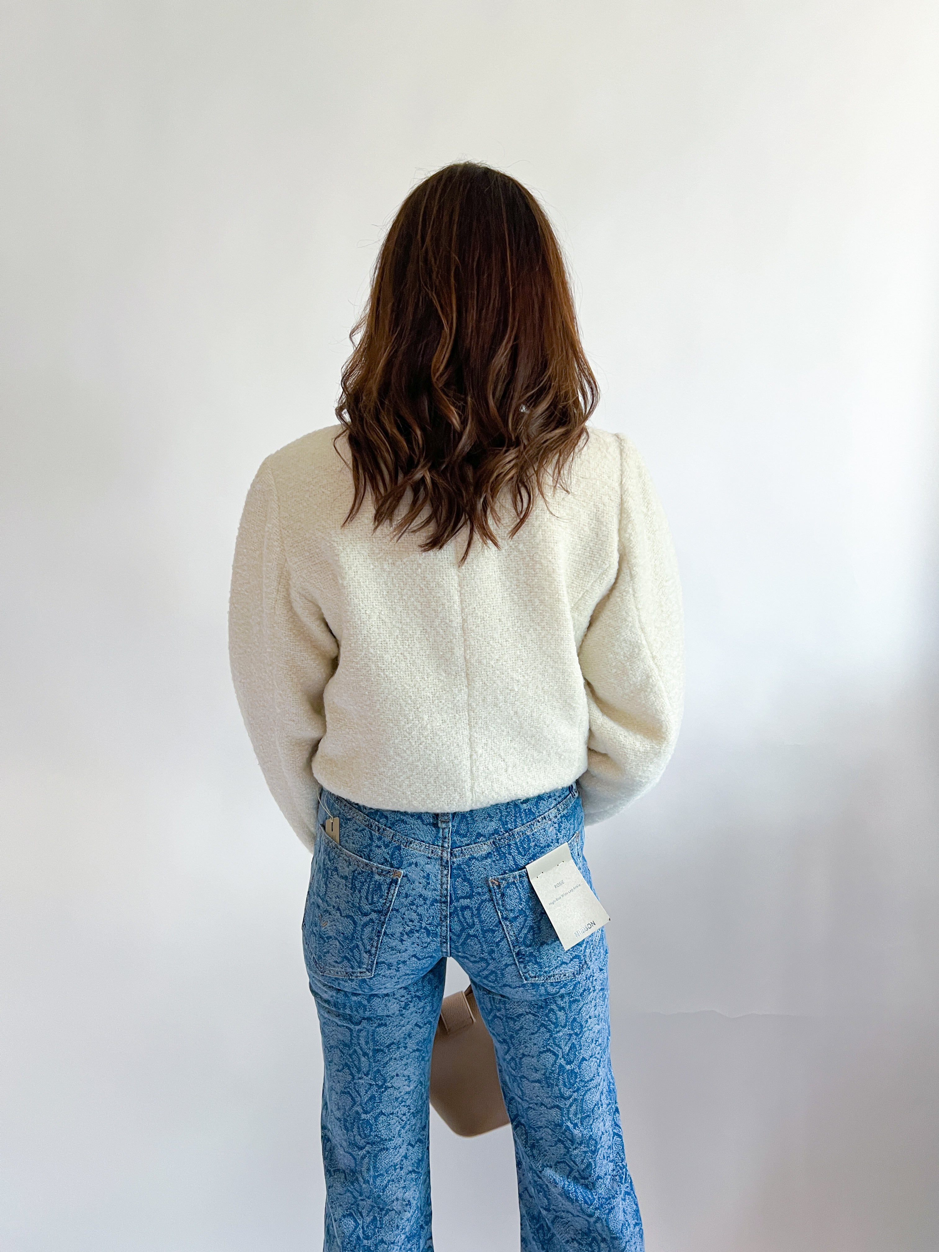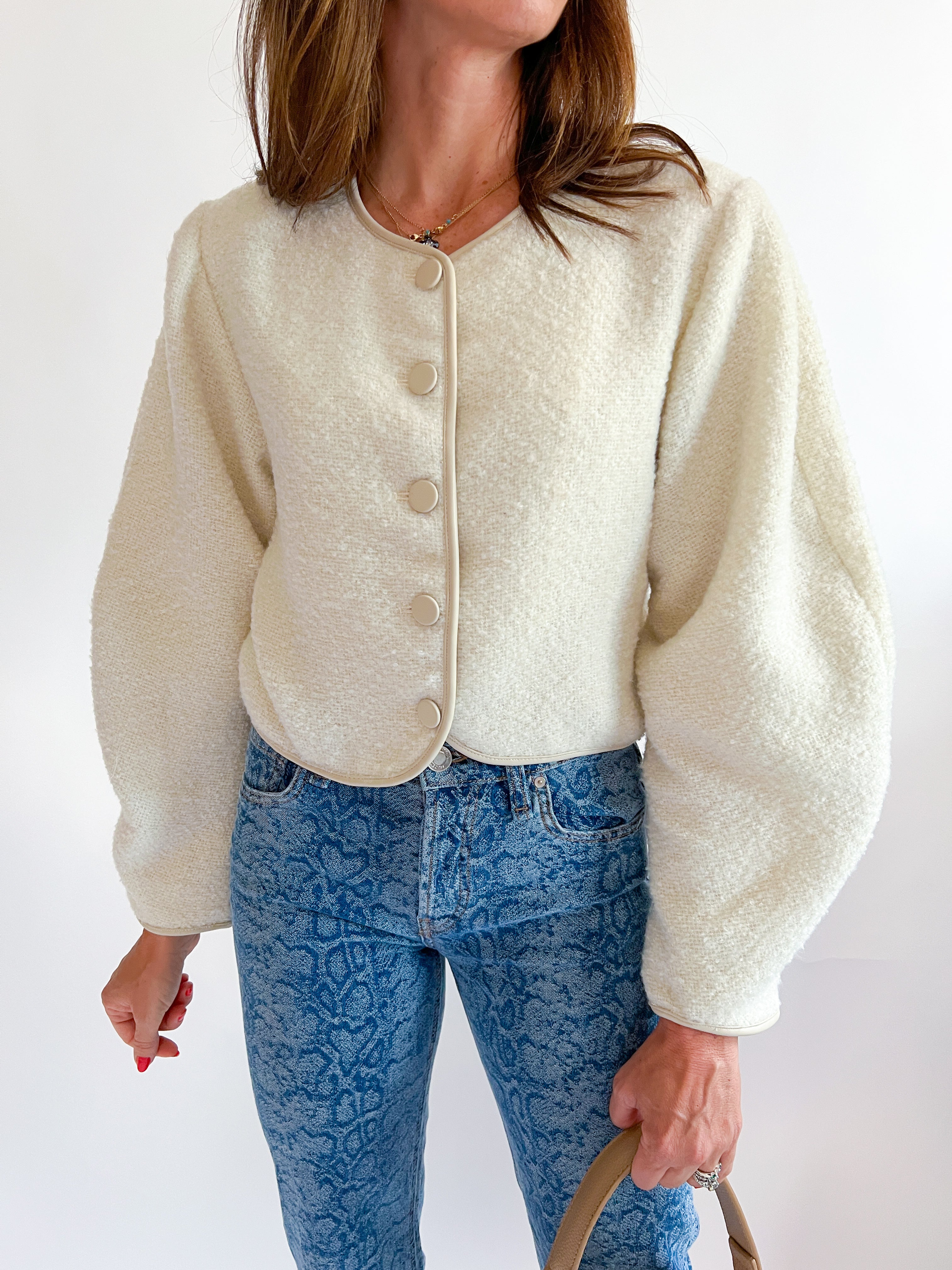 The Emili Jacket features a round neckline and oversized long sleeves for a bold, stylish look. Its button front closure and contrasting hem detail add eye-catching charm, while the cropped fit brings a modern, flattering silhouette. This jacket is perfect for adding a fun pop to any outfit!
