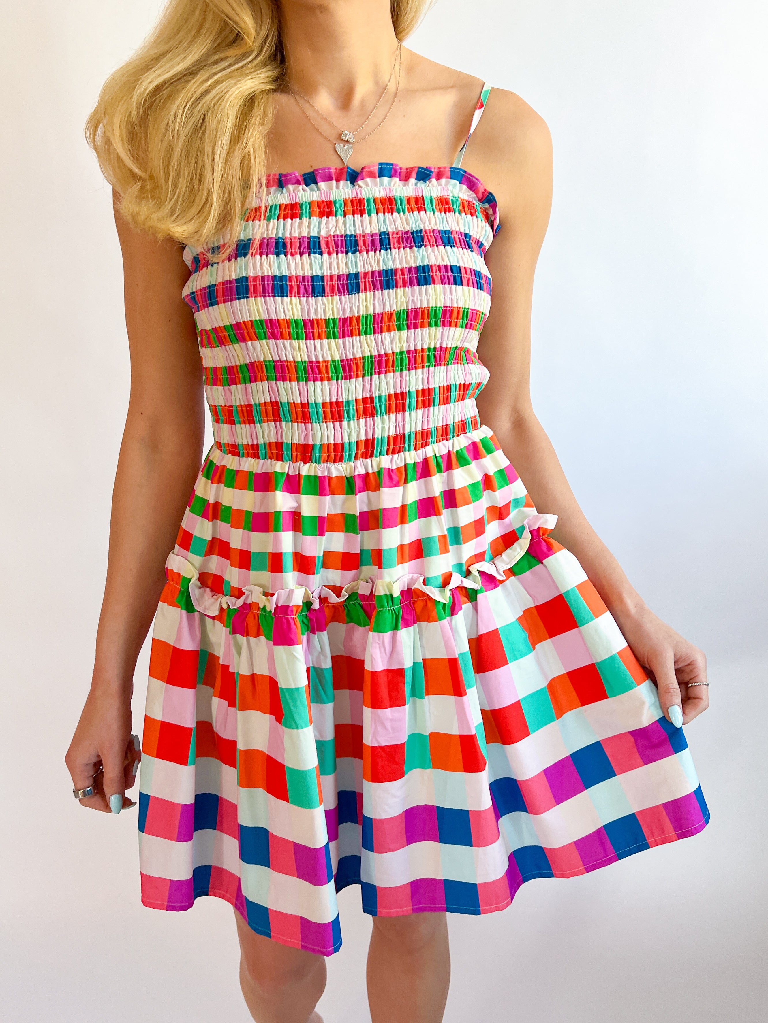 Multi Color Checkered Smocked Bodice Mini Dress