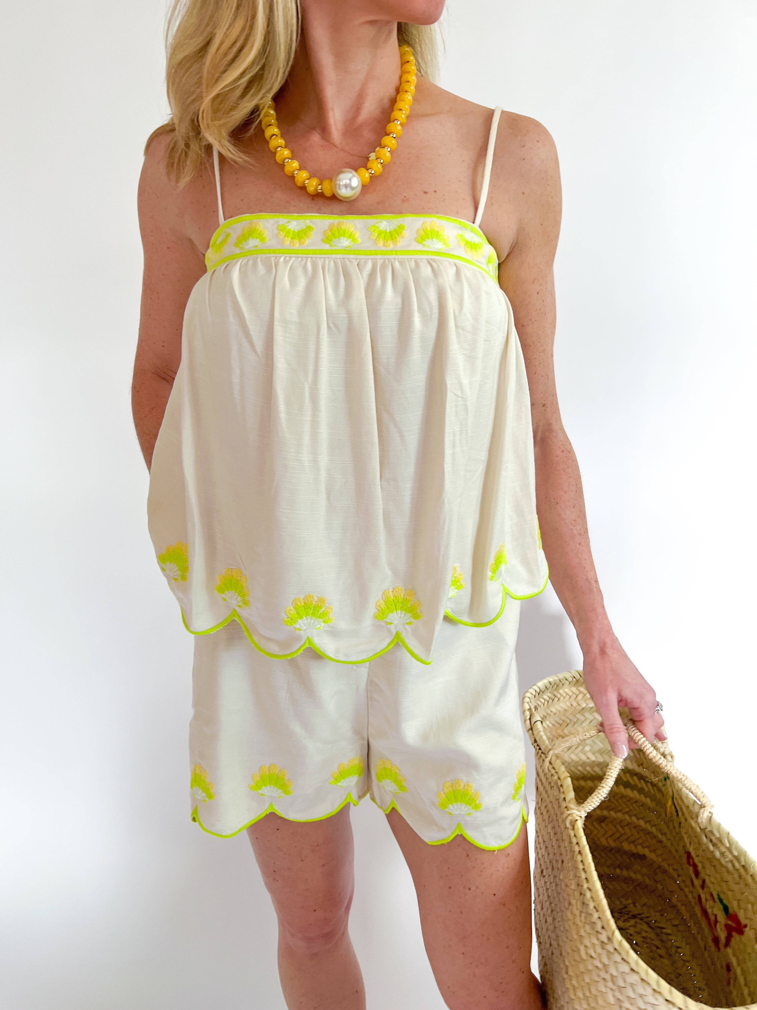 Seashell embroidery scallop set in viscose linen fabric. This sleeveless relaxed style top features intricate seashell embroidery at neckline/hem, embroidered scalloped hem, lining, adjustable straps, square neck, and elastic at back.