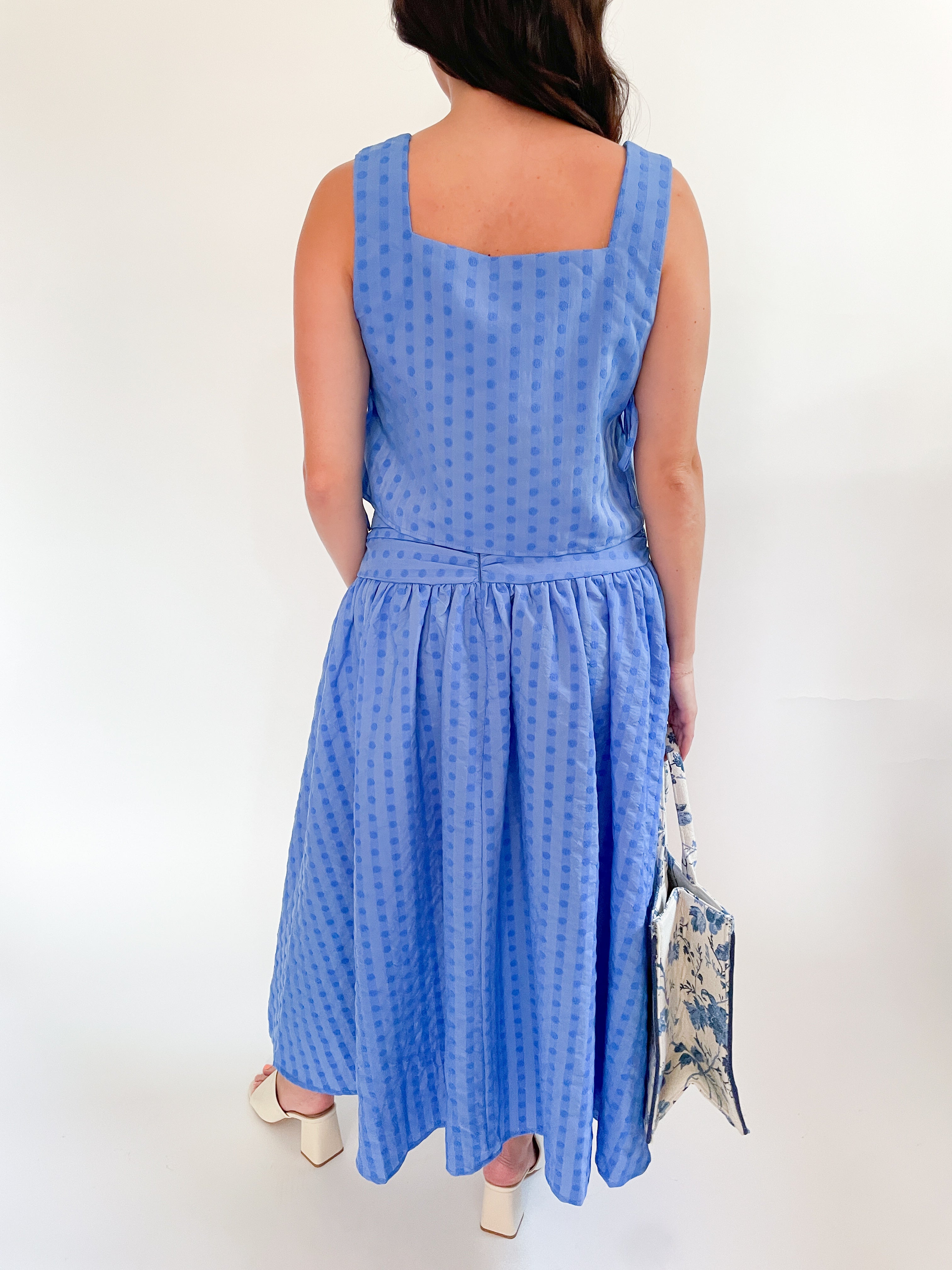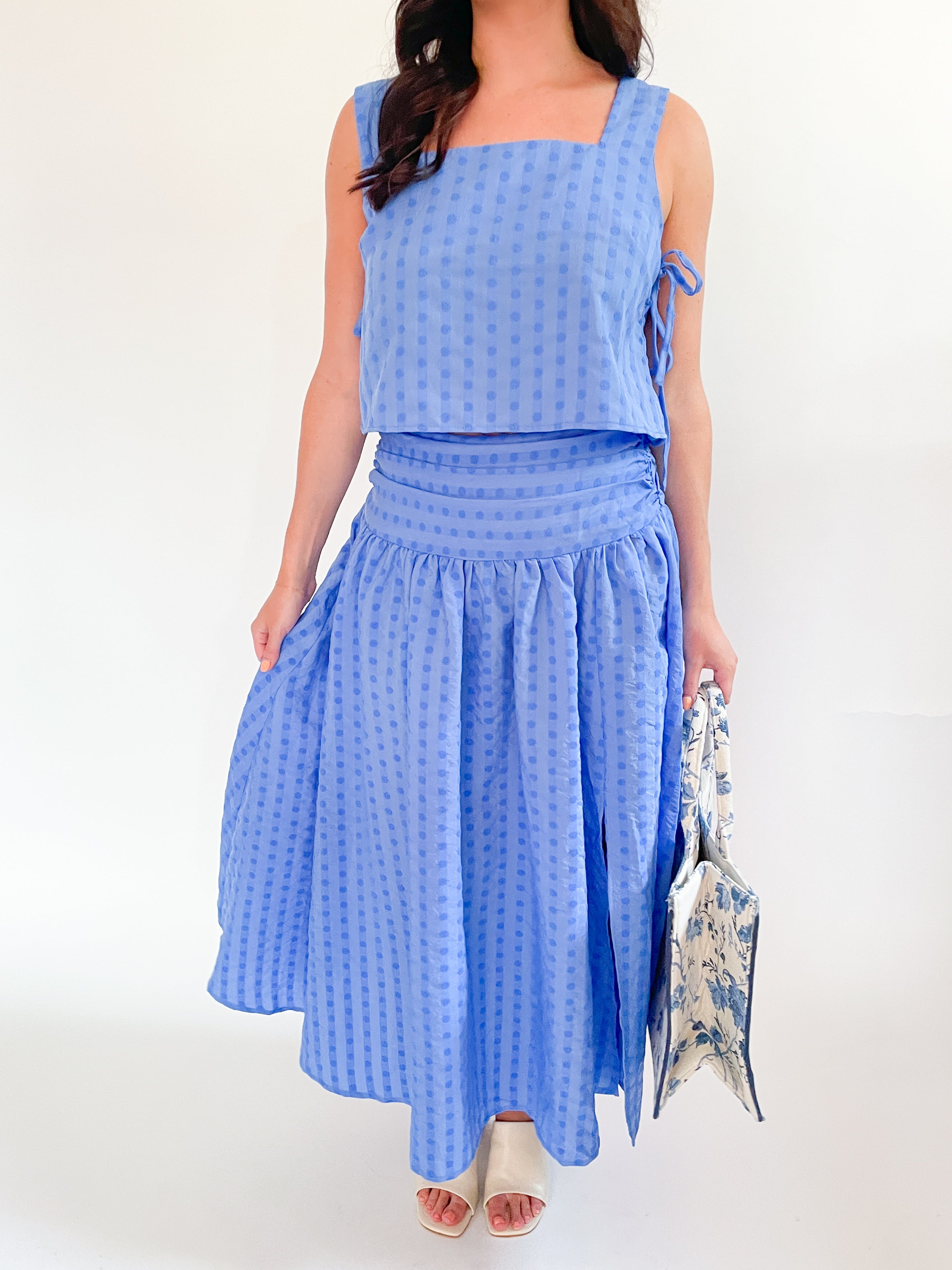 Wow in our Bailey Top and Skirt Set! This textured woven duo combines a sleeveless square-neck top with a full skirt featuring a comfy shirred waistband and back zipper. Perfect for mixing, matching, and making memories!