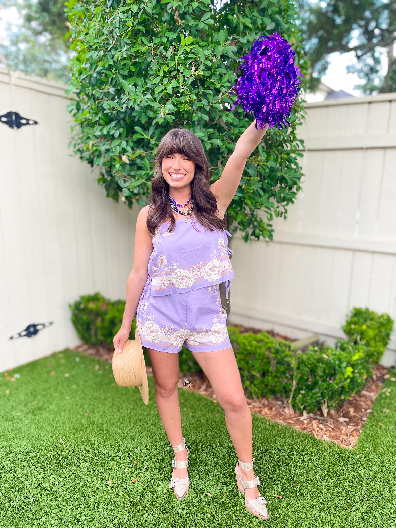 Enjoy a vibrant floral border print with this charming crop top featuring adjustable side self ties for a perfect fit. Paired with matching shorts, this set is fully lined to ensure comfort and style all day long. Ideal for sunny days and casual outings, it brings a fresh and playful vibe to your wardrobe!