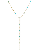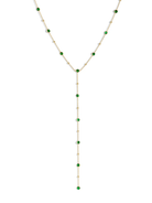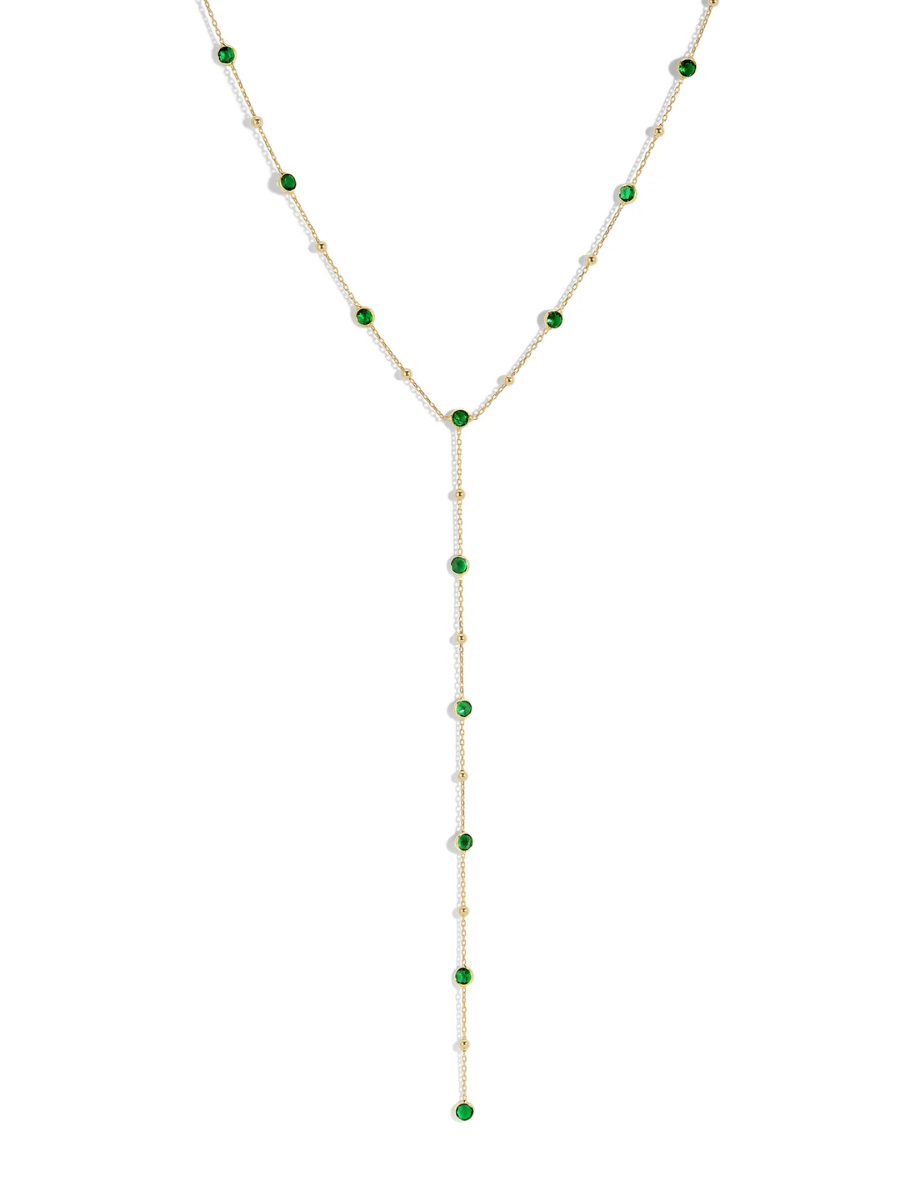 Elevate your style with this stunning emerald bezel gemstone lariat—a piece that commands attention with its rich, jewel-toned stones set against delicate gold chain work. The graceful drop design complements any neckline beautifully, whether you're stacking it with other pieces or letting it shine on its own. Perfect for anyone who loves a touch of regal glamour with a contemporary twist, this necklace brings that coveted luxury feel to your everyday wardrobe and special occasions alike.