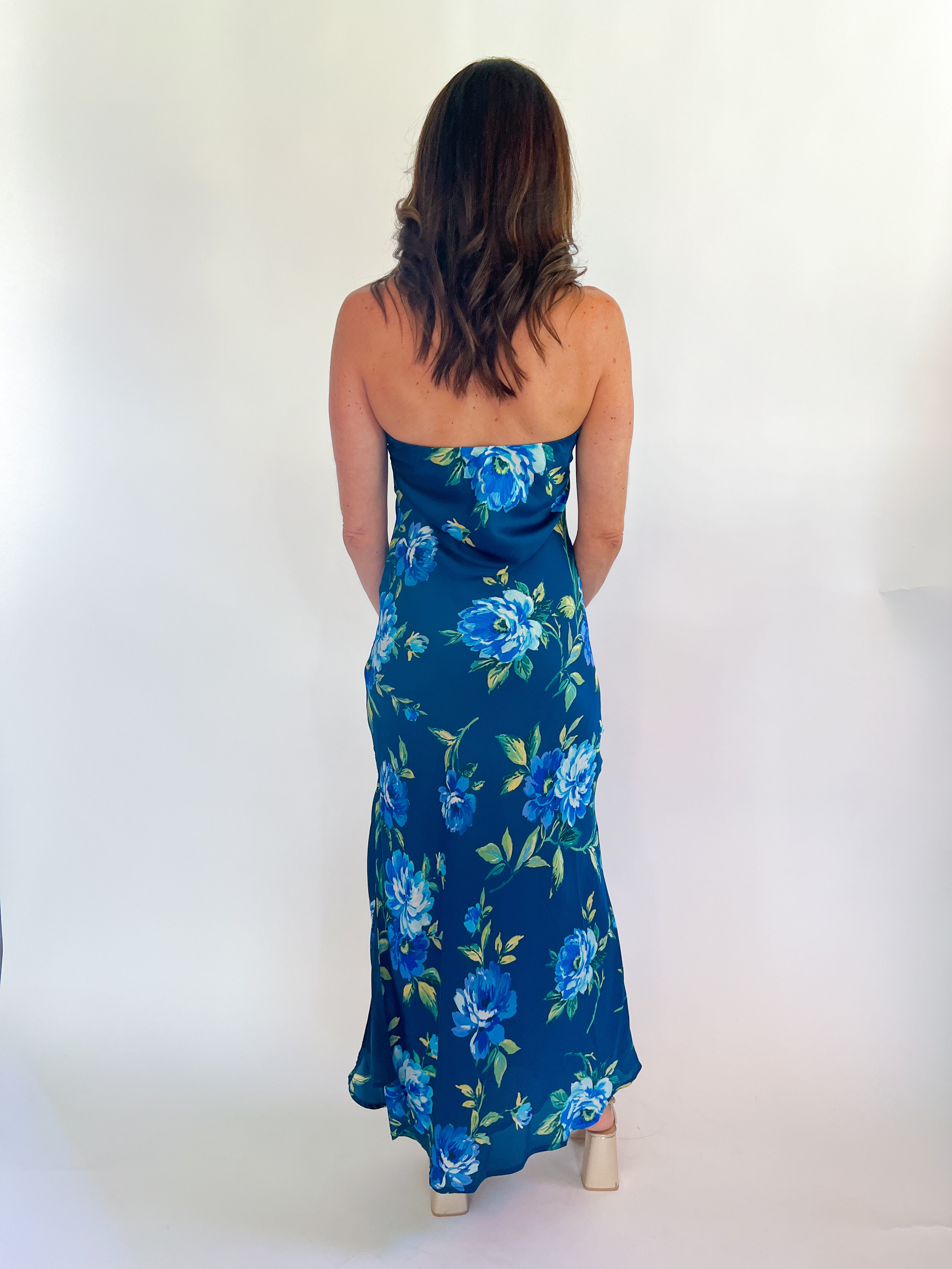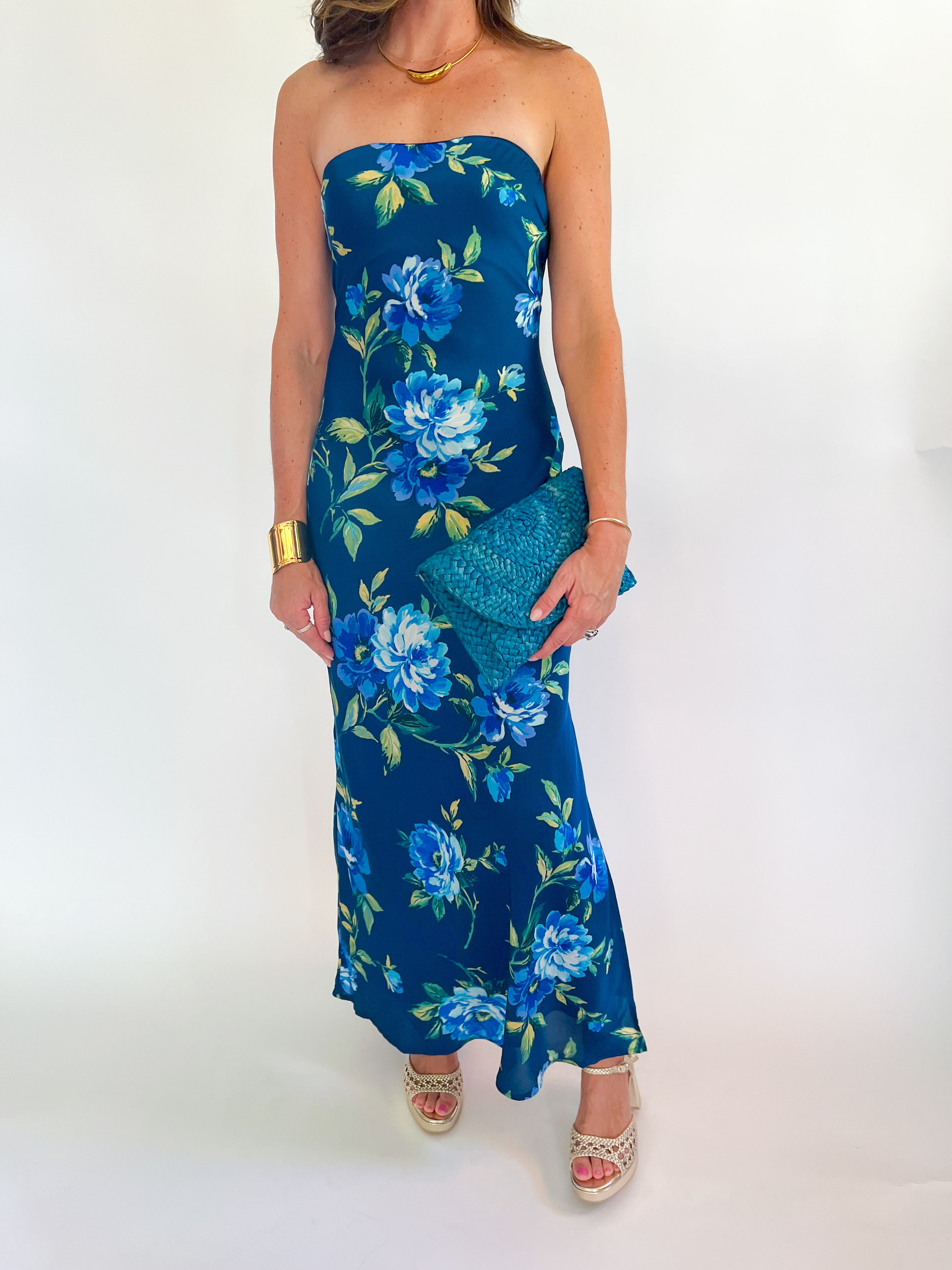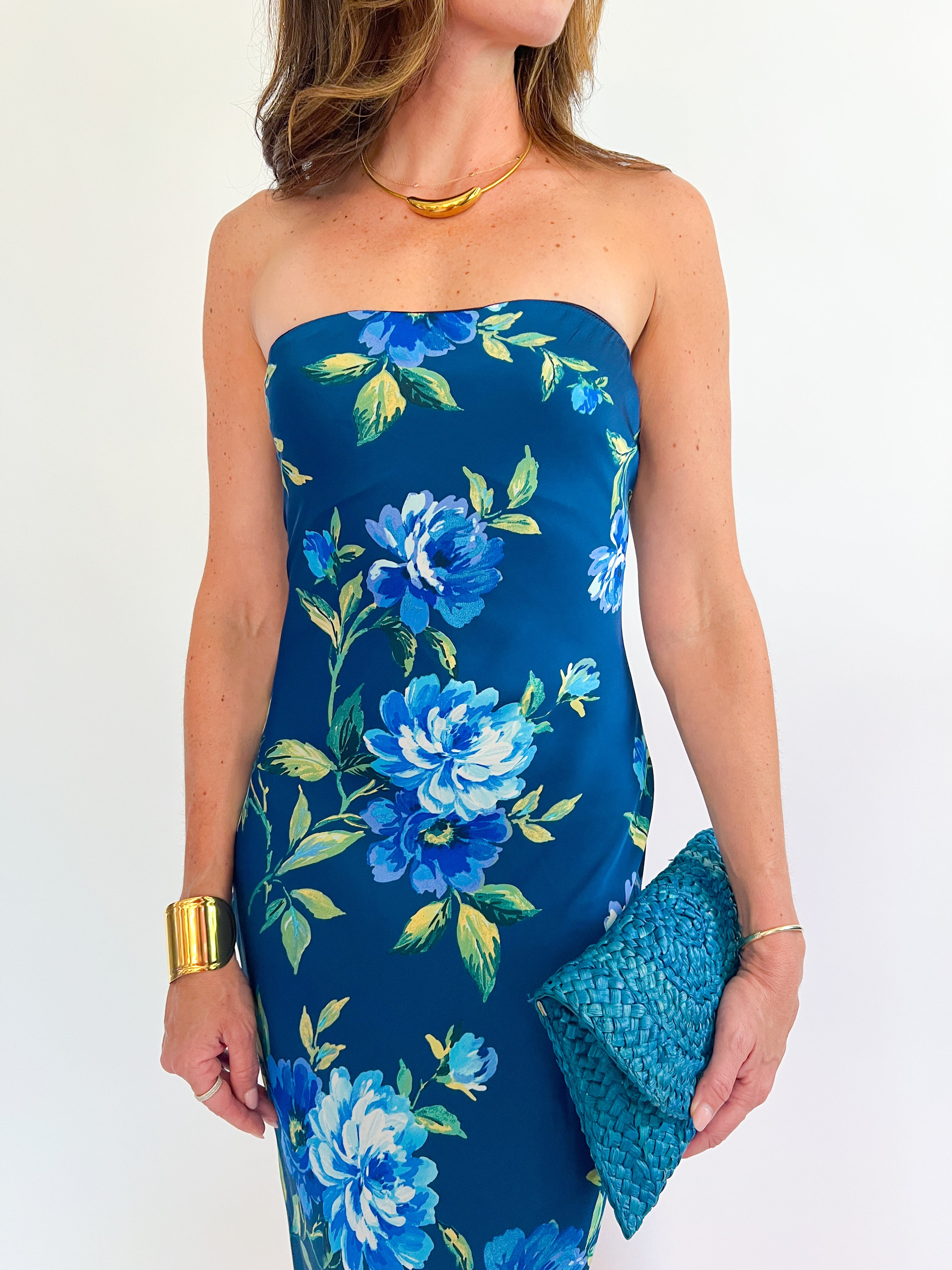 This strapless maxi dress showcases a beautiful floral satin print and features an elastic band with gel grip tape along the neckline for a secure fit. The bias cut adds a touch of stretch, while a side slit brings a hint of allure, making it perfect for your next special occasion.