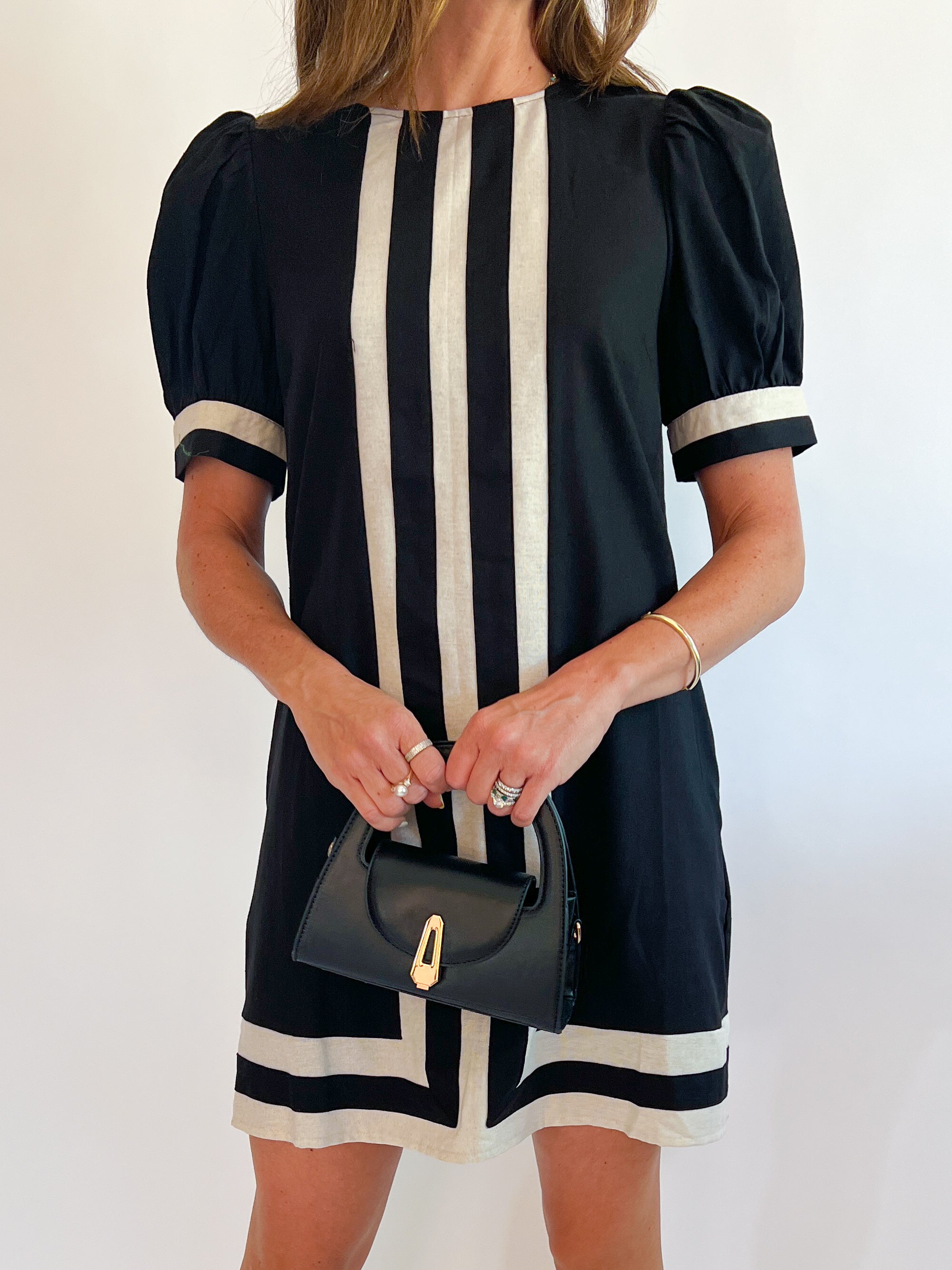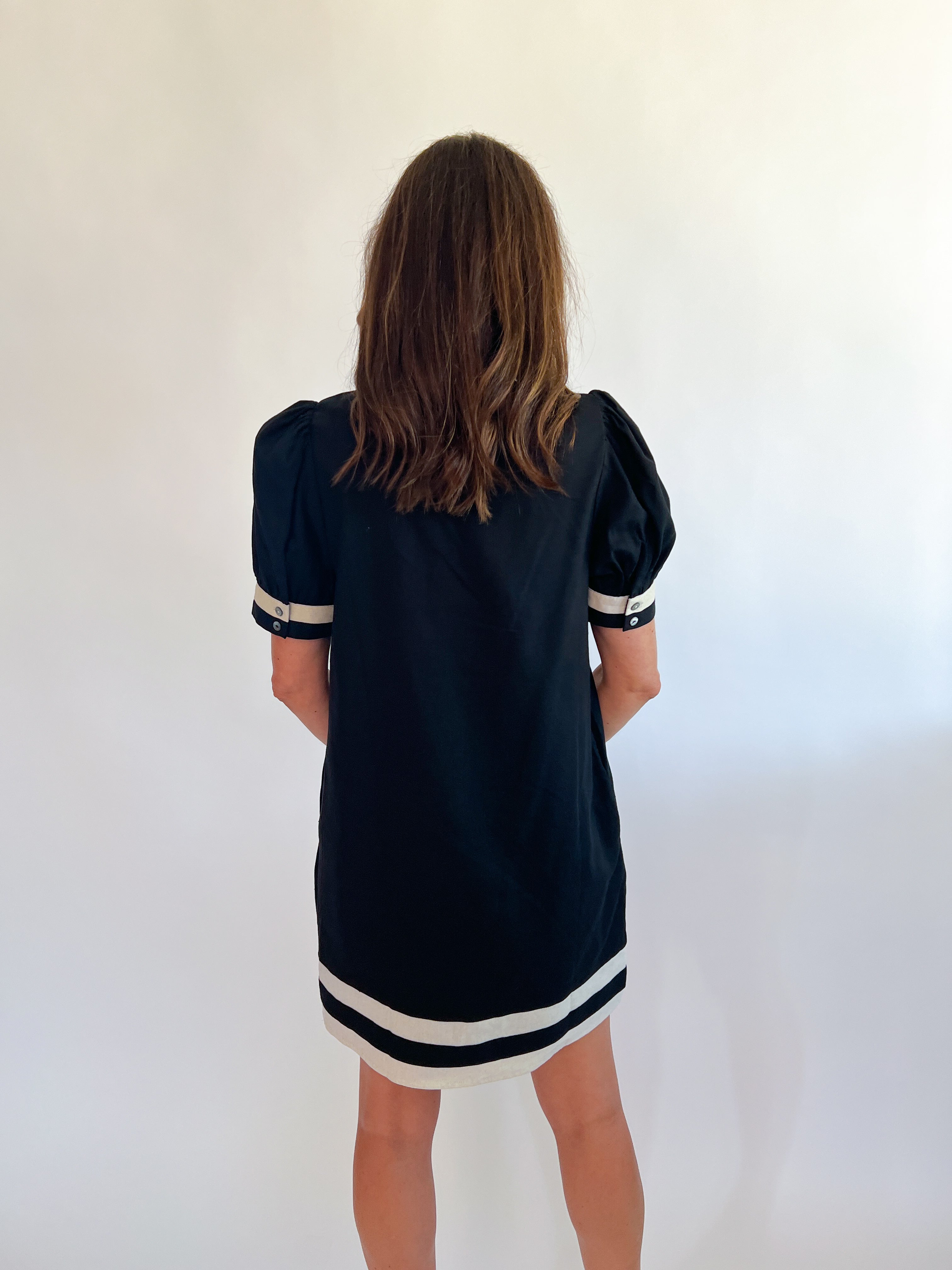 The Penny Contrast Mini Dress offers a solid color with playful short puff sleeves and a striking contrast border. It features a single-button keyhole closure at the back and handy side pockets. Made from lightweight woven fabric, this lined dress provides a comfortable, non-sheer fit perfect for any occasion.
