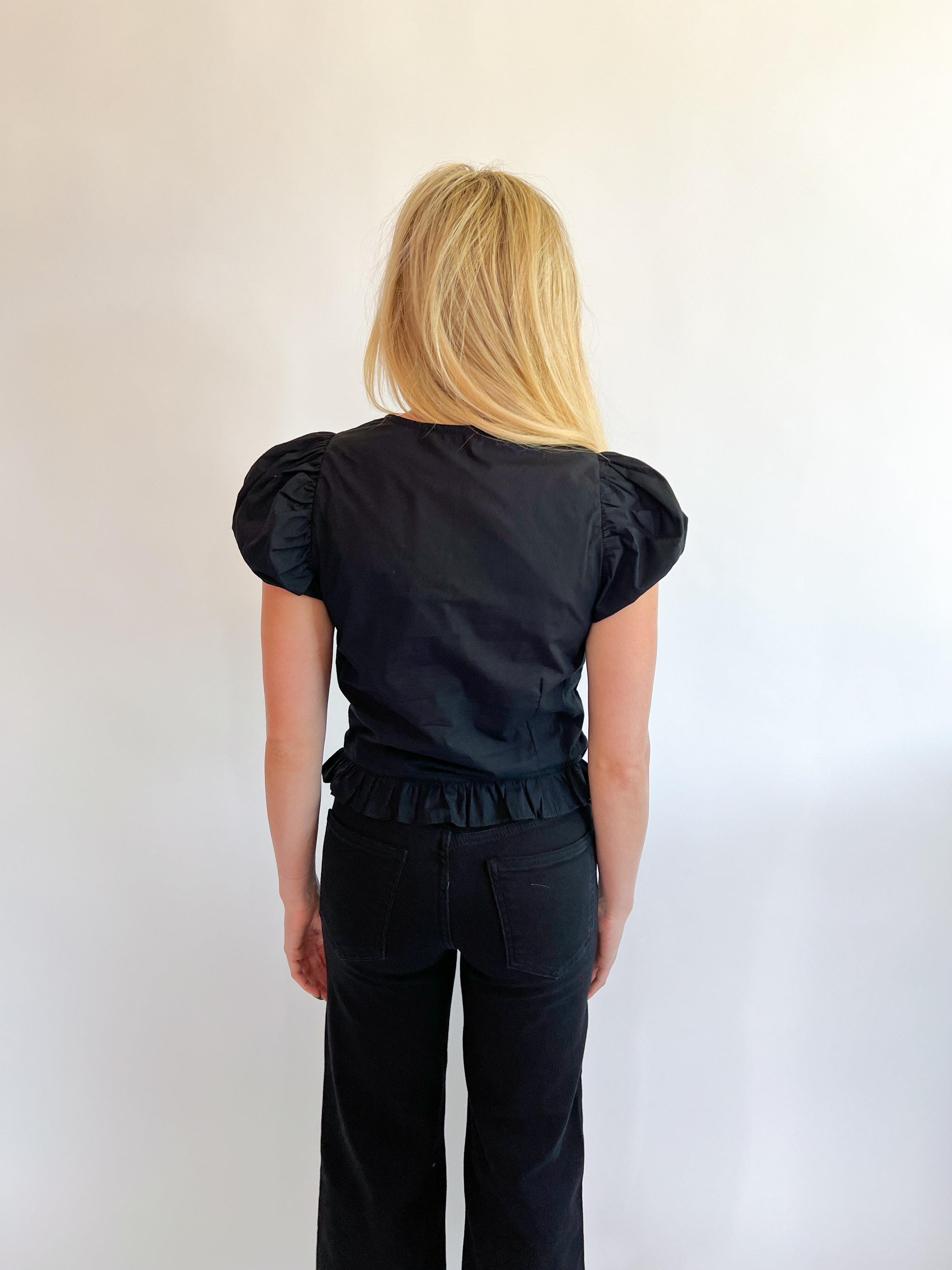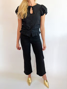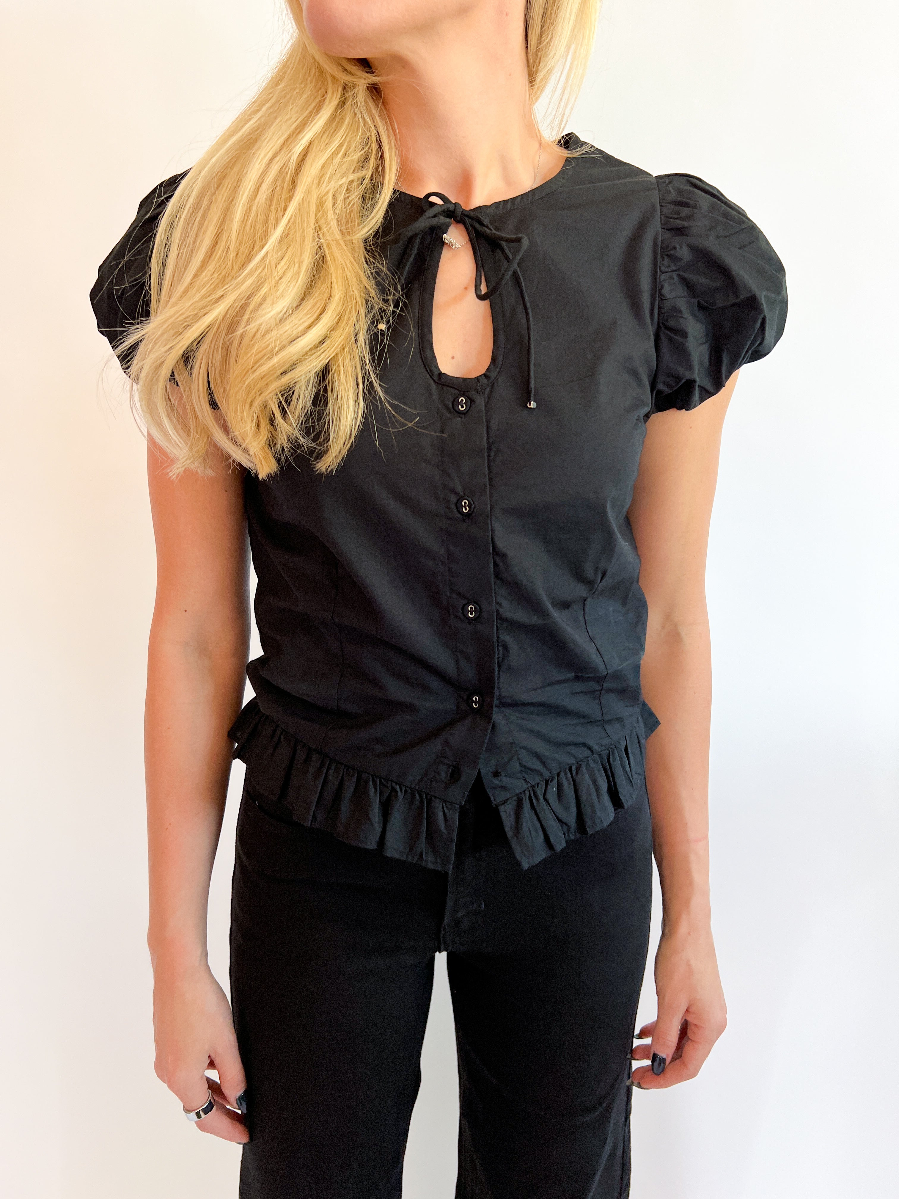 The Iridessa Top is crafted from lightweight fabric and offers a round neckline with charming self-ties, short bubble sleeves, and a button-front closure. It has a classic fit and is unlined for easy, breezy wear.