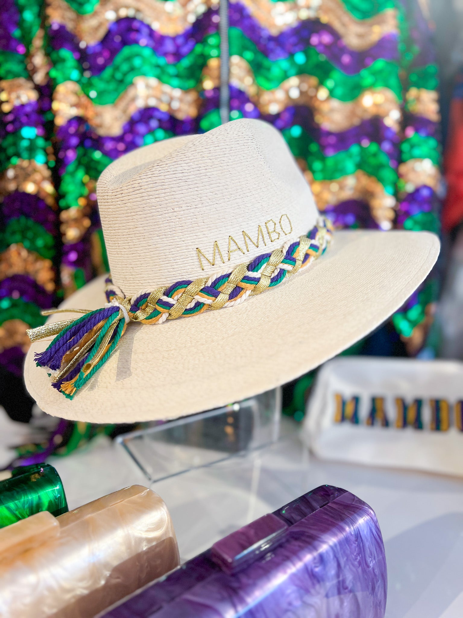 Get ready to party with our Mambo Mardi Gras Hats! Featuring a vibrant multicolor braided band, these hats will make you stand out in the crowd and add a touch of fun to any celebration. Perfect for music festivals, parades, or any festive occasion. Let the good times roll with Mambo!