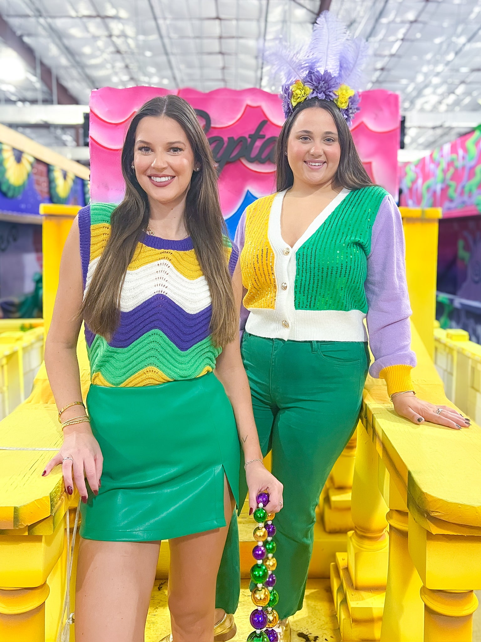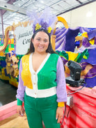 Celebrate the spirit of New Orleans with this show-stopping Mardi Gras Color Block Sequin Sweater Cardigan! Featuring vibrant jewel tones in a bold color-block design, this piece is adorned with shimmering sequins that catch the light with every move. Perfect for festival season, holiday parties, or whenever you want to add some festive flair to your wardrobe. The cozy cardigan silhouette makes it easy to layer, while the eye-catching sequin details ensure you'll turn heads. Embrace your inner party spirit and make a statement!