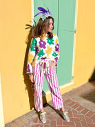 Celebrate in style with our Mardi Gras Cotton Striped Pocket Robe String Pants! Crafted from soft, breathable cotton, these vibrant striped pants feature convenient pockets and a relaxed robe-style fit perfect for lounging or festival season. The playful string waistband adjusts to your comfort, while the bold stripes capture that festive New Orleans spirit. Whether you're getting ready for the big party or keeping it cozy at home, these fun pants bring the Mardi Gras energy to your everyday wardrobe. Laissez les bons temps rouler!
