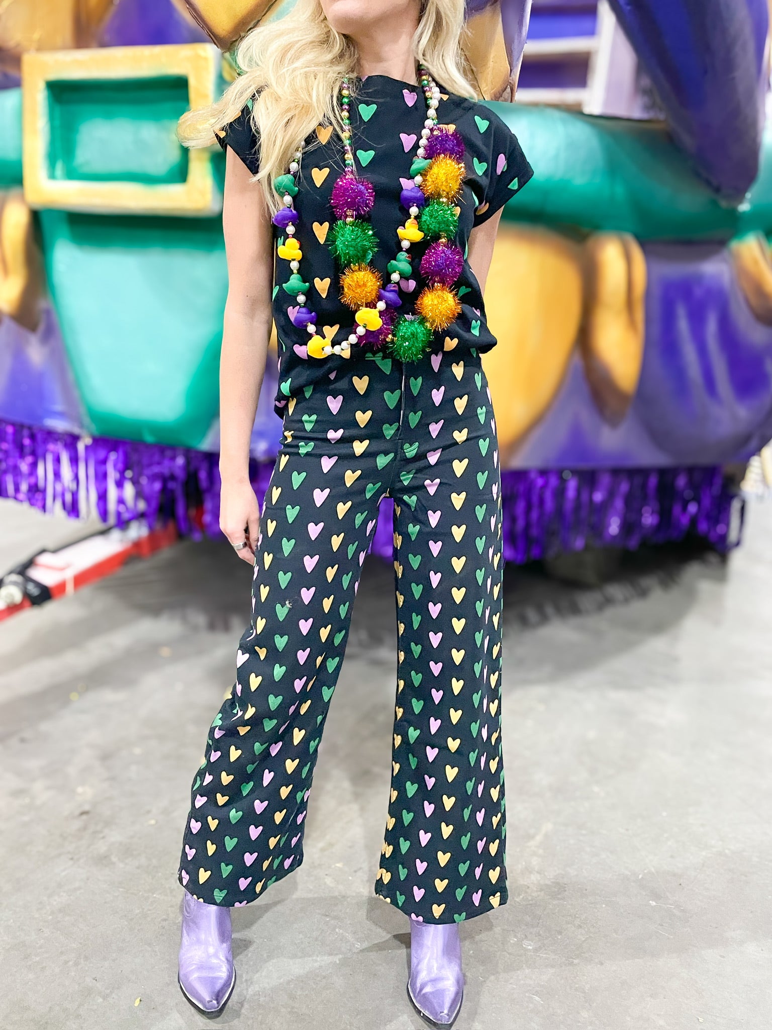 Celebrate the spirit of New Orleans in these vibrant Mardi Gras Heart Jeans! Featuring playful heart designs that capture the joy and romance of the season, these jeans blend classic denim comfort with festive flair. Perfect for parade season or any occasion where you want to show your NOLA pride, they're a must-have for locals and visitors alike. Dress them up with heels for a night out on Bourbon Street or keep it casual for everyday wear. Get ready to turn heads and spread the Mardi Gras magic!