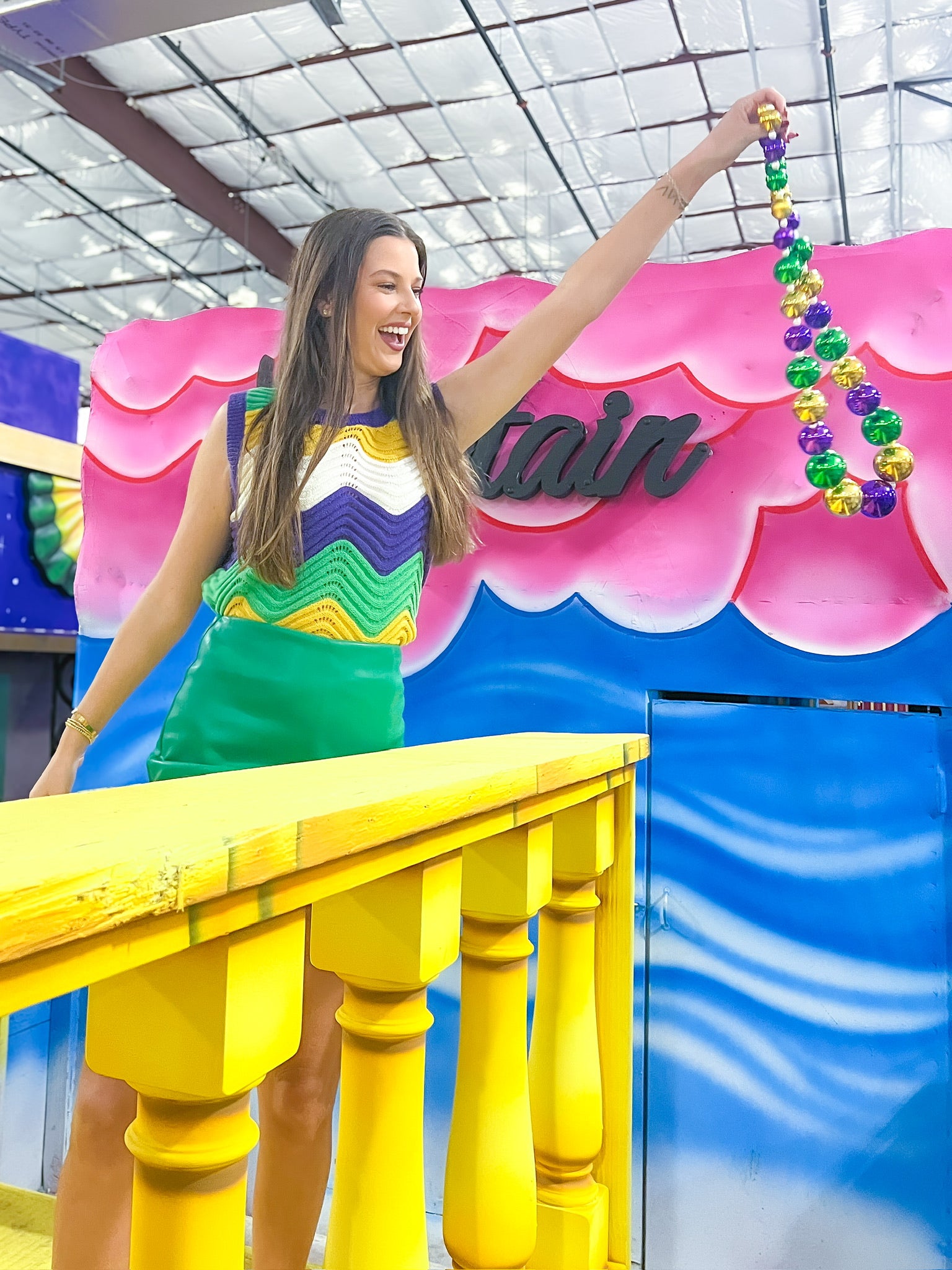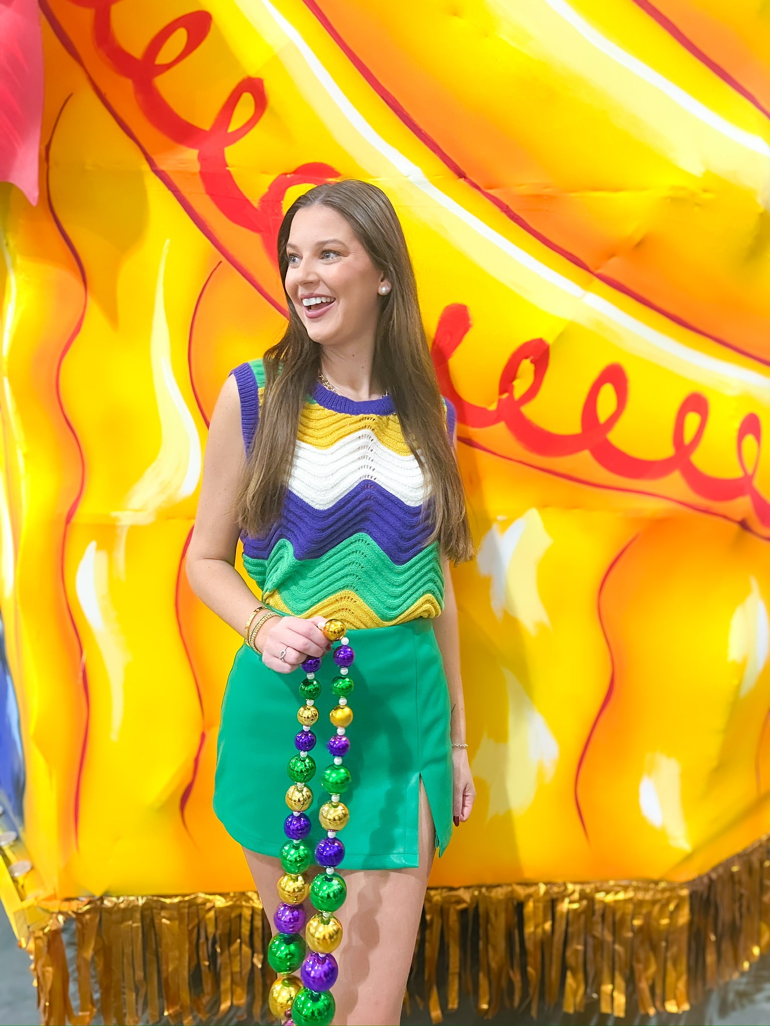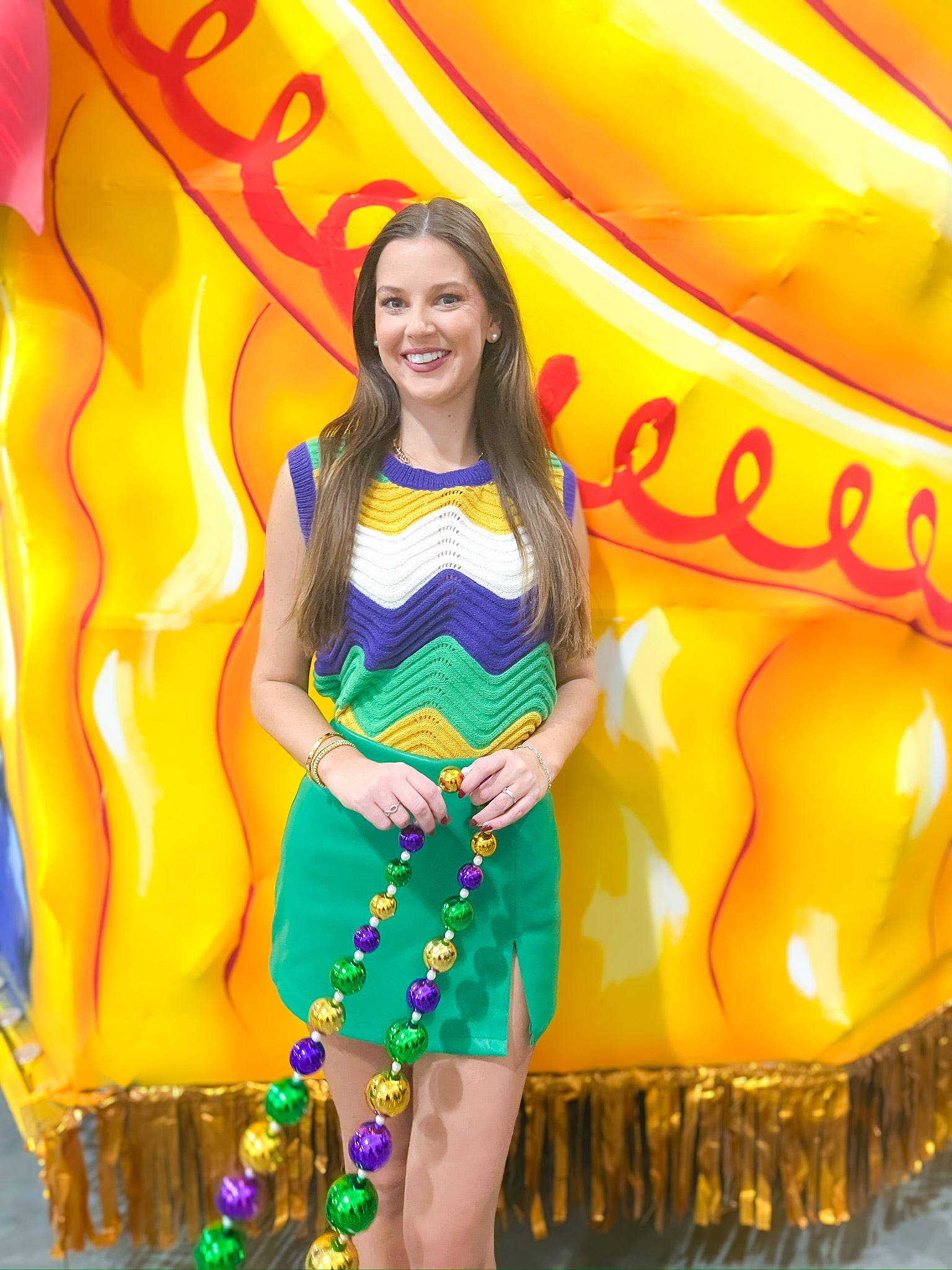 Celebrate the spirit of New Orleans with this vibrant Mardi Gras Wavy Sweater Tank! Featuring eye-catching colors and a playful wavy design, this piece captures the festive energy of the season. The lightweight sweater tank is perfect for layering or wearing solo, making it ideal for parades, parties, or everyday wear. Whether you're a local or visiting the Big Easy, this tank brings that iconic Mardi Gras magic to your wardrobe. Get ready to turn heads and spread the joy!