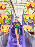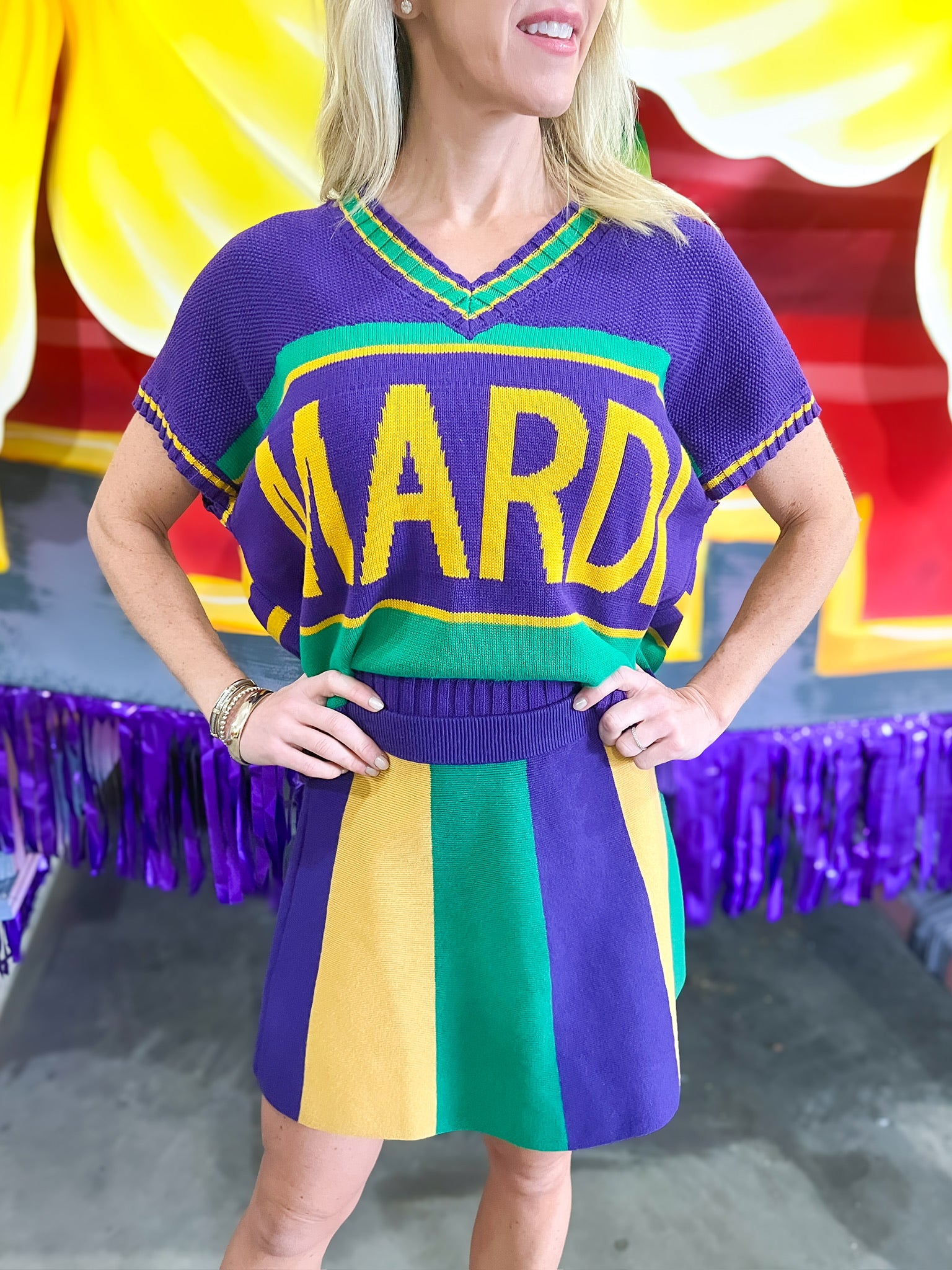Celebrate the spirit of New Orleans with this vibrant Mardi Gras Stripe Sweater Mini Skirt! Featuring bold, festive stripes in classic carnival colors, this playful piece brings instant personality to your wardrobe. The cozy sweater knit construction offers comfort while the flirty mini silhouette keeps things fun and flirty. Perfect for holiday parties, Mardi Gras festivities, or whenever you want to add a pop of color and joy to your look. Dress it up with heels or keep it casual with sneakers—this versatile skirt is ready for whatever adventure awaits!