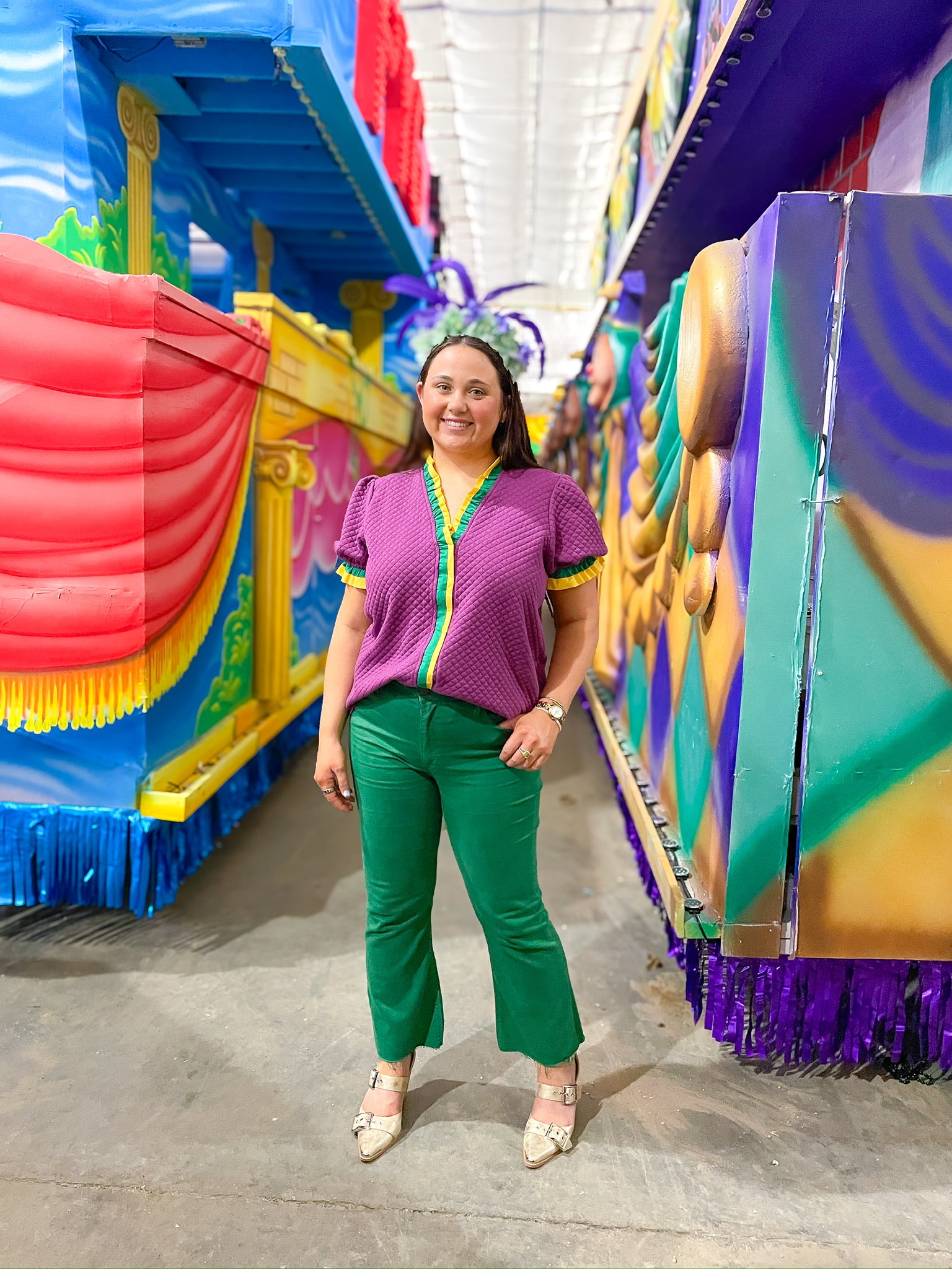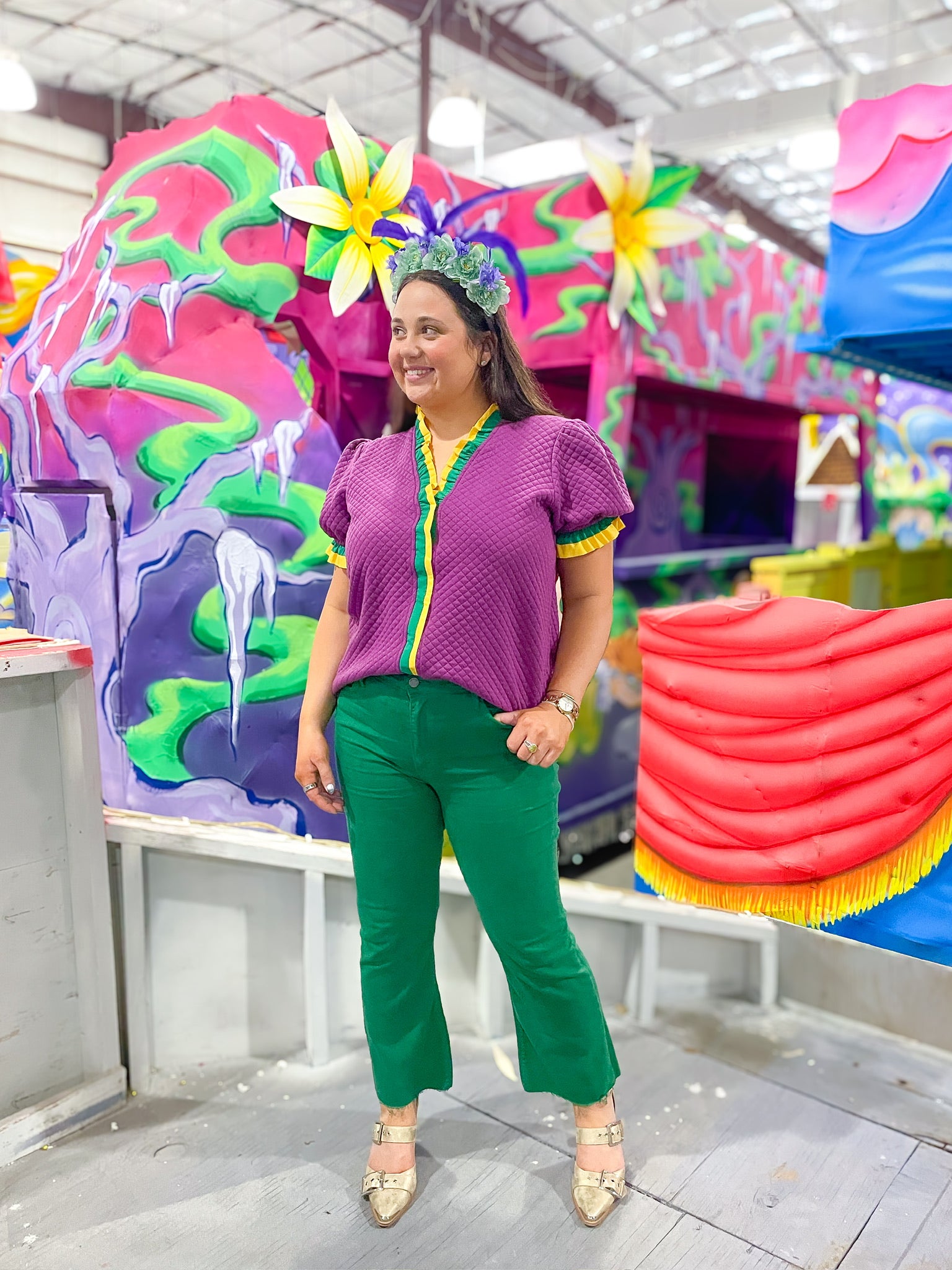 Celebrate the spirit of New Orleans with this show-stopping Mardi Gras top! Featuring dramatic ruffled edges and voluminous puff sleeves, it's the perfect statement piece for festival season or any occasion calling for bold style. The playful silhouette brings instant personality to your wardrobe while the eye-catching design ensures you'll turn heads. Whether you're dancing through the streets or making an entrance at a party, this top delivers festive flair with undeniable charm. Get ready to embrace the magic!