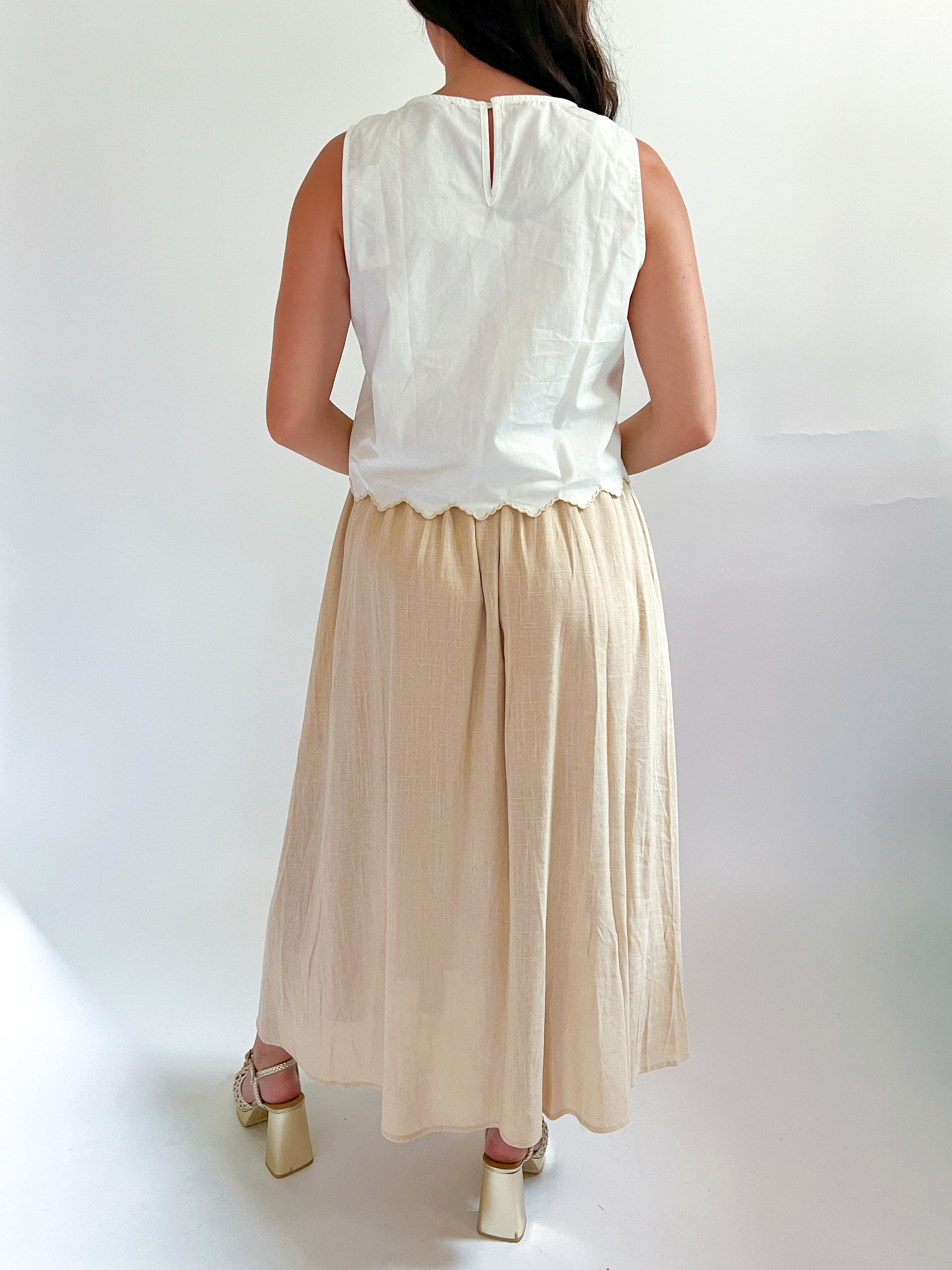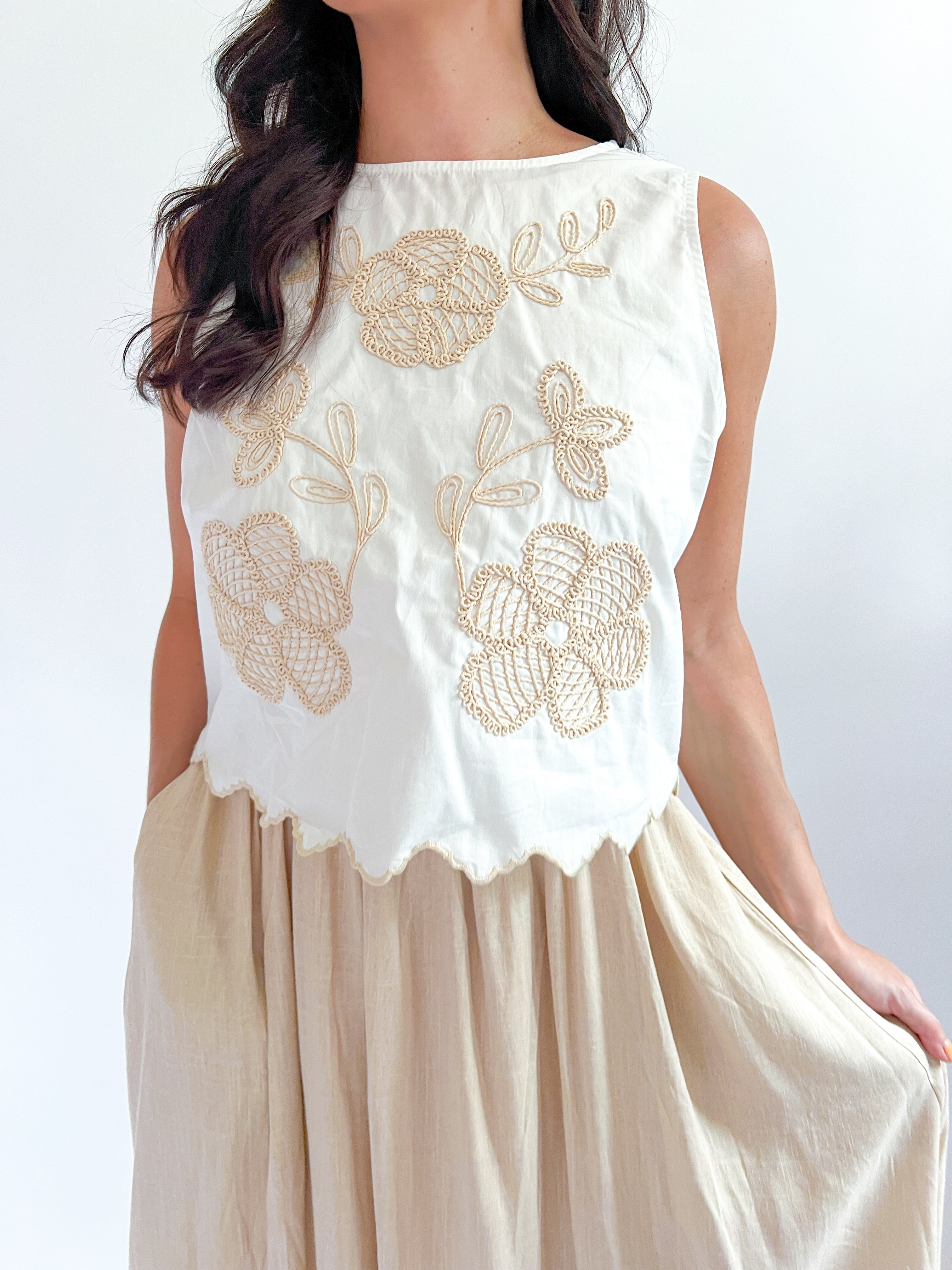 Floral embroidery sleeveless midi dress in viscose linen blend fabric. This long sundress style features a overlay scallop crop top with floral embroidered work, a shirred A line midi skirt, lining, side pockets, lining, elasticated waist, and keyhole with button closure at back.