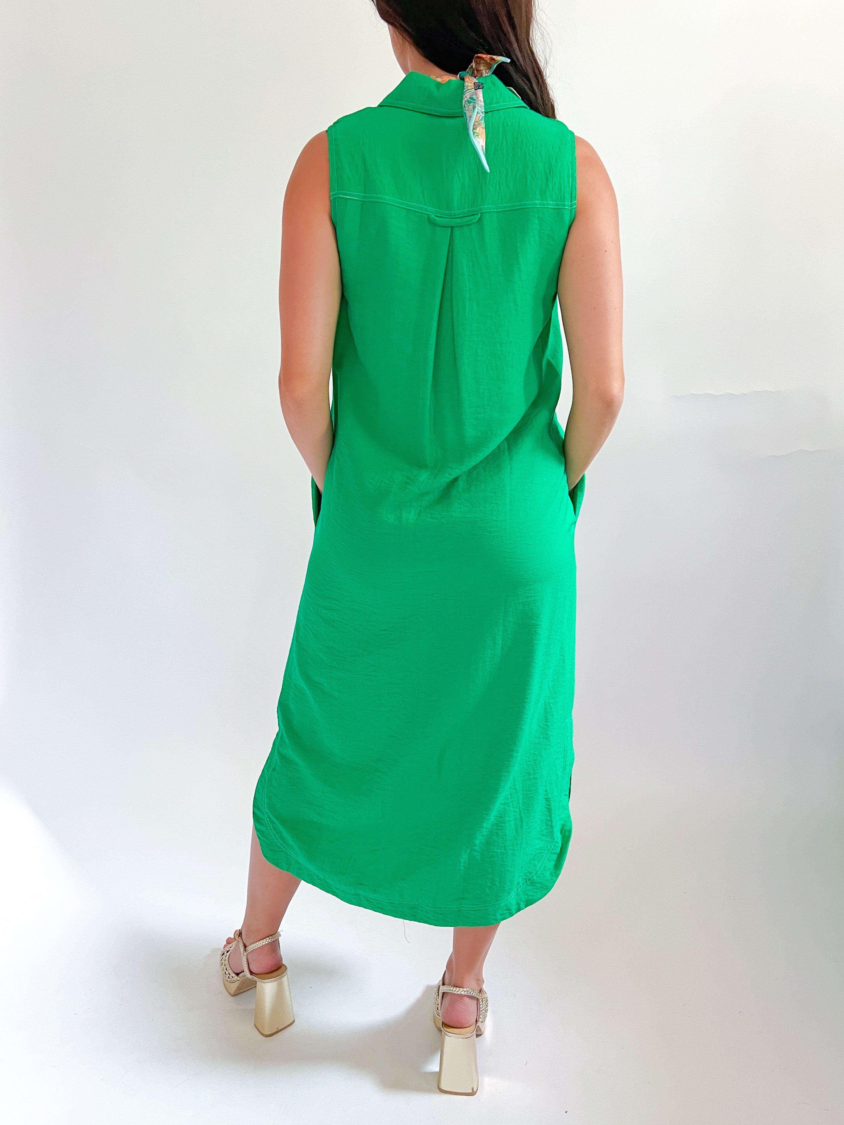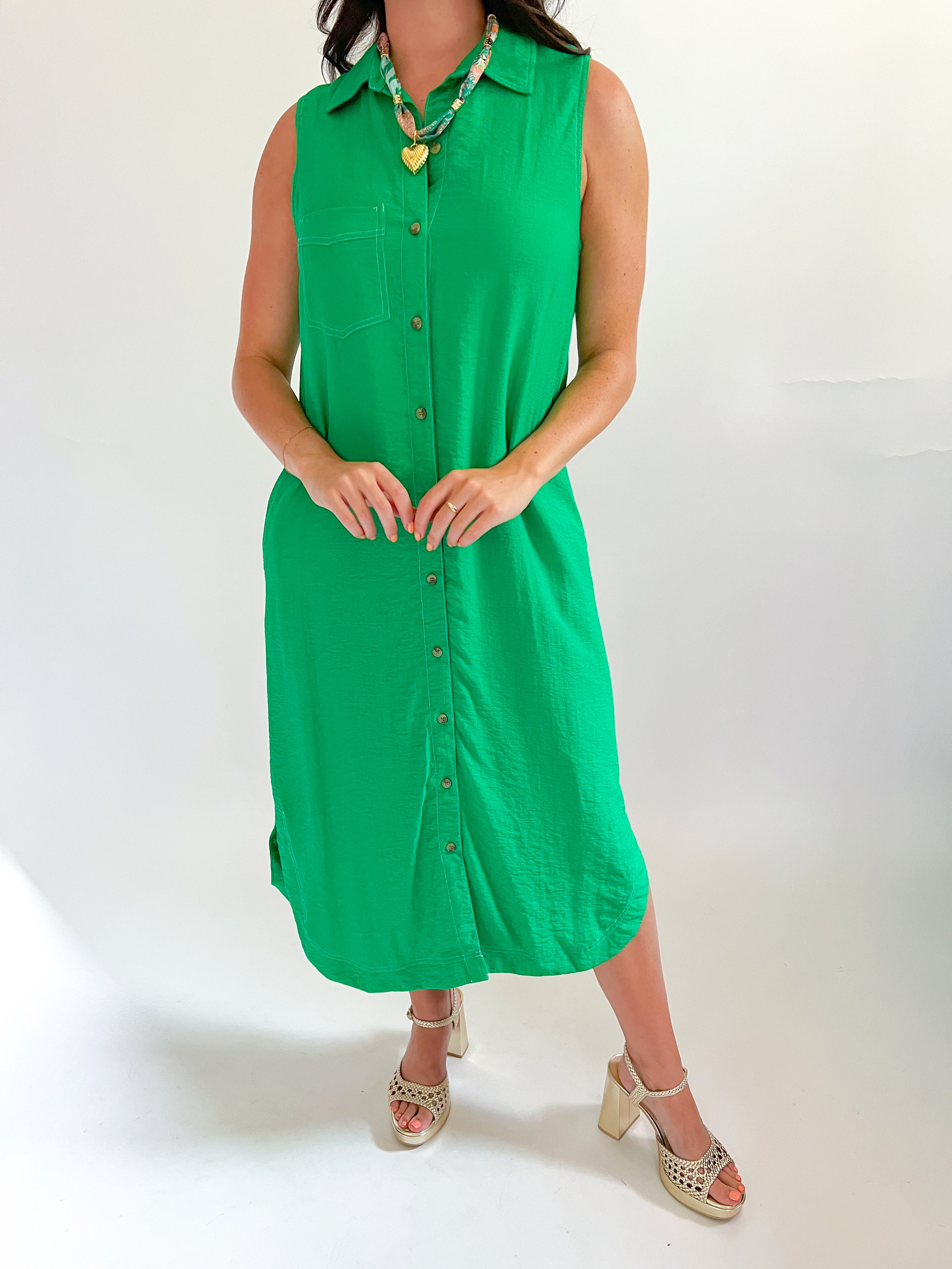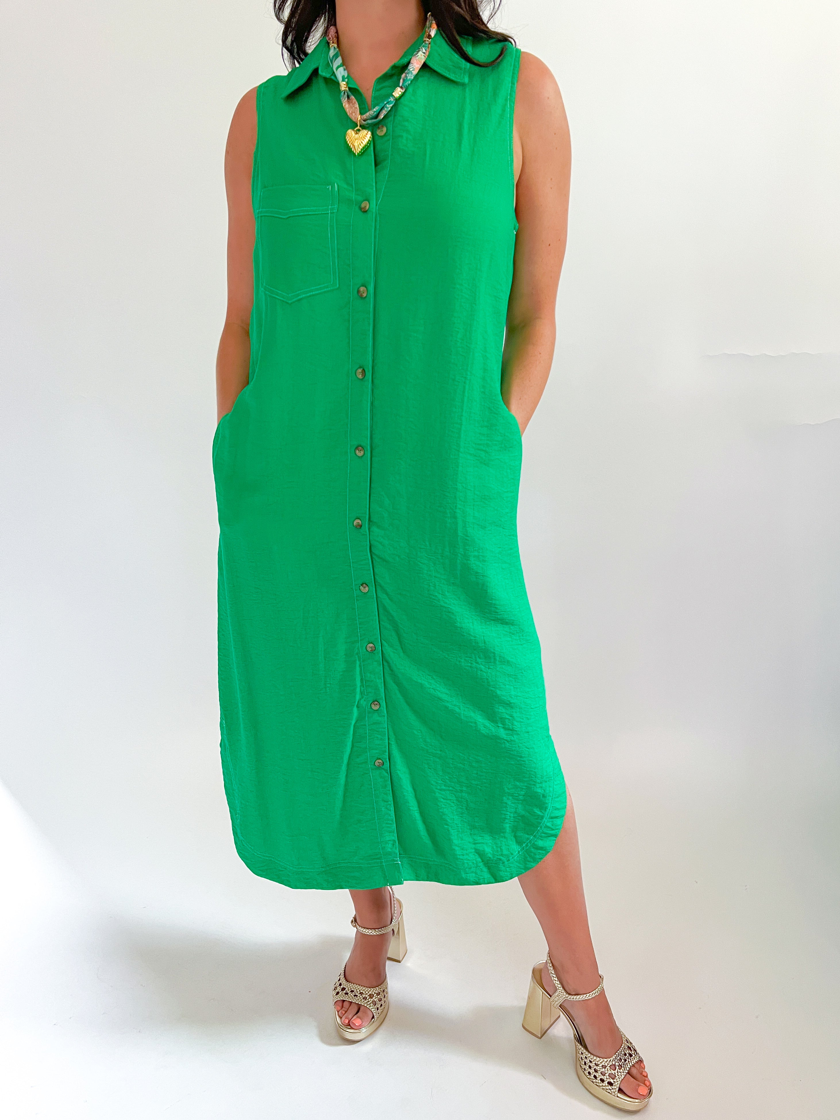 Introducing the stunning Solid Collar Midi Dress - a button front, sleeveless, round hem shirt dress with pockets at the sides. This fully lined, woven dress is non-sheer and lightweight, making it the perfect addition to your wardrobe!