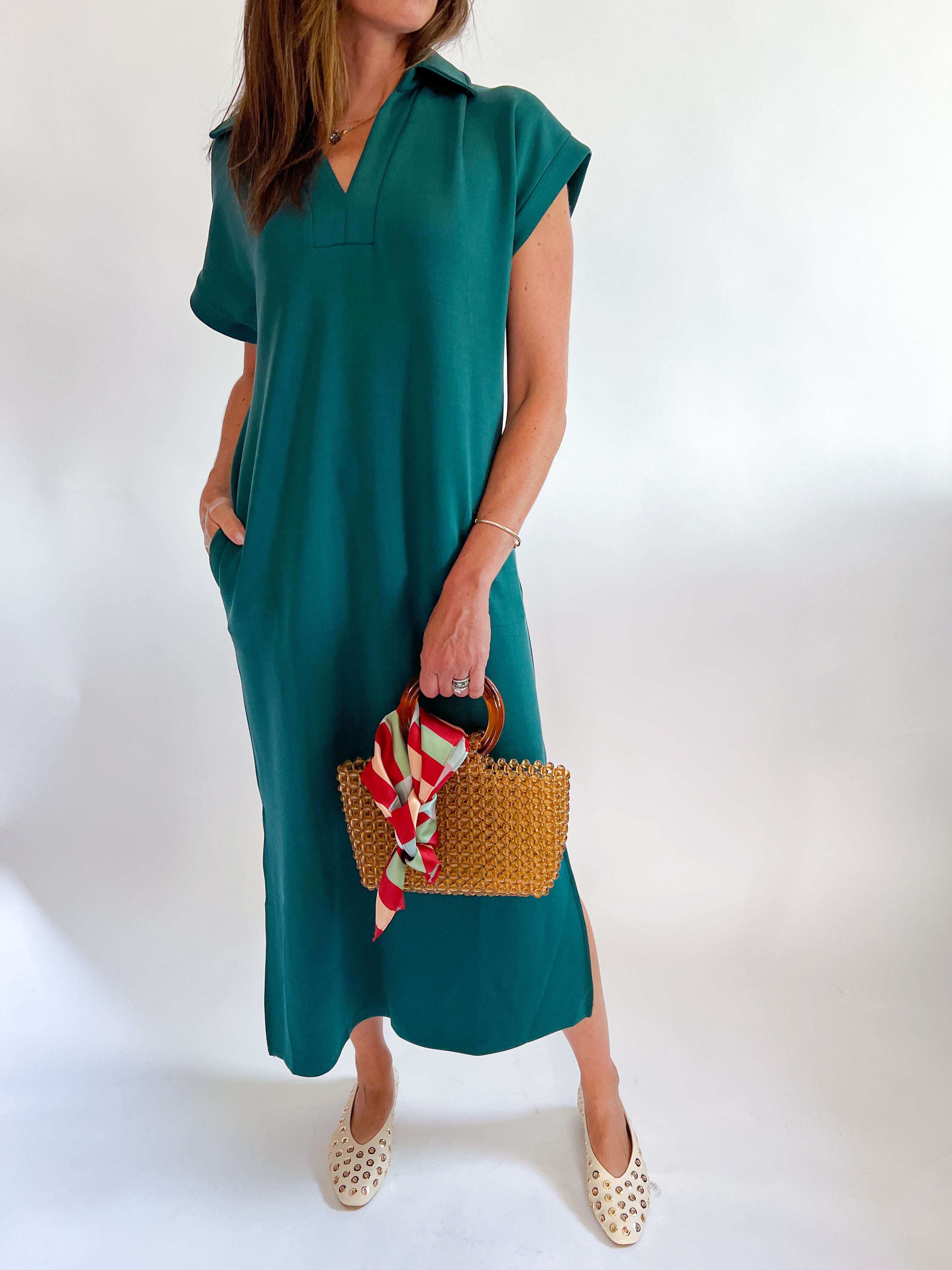 This solid knit midi dress features a split collar and short sleeves, designed as a comfortable pullover with a side slit for added style. It includes handy side pockets and is unlined, made from a lightweight, non-sheer knit fabric perfect for everyday wear.