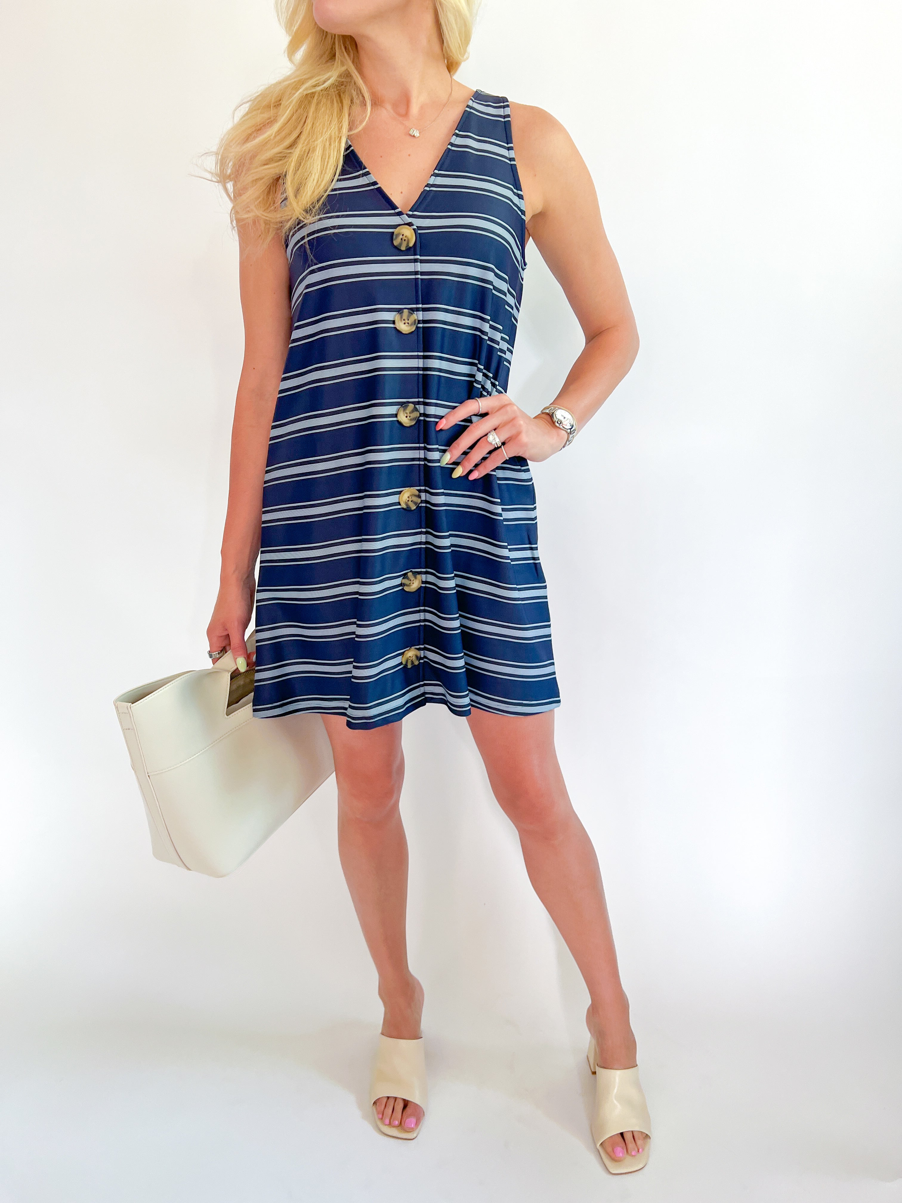 The Dorothy Stripe Mini Dress features a flattering v-neck and sleeveless design, perfect for warm days. Its button-front closure adds a charming touch, while the playful striped pattern brings a fresh, lively vibe. The mini length keeps it flirty and fun, making it an ideal choice for casual outings or weekend adventures. Embrace effortless style with this vibrant dress!