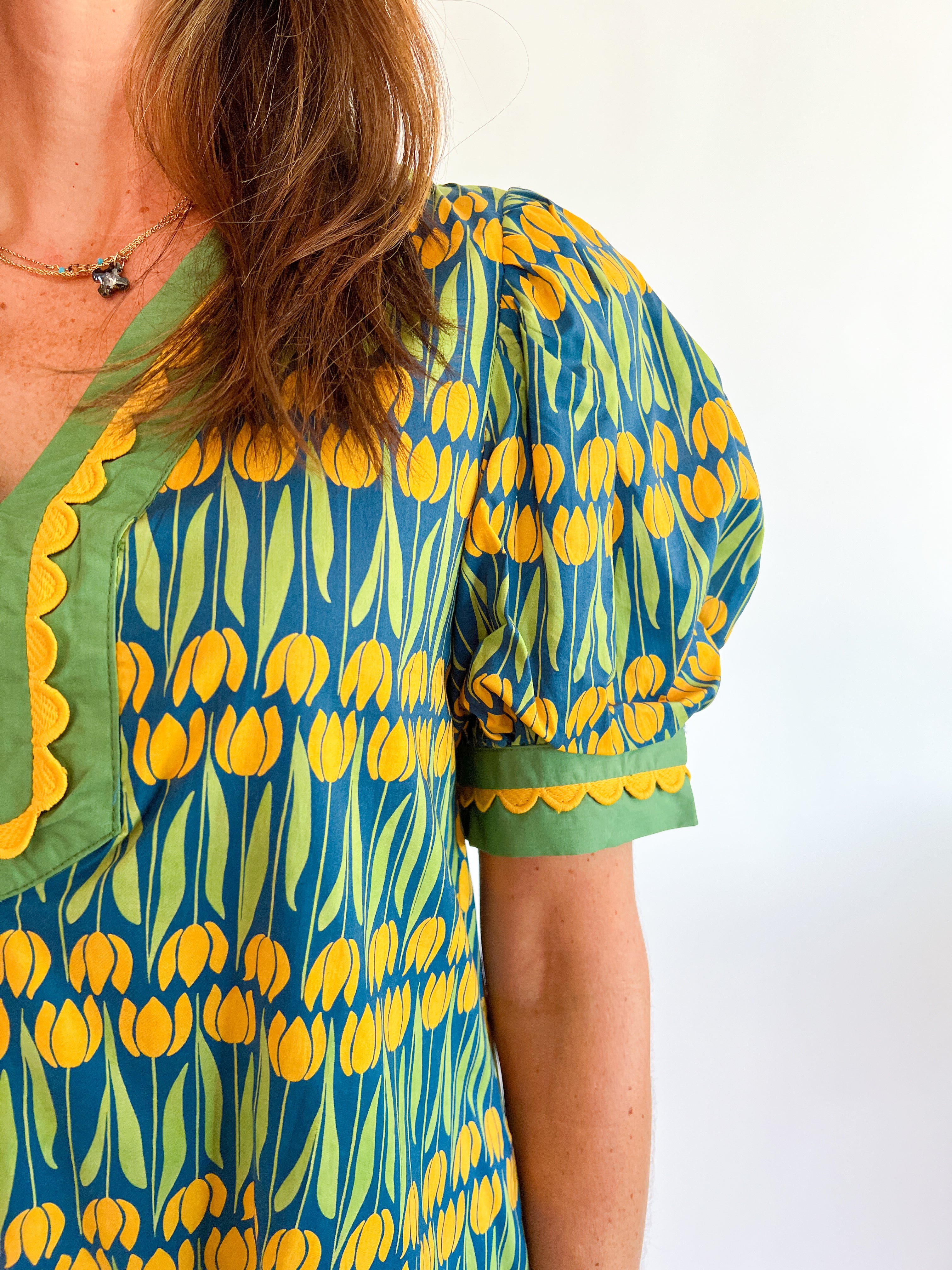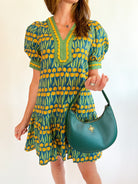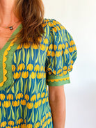 This mini dress showcases a linear floral pattern with a playful ruffle hem. It features contrast trim accents on the cuff band and a flattering V-neck detail. Complete with side pockets, it’s fully lined and made from lightweight woven fabric that’s non-sheer for easy, comfortable wear.