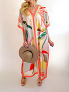 Effortless elegance meets tropical style with this stunning Exotic Leaves Caftan. Crafted from lightweight, breathable fabric, this versatile coverup transitions seamlessly from beach to poolside to casual resort wear. The flowing silhouette flatters all body types while the vibrant exotic leaf print adds an instant vacation vibe to your wardrobe. Perfect for layering over swimwear or wearing as a standalone piece, this caftan keeps you cool, comfortable, and undeniably chic. Whether you're lounging by the water or exploring a coastal destination, this timeless coverup is your go-to for effortless, stylish comfort.
