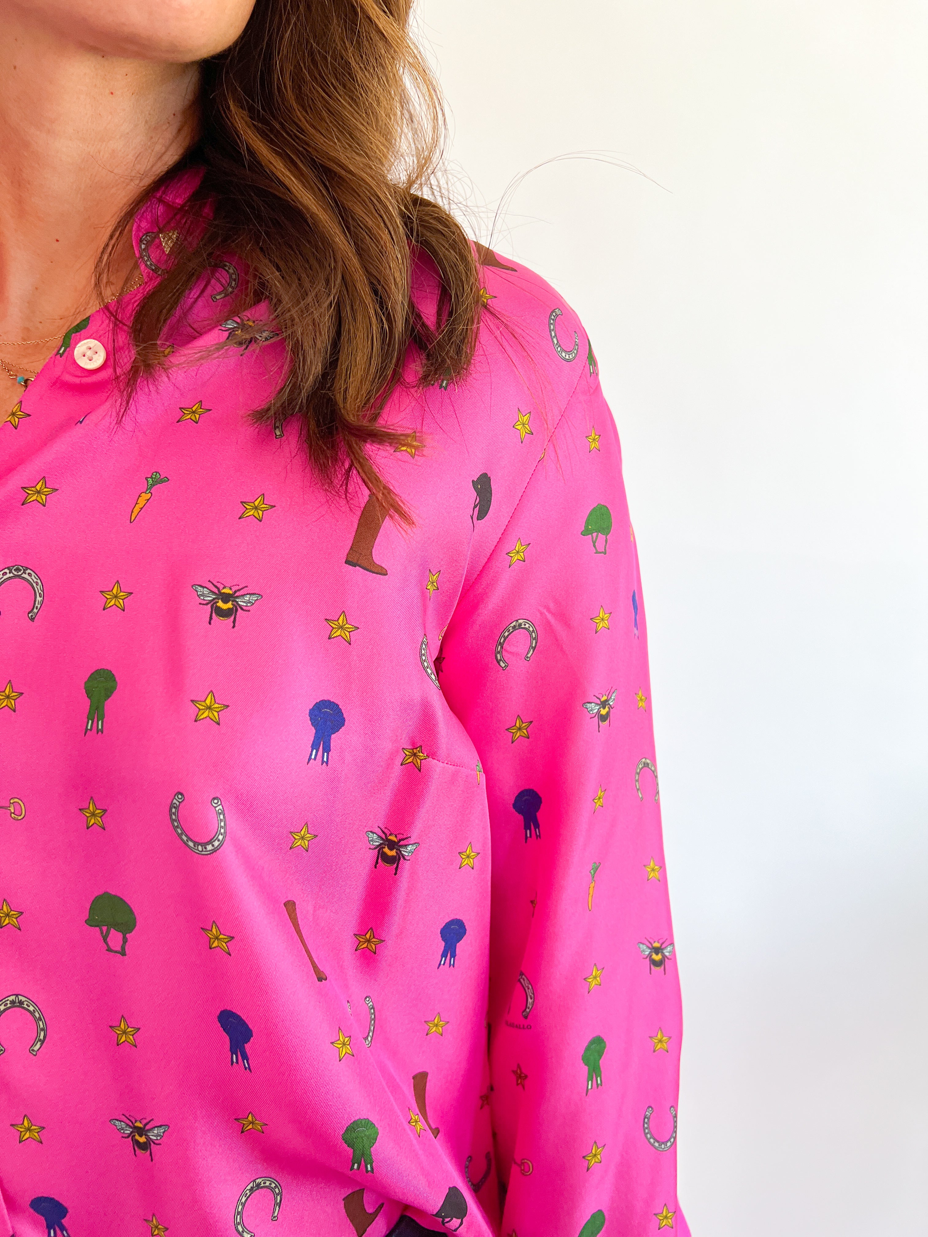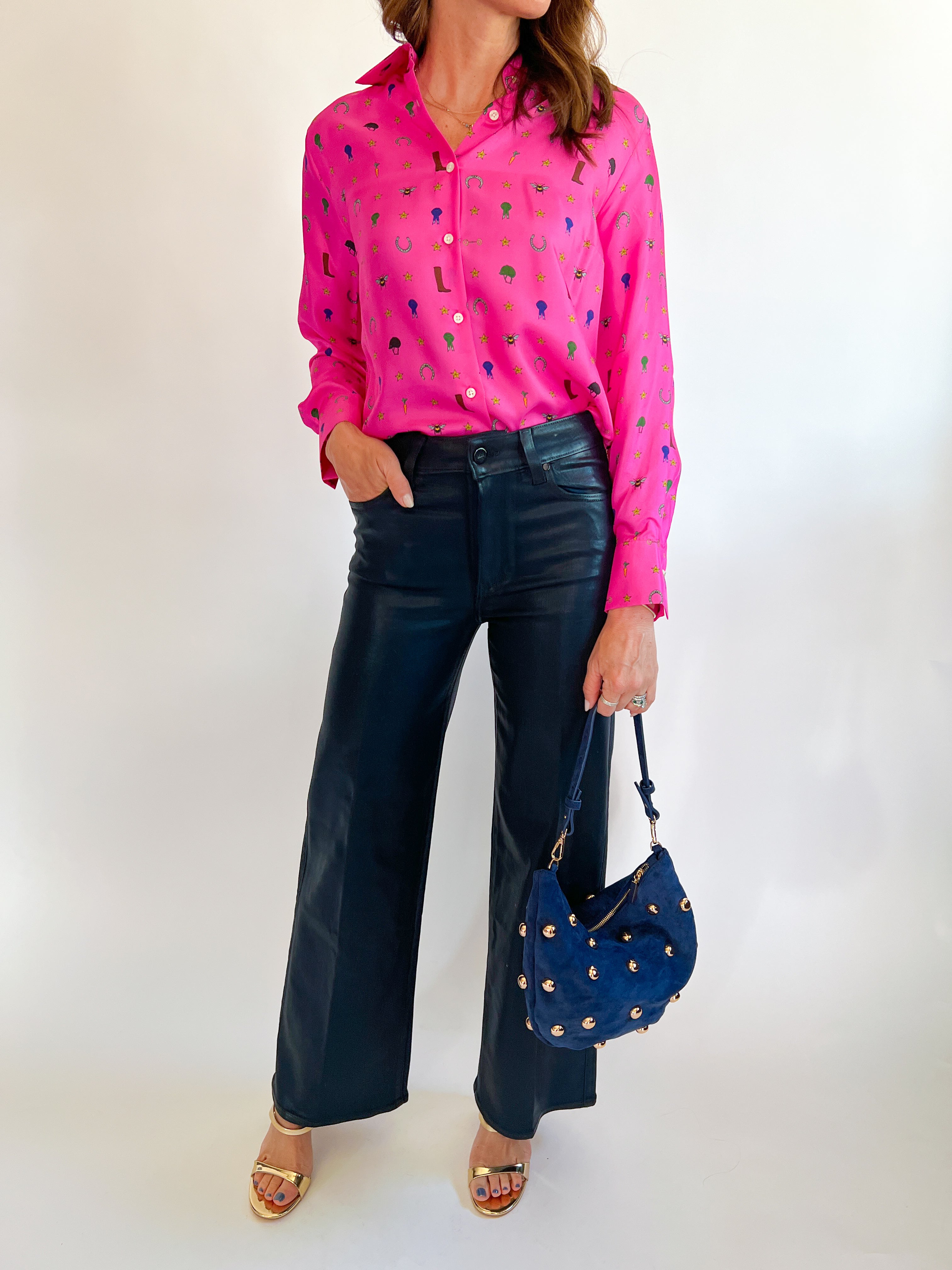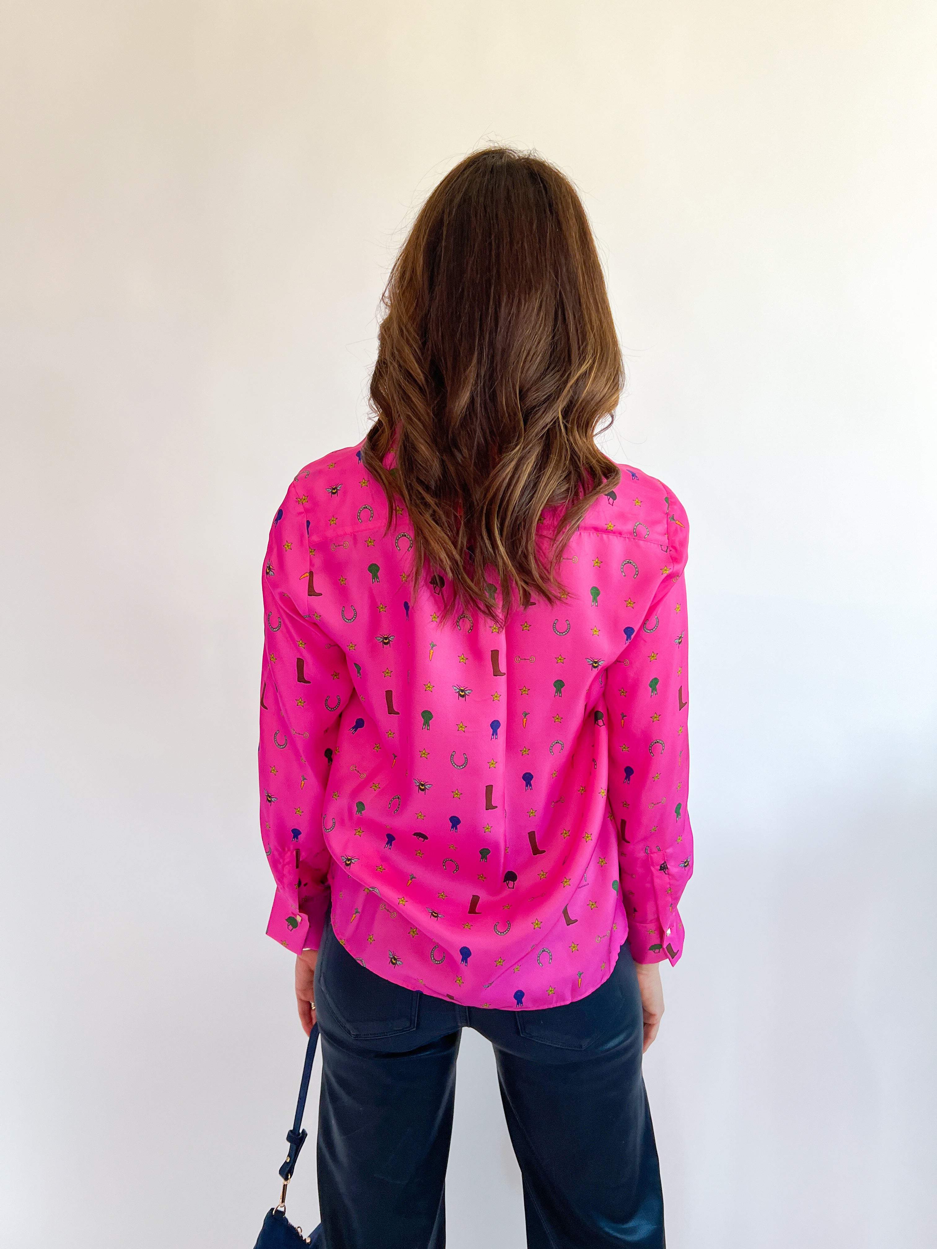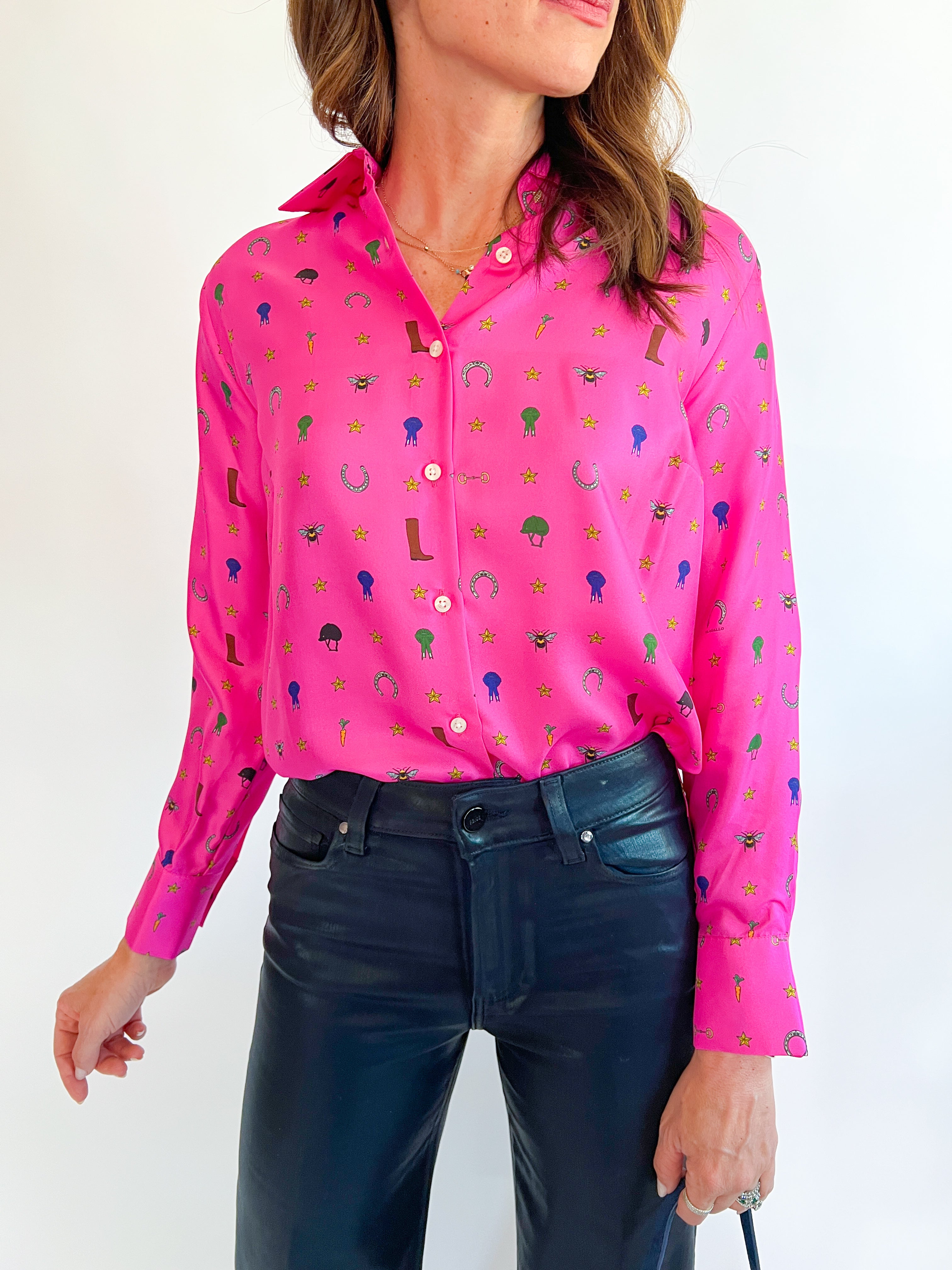 The Motivos Silk Blouse blends fun and sophistication, featuring a bright pink base decorated with horseshoes, boots, hats, and stars in lively colors. Crafted from luxurious silk, it drapes beautifully and feels incredibly soft, making it a perfect choice to add a playful, chic vibe to any dressy or relaxed ensemble.