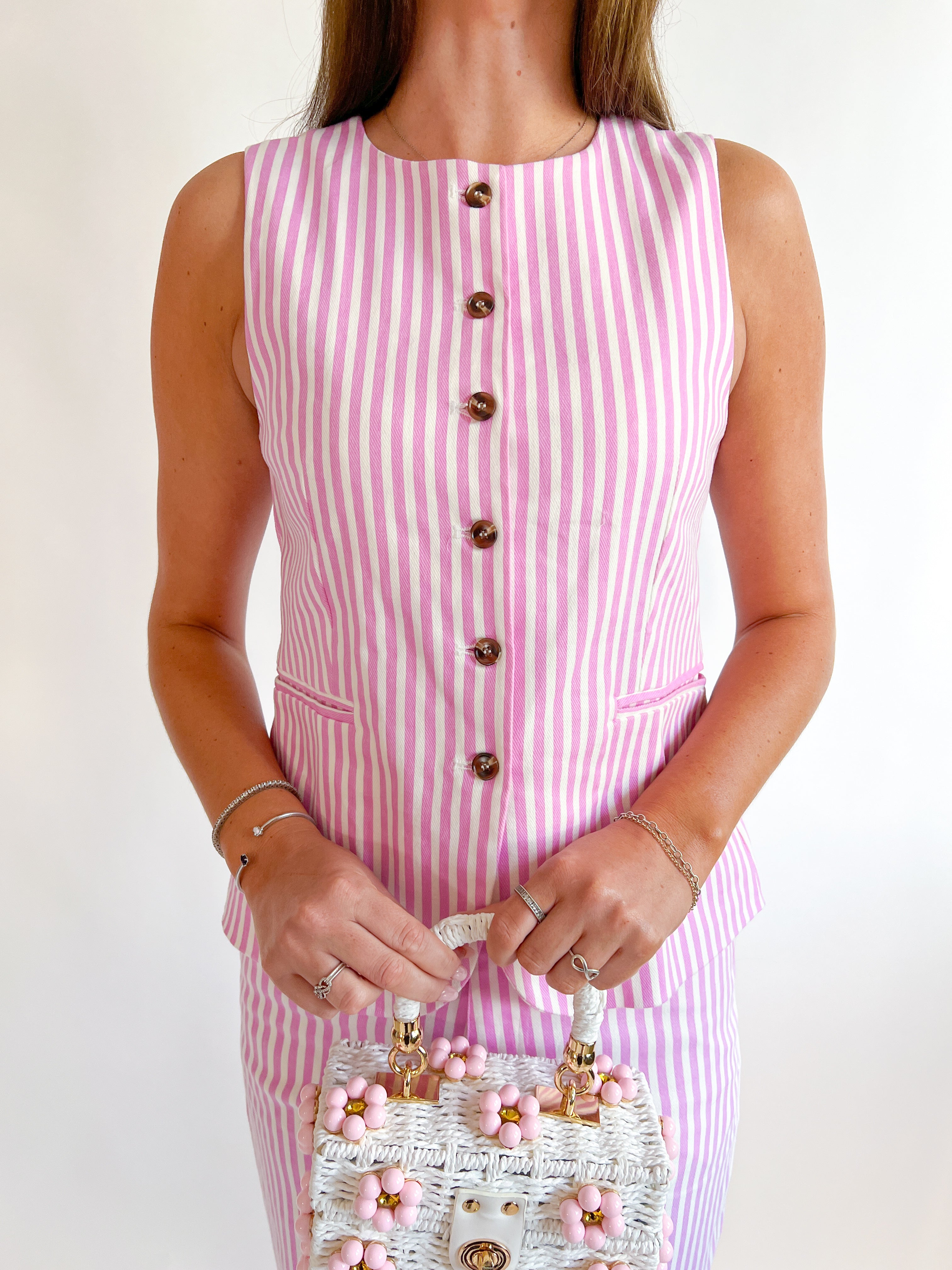 Elevate your wardrobe with this charming Pink Stripe Buttoned Vest! Perfect for layering over your favorite tees or dresses, this versatile piece brings a pop of color and preppy polish to any outfit. The classic button-front design offers easy styling, while the soft striped pattern adds visual interest without overwhelming your look. Whether you're dressing up for brunch or keeping it casual, this vest is your go-to for effortless sophistication. A must-have staple that transitions beautifully from season to season!
