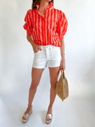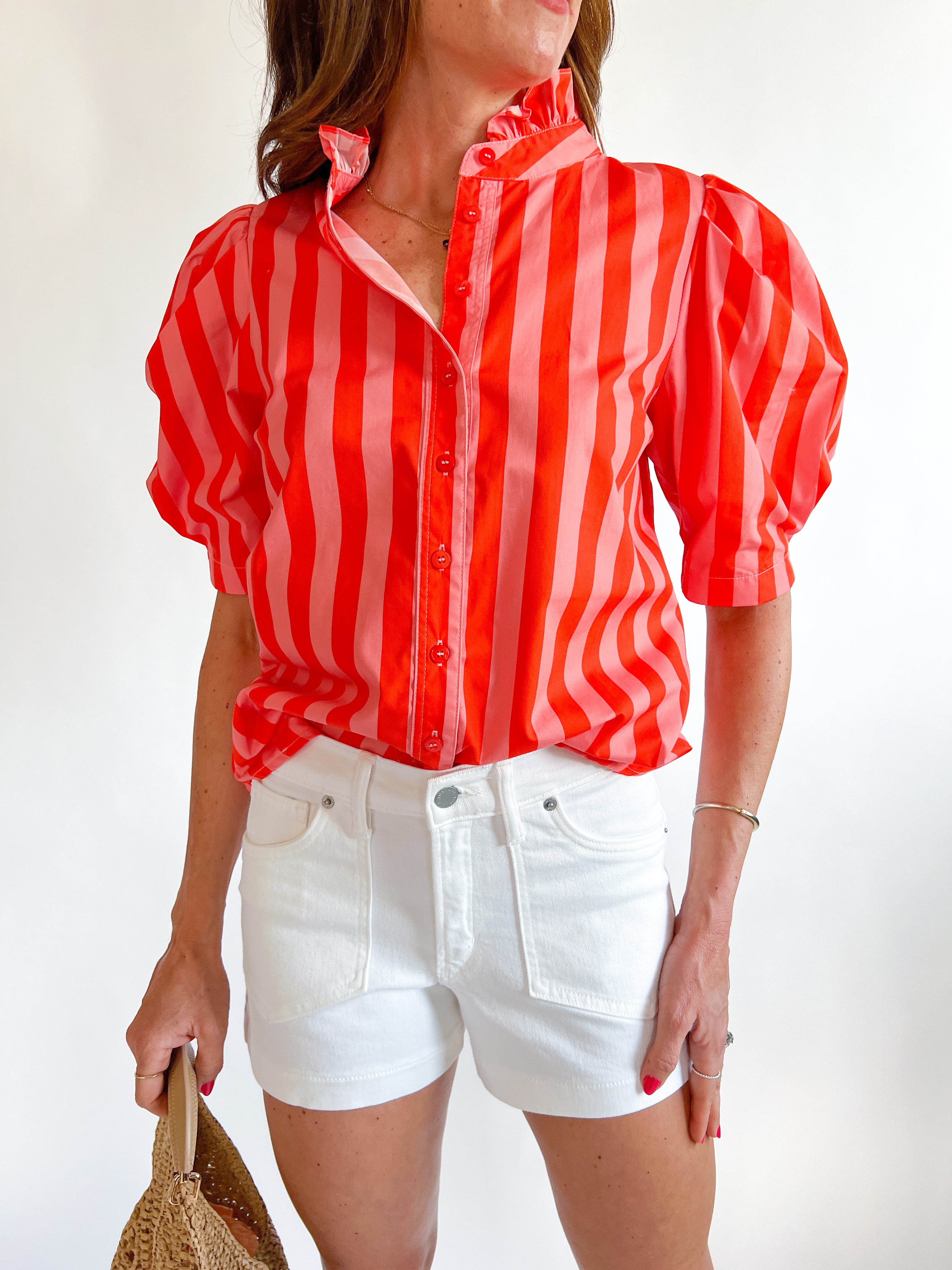Elevate your everyday wardrobe with this charming stripe button-up top. The delicate ruffle neckline adds a touch of feminine sophistication, while the classic striped pattern keeps things effortlessly versatile. Perfect for layering or wearing solo, this piece transitions seamlessly from casual weekends to polished workdays. The structured button-front design offers easy styling and comfortable all-day wear.