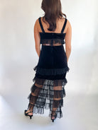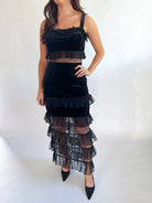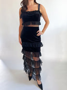 Elevate your style with our Velvet & Tulle Tiered Midi Dress. The soft velvet fabric adds a touch of luxury to the chic and feminine design. Flattering tiers and the perfect midi length make this dress versatile and comfortable for any occasion. Make a statement and stand out in this elegant piece.