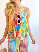 Brighten your wardrobe with the vibrant Fruit Stripe Daphne Top! This playful piece features bold, colorful stripes that instantly elevate any casual look. Perfect for spring and summer styling, the Daphne Top brings a fun, fresh energy to your everyday outfits. Whether you're heading to brunch with friends or enjoying a weekend adventure, this cheerful striped top is your go-to for making a statement. Mix and match with your favorite bottoms for endless styling possibilities!